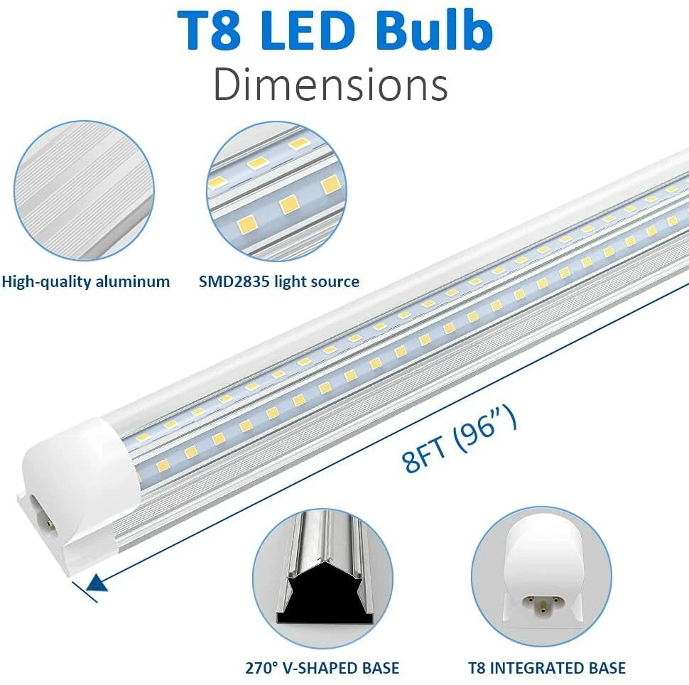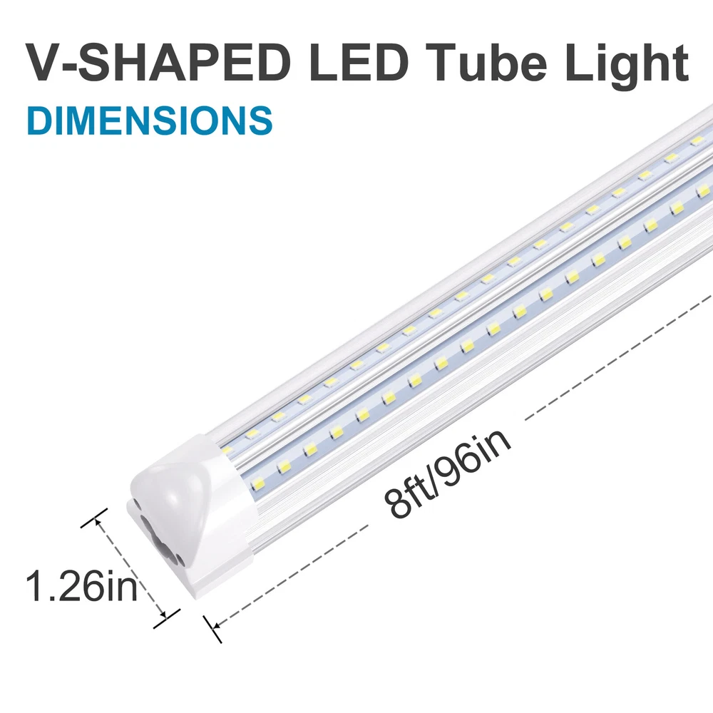 Specifications: Tube Type: T8 Integrate v shape Base LEDs: 384 X SMD 2835 Voltage: AC85-265V / 50~60Hz Power: 72W Light Color: Cool White Color Temperature: 6000K Luminous flux: 8640lm Cover: Clear Cover Materials: Aluminum Alloy + PC Item Length: 8ft Life Span: 50000 Hours Applicable:Cooler Door,Halls, warehouses, parking lots, workshops, stores, supermarkets, showrooms, etc. This LED tube will cut your electricity bill and provide you a much more environmental and better life. Easy Installation.Package Include: 8FT V-shaped Integrated LED Tube Light Specifications: Tube Type: T8 Integrate v shape Base LEDs: 384 X SMD 2835 Voltage: AC85-265V / 50~60Hz Power: 72W Light Color: Cool White Color Temperature: 6000K Luminous flux: 8640lm Cover: Clear Cover Materials: Aluminum Alloy + PC Item Length: 8ft Life Span: 50000 Hours Applicable:Cooler Door,Halls, warehouses, parking lots, workshops, stores, supermarkets, showrooms, etc. This LED tube will cut your electricity bill and provide you a much more environmental and better life. Easy Installation.Package Include: 8FT V-shaped Integrated LED Tube Light Feature: Environmentally friendly. No mercury or hazardous materials. International standard shape for T8 T10 T12 tube light. Easily fitted instead of traditional fluorescent tube lamps. High Efficient Output (90-120 Lumen Per Watt). Save 52% on electricity bill of lighting comparing with the fluorescent light. Payment Delivery details Terms of sales About us Contact us Payment 1.We only accept payment by Paypal. 2.If you pay by paypal with E-check, it normally takes 5 business days to clear, Once your E-check payment clears, your item will be dispatched within 1-2 working days. 3.Payment must be received within 7 days after the auction ended. Delivery details 1.All orders ship within 24 hours after receiving your payment. 2. Fedex shipping from our US warehouse, takes about 3-5business days for delivery. 3.Please verify your address during checkout. We are not responsible for any wrong or undeliverable addresses. Terms of sales We strive to ensure 100% satisfaction for each and every one of our customers. we offer a 30-day 100% money-back guarantee on all eBay orders. If your item isn't just as you wished, simply send it back to us and we'll refund or replace your item. Please note that all returns must be authorized by our Customer Service department. please contact us though message first if you have any problem . About us 1.Our working time is Monday to Friday. 9.30-18.30 BeiJing time am. 2.We will reply you within 24 hours(1work days). 3.We are always been trying to provide best service and reliable products for every customer. Contact us 1. If you are dissatisfied for any reason, please do not be quick to leave negative/neutral feedback. We work hard to make sure EVERY CUSTOMER 100% SATISFIED and resolve any problem for you and always leave positive feedback to all our customers. 2. If you are satisfied with the product you received,please leave us positive feedback and 5 scores DSR. Features Energy Saving, Heat Resistant, Lead-Free (RoHS), Wide Beam Connectors Integrated Manufacturer Warranty 3 years Custom Bundle Yes MPN Does Not Apply Voltage 110 V Item Length 8FT Lighting Technology LED IP Rating IP54 Labels & Certifications Energy Efficient, Energy Saving, Energy Star Lumens 8640lm Country/Region of Manufacture China Bulb Shape Tube Material Aluminum, Plastic Beam Angle 270 Degrees Model T8 8FT Color Temperature 6500K Light Color Clear White Number of Bulbs 382 LED Chip Code 2835 Finish Clear Unit Quantity 12 Lights Bulb Shape Code T8 Brand kinglight Style Modern Energy Star A+++ Indoor/Outdoor Indoor Bulb Life Hours 50,000 hrs + Output Voltage 85-277V Type Lamp Bulb EC Range A+++ - G