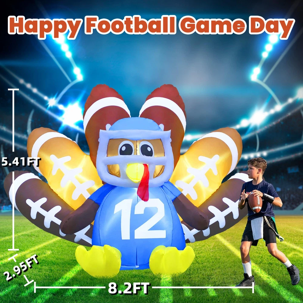 【Perfect Inflatable Turkey for Thanksgiving】 Our 6FT Football Turkey Inflatable with LED lights creates a warm, festive atmosphere at night. This Turkey No.12 decoration is sure to make your yard the highlight of Thanksgiving. 【Fast Inflation & Energy-Efficient】 Made from premium waterproof polyester, this inflatable turkey outdoor Thanksgiving decoration is built to last. The quiet, powerful fan keeps your blow-up turkey inflated with minimal energy use. 【Easy Setup & Storage】 Setting up is simple with the included UL adapter, stakes, tethers, and storage bag. The blow-up turkey comes with an extension cord for flexible placement. After the holiday, deflate, fold, and store it easily. 【Versatile Decor】 Perfect for your yard, garden, patio, lawn, or doorway, this football turkey inflatable adds festive charm to any space. It’s a great way to catch attention and bring holiday cheer. 【Exceptional Customer Support】 We’re committed to providing top-notch customer service. Our dedicated service team is here to ensure you have a smooth and enjoyable experience with your Thanksgiving inflatable outdoor decoration.