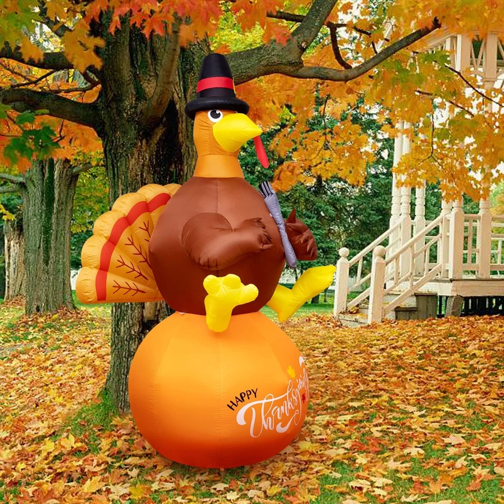Thanksgiving Inflatable Decorations 8Ft Inflatable Turkey Blow Up Turkey Built-in LED Lights Wanna add some fun to your yard for the upcoming Thanksgiving? This inflatable turkey is an ideal choice. Your and neighbor would love it! When you place this fall Thanksgiving decoration outdoors and indoors, home, yard, garden, lawn, patio, porch, party, stage, restaurants, cafes, playgrounds, etc. the large full bodied turkey will be a big hit at your thanksgiving. Specification: Material: Polyester Inflated height: 8 feet Power: Plug in Package including: 1 x inflatable turkey, 1 x adapter,2 x Clips,4 x ground stakes and 4 tethers. Caution: 1. Protect the blower and power cord from water. 2. Do not inflate during storms or strong winds. 3. Please make sure the air blower is facing up when inflating. The air blower facing the ground will affect the effect of inflating. Supersized Decor: The Thanksgiving Decorations adorable inflatable turkey stands 8 Ft tall. It will be the cute centerpiece of your Thanksgiving decoration. Easy Setup and Storage: This Thanksgivings inflatable decoration comes with a powerful built-in blower. Just plug it in and the large turkey will be self-inflating and in 90 seconds standing up to its full height. For storage simply let the air out and fold it. Excellent quality: The Thanksgiving outdoor decoration is made of thickened waterproof polyester fabric. Soft, light and firm, wear-resistant. Please make sure the air blower is facing up when inflating. The air blower facing the ground will affect the effect of inflating,Features low noise, our product only makes a little noise when operating in the room; If put in the outdoor, the noise can be neglected. Reinforced Tie-Downs: 4 Ground stakes and 4 tethers are provided for tie-down. Built-in fixed sandbag, an opening at the bottom with a zipper provides space for adding some heavy objects to make it more secure and stable. No need to worry that our Thanksgiving yard inflatables will fly away with the wind. Wide Application: When you place this fall Thanksgiving decoration outdoors and indoors, home, yard, garden, lawn, patio, porch, party, stage, restaurants, cafes, playgrounds, etc. the large full bodied turkey will be a big hit at your thanksgiving.