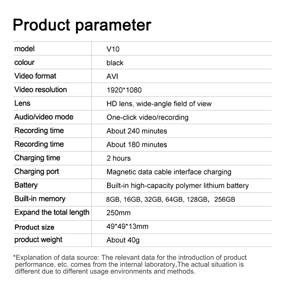 Note: It is not permitted to use a surveillance camera to record another person's privacy without their knowledge. Features: ➧ One key to record video, one key to record audio. ➧ Built-in 8GB-256GB large capacity memory. ➧ Exquisite appearance, good workmanship, good texture. ➧ HD colour screen display time/date/power. ➧ HD lens, 1080P resolution, wearable design. ➧ Supports OTG connection to mobile phone to play files and view them at any time. (OTG adapter not included). ➧ Intelligent timestamp, built-in time chip, video recording file recording time, easy to find files. ➧ Independent camera button design, when you want to capture a picture, just press it once to finish shooting, save and leave a wonderful moment easily. ➧ Comfortable to wear, excellent choice, must-have equipment for lawyers, ATV enthusiasts, journalists, traffic police, travellers and more. Specification: Product Name: Watch Camera Resolution: 1080P Video format: AVI Recording format: WAV Photo format: JPG Battery capacity: 320mAh Recording time: 180 minutes Video recording time: 120 minutes Charging time: 2 hours Standby time: 30 days 8GB memory: store about 60 minutes of video files Main features: Record video/voice recording/photography Internal memory: 8GB/32GB/64GB/128GB/256GB (optional) Strap Material: Silicone Case Material: ABS Product colour: black Product net weight: 35g Package List: 1*Camera 1*User Manual 1*USB cable Tips: Depending on the light colour may vary! Due to manual measurement, please allow a slight 1-2cm difference! Thank you for your understanding and attention, wish you have a pleasant shopping experience! On May 22, 2025 at 02:15:47 PDT, seller added the following information: