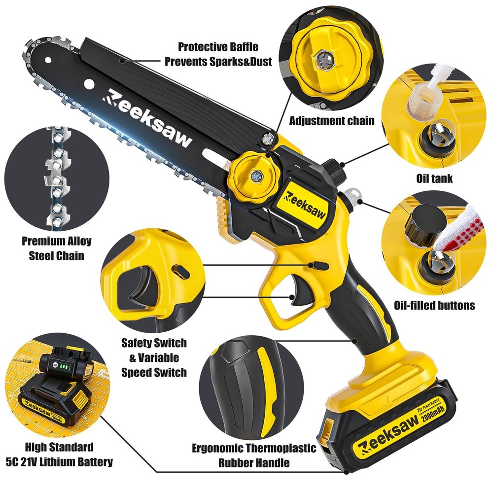 Mini Chain saw Cordless 8 inch Auto Oiler, Automatic Chain Tension, 21V MAX* Rechargeable Cordless Chainsaw with 2x2.0Ah Battery and Charger, Mini Chainsaw 8 inch Cordless Hand-Held Electric Chain Saw Brand Zeeksaw Power Source Battery Powered Horsepower 900 Watts Item Weight 2.8 Pounds Product Dimensions 15"L x 7"W x 5"H Chain Length 8 Inches Chain Speed 25.6ft/s Manufacturer Zeeksaw โ ใSelf Oiler System - 2024 ๐๐๐๐๐๐๐ใ Are you fed up with oiling the chain of your small hand chainsaw with the * extra * oil can? Our mini electric chainsaw has added a chain lubrication system to oiler the chain quickly and easily, so you don't need to carry extra oil pots, Simply pour oil into the tank and the chain will be lubricated freely for less wear and smoother cutting โ ใ TOOL-FREE CHAIN TENSIONING - 2024 ๐๐๐๐๐๐๐ใDon't need any fancy tools or expertise to replace the chain, the unique design made it easy and convenient. No tools are needed to adjust chain tension, very user-friendly and woman-friendly design. Even women and elderly people can easily control and use it and hold it for long periods of time without tiring their hands. โ SuperStar Garden Machine - The 25 ft/s super high chain speed can cut through a 6" thick branch in only 5 seconds. Support all your cutting needs. Even the tiniest girl can hold it in one hand to take a tree down like butter! โ Versatile Tool - Zeeksaw Mini portable chainsaw is perfect for deforestation, pruning, gardening, carpentry DIY, and more. It's a must-have for farm, garden, and home use. Hand Saw for Tree Cutting โ The Perfect Gift - Zeeksaw Woodwise Mini Chainsaw Cordless is the perfect Christmas gift for Father, Mother, Wife, Husband, Friends, Gardeners, DIY Lovers, and Woodworkers. Cool Dad Gifts, Fathers Day Gifts ๐ with 100% Satisfaction Guarantee - you can buy with confidence knowing that if you don't love it, we'll buy it back from you, no questions asked! This is our new upgraded 2024 version mini chainsaw, which is more powerful than the old one. It is a new type of portable electric chainsaw, which is light and easy to use. It is powered by a high-speed motor, and the chain speed is up to 5m/s, making it easy to cut wood, bamboo, tree branches, etc. This mini chainsaw is very suitable for cutting wood, tree branches, and other materials in the garden, farm, and daily life. It is also a good tool for outdoor camping, hiking, and barbecue. It is a necessary tool for home travel. Shipping We offer FREE shipping on all orders! We ship within Three business days of payment, usually sooner. We use a selection of shipping services such as UPS, FedEx, USPS etc. We only ship to the lower 48 states, no APO/FPO addresses or PO Boxes allowed. Local pickups and combined shipping options are not provided at this time. Return You can return a product for up to 30 days from the date you purchased it. Any product you return must be in the same condition you received it and in the original packaging. Please keep the receipt. Payment We accept payment by any of the following methods: PayPal Please pay as soon as possible after winning an auction, as that will allow us to post your item to you sooner! Feedback Customer satisfaction is very important to us. If you have any problem with your order, please contact us and we will do our best to make you satisfied. Contact Us If you have any queries, please contact us via ebay. We usually respond within 24 hours on weekdays. Please visit our eBay store to check out other items for sale! Thank you for shopping at our store.