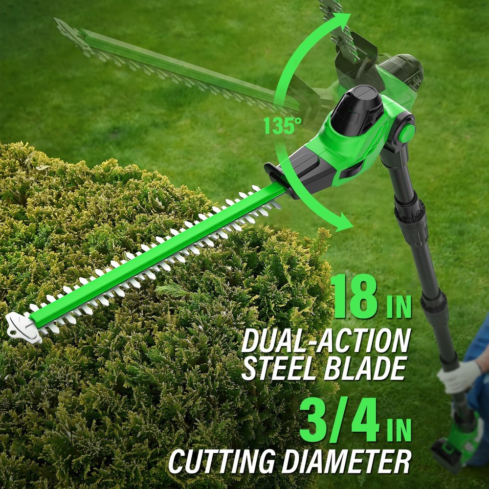 This cordless pole saw and hedge trimmer combo is a game-changer for yard work! The 2-in-1 design makes trimming trees and hedges effortless, while the 15-foot reach handles high branches with ease. I love the auto-oiling feature and adjustable angles—no more awkward positions or messy maintenance. The 16ft/s cutting speed powers through thick branches, and the lightweight design reduces fatigue. The included battery lasts surprisingly long, making it perfect for big jobs. Super convenient and powerful—highly recommend for anyone tackling overgrown yards!