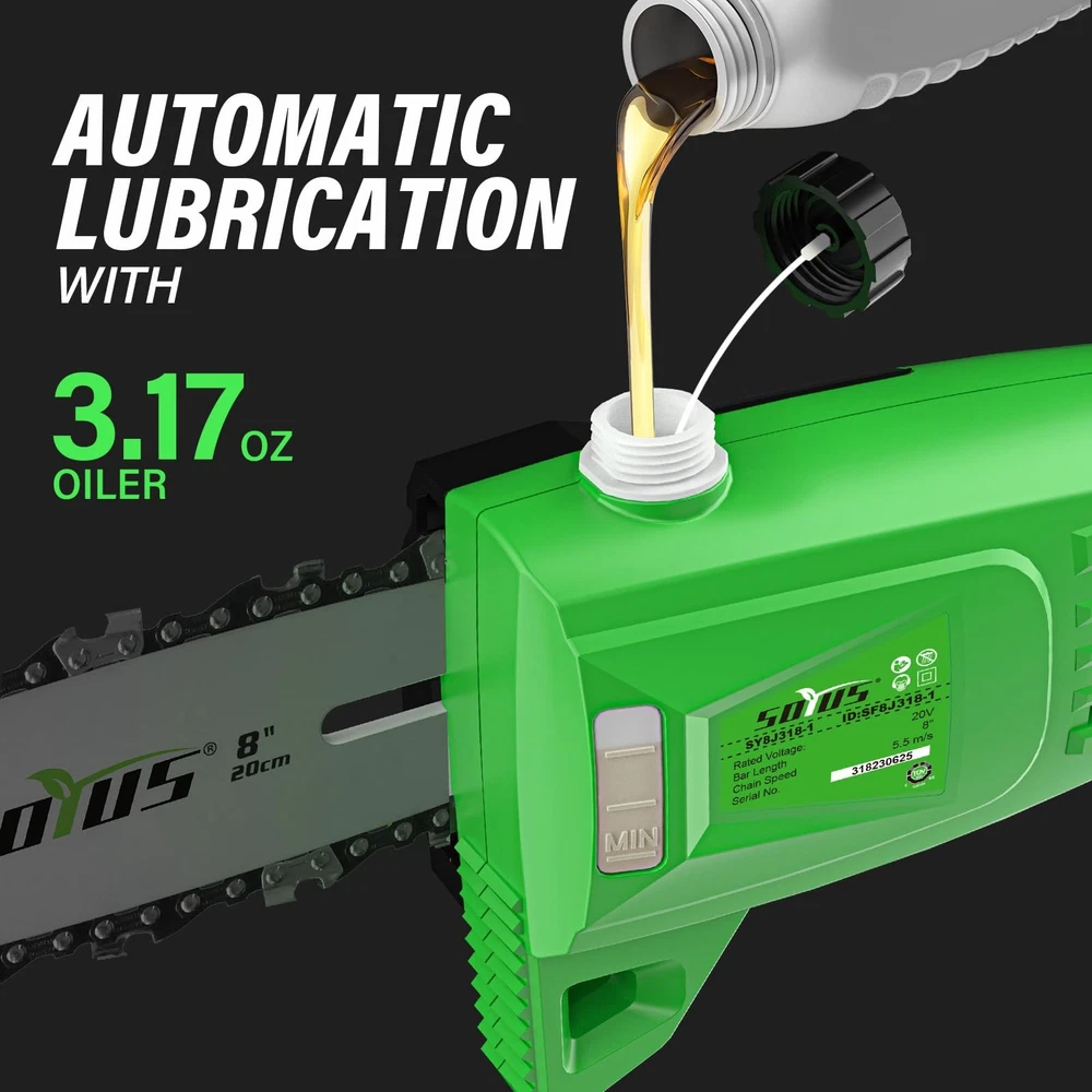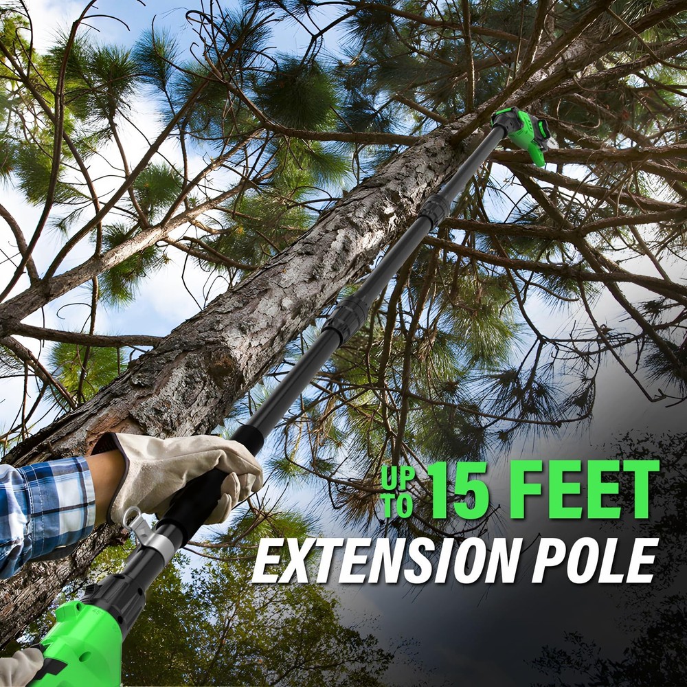 Cordless Pole Saw 8-Inch, 2-in-1 Pole Hedge Trimmer 18-Inch, 15-Foot Max Reach Pole Saw for Tree Trimming, 16ft/s Speed, Auto Oiling, Multi-Angle Pole Chainsaw with 2.0Ah Battery & Charger 2-IN-1 POLE SAW & HEDGE TRIMMER - The newly designed 2-in-1 pole saw with saw head attachment and hedge trimmer attachment is able to fully satisfy all your branch pruning needs. For the convenience of customers, we added a section of the extension tube, which is convenient for customers to prune tree branches. It does not depend on unstable ladders, making the work of pruning branches easy. UP TO 15 FEET EXTENDED HEIGHT - When you encounter hard-to-reach branches but don't want to risk climbing a ladder for safety reasons, you deserve to have this cordless pole saw. With an extension pole from 9.4 feet to 10.4 feet, you can reach heights of up to 15 feet (based on a 5.4-foot person holding the pole in an extended position at shoulder level). And there are 3 adjustable angles that allow you to easily trim branches in different locations. AUTOMATIC OILING & TOOL-FREE TENSIONING - pole saw is equipped with automatic oiling system to keep the chain running perfectly at 16FT/S, which greatly extends the service life of the high branch saw. Meanwhile, equipped with tool-free tensioning chain system, you can adjust the chain loosely and freely. Therefore, every time you use it, it can help you cut more efficiently and faster. SAFETY PROTECTION DESIGN - This pole saw incorporates a safety protection system that can only be activated when the safety lock and trigger are pressed, thus preventing the operator from accidental injury. Meanwhile, the new battery pack is equipped with an advanced battery management system, which can make the use safer. PACKAGING & WARRANTY - guarantees 12-month product warranty. If you have any problems with the product, please feel free to contact us. What you get:1 x cordless pole saPw, 1 x hedge trimmer attachment, 1 x 20v 2.0Ah battery pack, 1 x fast charger, 1 x shoulder strap, 1 x extension tube, 1 x manual.