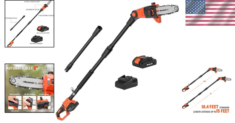 This cordless pole saw is a game-changer for tree trimming! The 8-inch steel blade cuts effortlessly, and the auto-oiling system keeps everything running smoothly. The adjustable height (up to 15 feet) and three-angle positions make reaching high branches a breeze—no ladder needed. Lightweight yet powerful, it’s perfect for quick cleanups or heavy-duty pruning. The battery life is impressive, and the extension tube adds extra convenience. Highly recommend for hassle-free yard work!
