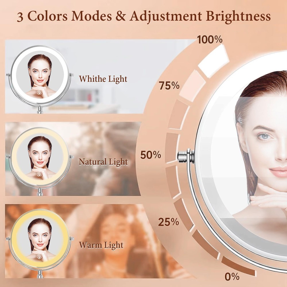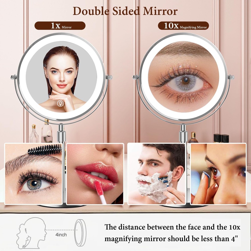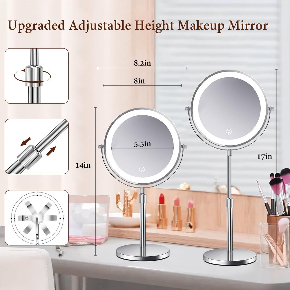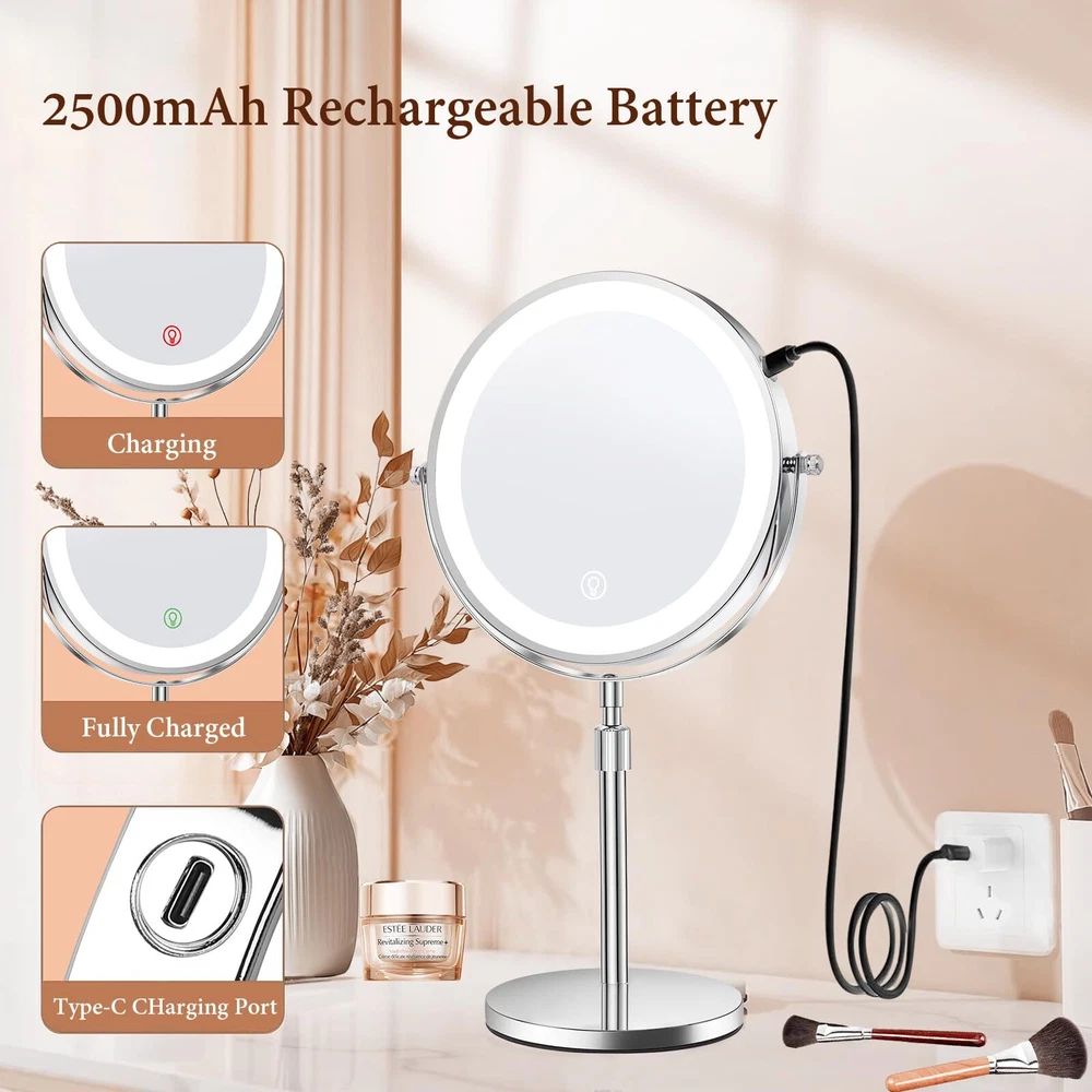 8 Inch Lighted Makeup Mirror with Magnification 1x/10x Magnifying Mirror with 3 Color Light 2500mAh Rechargeable Height Adjustable 360° Rotation Double Sided LED Vanity Mirror for Desk Upgraded Adjustable Height Light Up Mirror: Height adjustable makeup mirror, you can find the comfortable height you need, conform to any makeup table height, and do not have to bend over. The make up mirror with lighting is suitable for tables of all sizes. Convenient for people at different heights. Ideal for family use. Dual-Sided Mirror with 1X and 10X Magnification: Our makeup mirror features a classic design with a 1X mirror for everyday makeup application and a 10X magnification side for precision tasks like eyebrow threading, contact lens insertion, detailed shaving, and precise mascara application. It’s perfect for both your daily routine and those moments when extra care is needed. One-Touch Control for Custom Lighting: With a simple touch, switch between three different light colors and adjust the brightness to suit your environment. Short press the sensor switch to change the light’s 3 colors, long press to adjust the brightness. The smart memory function recalls your last brightness setting, ensuring consistency with each use. It’s the ideal lighting solution for your vanity, no matter the time of day. Full Charge in 4-5 Hours for Wireless Use: Enjoy up to 4-5 hours of wireless use on a single charge with the built-in 2500 mAh battery. The lighted mirror is 30% brighter than traditional power sources, and you can recharge it easily with any USB port, whether from a laptop, power bank, or wall charger. Large 8-Inch Mirror for Versatile Use: Our large 8-inch lighted mirror offers a wide-angle, high-definition view, ensuring you never miss a detail. The non-slip padding keeps the mirror stable on any surface. Additionally, the mirror detaches easily for travel. Use it as a professional vanity mirror at home, in the bathroom, hotel, spa, or beauty salon. It also doubles as a desk lamp, night light, or ambient lighting, making it a versatile and elegant addition to any setting, as well as a luxurious gift.