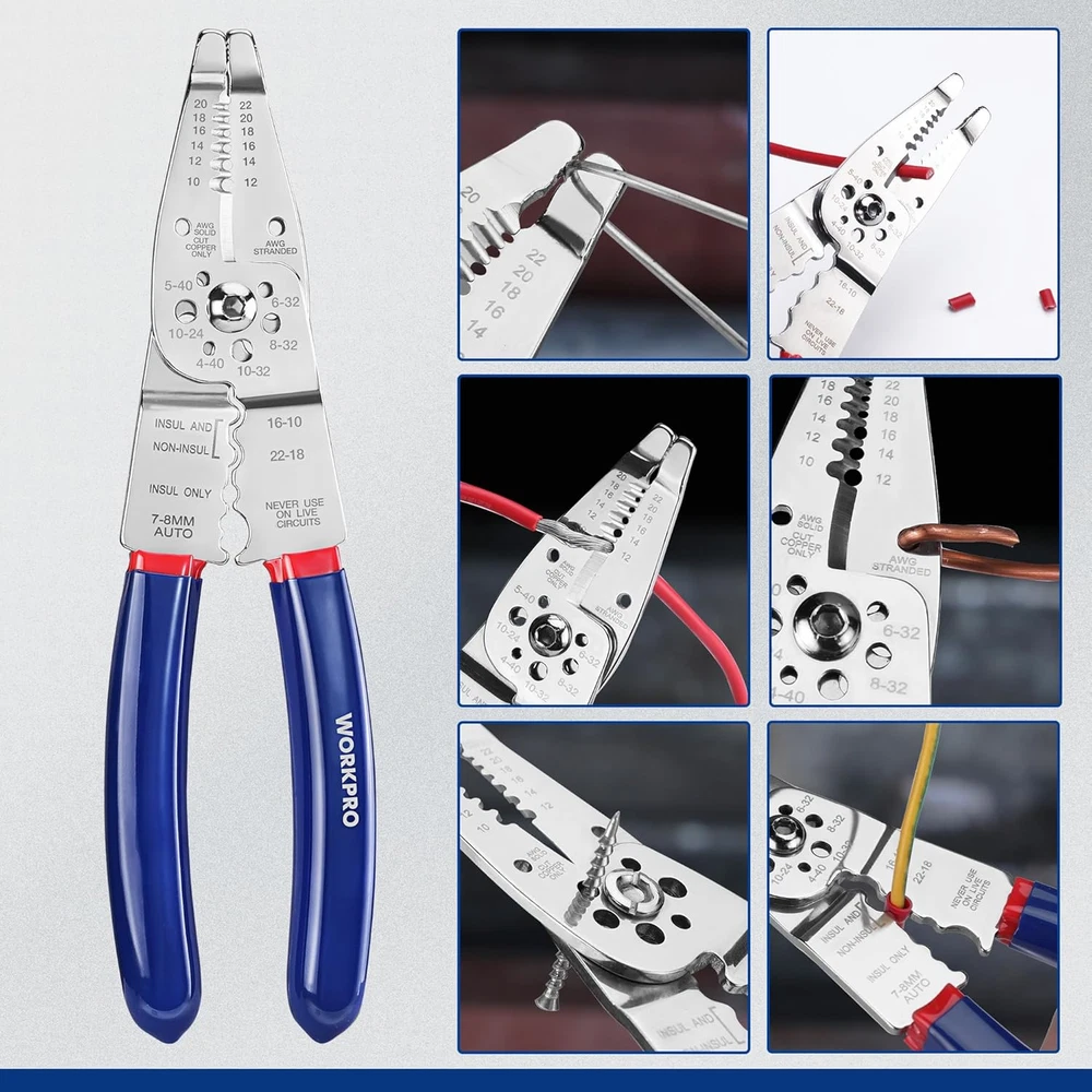 All-in-One Tool: Versatile wire stripper for both insulated and non-insulated terminals. Performs multiple functions including wire stripping, looping, crimping, cutting, splitting, and clamping Stripping Capacity: Efficiently strips and crimps wires ranging from 10-22 AWG, making it suitable for a wide variety of tasks High-Quality Construction: This 8-inch wire stripper is made from high-grade stainless steel, ensuring durability and rust resistance. It undergoes overall heat treatment, achieving an HRC hardness of 56-58 for enhanced strength Ergonomic Design: Features a curved, non-slip handle for a comfortable and secure grip, reducing hand fatigue during extended use Wide Range of Applications: Ideal for industrial, electrician, and household projects. Suitable for handling copper, aluminum, sheathed core wires, cables, multiple sheathed wires, and bare terminals Product Description Wire Crimping Tools & Pliers Wire Stripper WORKPRO CUTTER 8" Length 8" Stainless Steel Material Stainless Steel Ergonomic Grip Stripper Cutter Crimper 8" Length 9.5" Stainless Steel Material 55-65 HRC steel Ergonomic Grip Stripper Cutter Crimper Wire Stripper Wire Crimper