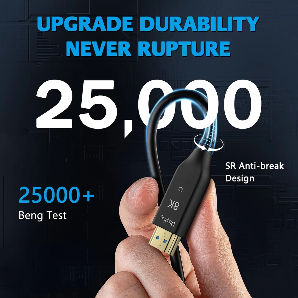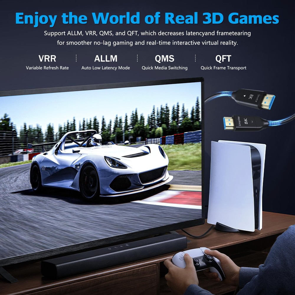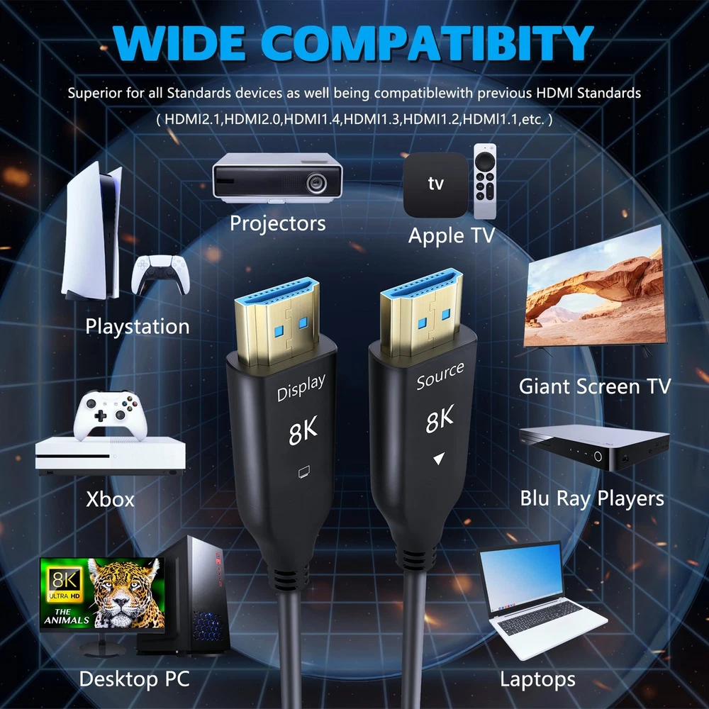 Meets the latest 8K HDMI 2.1 specification (8K @ 60fps, 4K @ 120fps & up to 10K resolution, Dynamic HDR10, eARC, HDCP 2.2 & 2.3, ALLM, QFT, QMS, VRR), backwards compatible with previous versions. For 8K video output, both your source and display devices must support 8K resoluresoluresolution. 8K Fiber Optic HDMI Cable:The 8K fiber optic HDMI cable support long distance at 8K@60Hz, 4K@60Hz/120Hz & up to 10K resolution. No signal loss. Compatible with Dolby Atmos, Dolby Vision, HDCP 2.2 & 2.3, DTS:X, Dynamic HDR, BT.2020, eARC, ALLM, QFT, QMS, VRR. 2.1 HDMI cord 48Gbps offers an immersive multi-dimensional experience and enhances audio detail depth. Safe & Flexbile & Durable:CL3 fire rating for in-wall use,the Fiber Optic HDMI cables are slim,lightweight and flexible, easy to install in house wiring.The plug part is made of 24K gold-plated material, which accurately transmits signals.PVC shell enhance the wear resistance,More softer and flexible than other. Active chipset inside the cable boosts the signal to ensure uncompressed transmission. Widely Compatibility:Compatible with PS5, PS4 Pro, PS3, Roku, Nin tendo Sw itch, Xbox 360, Xbox one X/S, Laptop, PC,NVIDIA SHIELD TV,App le TV,Sony ,Samsung,LG Oled TV,Blu-ray player, AV Receiver, TV Box, Projector, Monitor and more. Long-Distance Signal Integrity:Unlike traditional copper cables, our 8K Fiber Optic HDMI Cable maintains signal integrity over long distances. Whether you need to connect your devices across a large room or even between different floors, you can trust that the signal will remain strong and stable. Enjoy uninterrupted 8K quality, no matter the distance. One-way Transmission: Cable with SOURCE connectors for connecting HDMI source devices (laptops, Blu-ray players, set-top boxes, etc.). With display connector for connecting HDMI display devices (HDTV, projector, monitors, etc.) Customer Service: Regarding 8K Fiber Optic HDMI 2.1 cable issues or other issues, we will assist you in resolving them within 24 hours.