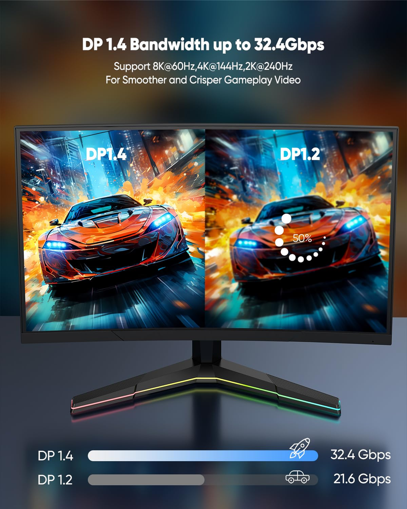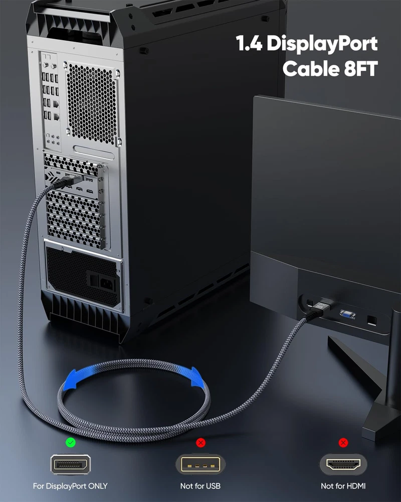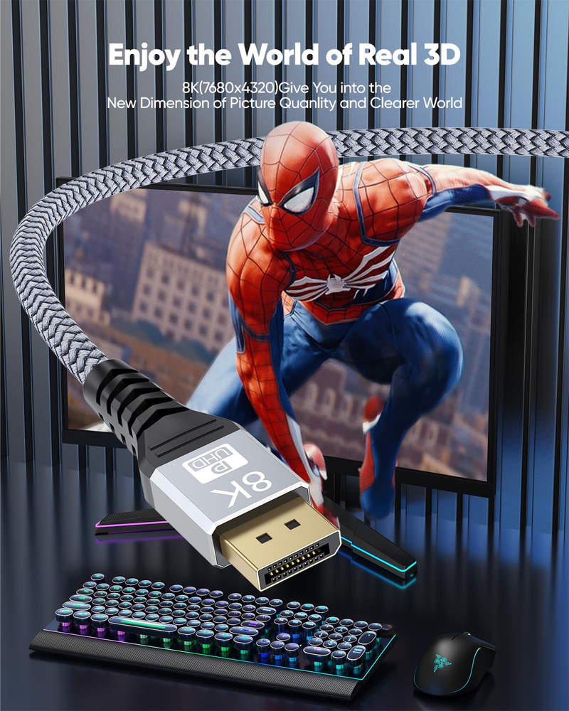 Store New Arrivals Add to Favorite View Feedback 8K Displayport Cable 8FT DP Cable, Display Port to Display Port 1.4 Cable 8 Feet (8K@60Hz, 4K@144Hz, 2K@240Hz, 32.4Gbps, Dynamic HDR, 3D, HDCP2.2) for Monitor, Graphics Card, PC, Laptop Description Item model number 8F-DK Brand UVOOI Cable Type Display Port Country of Origin China Connector Type DisplayPort Compatible Devices Laptop, Monitor, Graphics Card, Personal Computer Special Feature Braided, High Speed, Data Transfer, Tangle Free Package Dimensions 11.38 x 9.65 x 0.83 inches; 4.66 ounces Manufacturer UVOOI 【8FT Perfect Length】8K DisplayPort Cable 8ft, Specifically designed for lengths between 6ft and 10ft to meet the needs of mid-distance 8ft monitor connections.The latest upgraded displayport 1.4 technology ensures the most stable video and audio signals. 【Ultra HD 8K@60Hz】Display Port to Display Port Cable supports highest resolution 8K@60Hz (7680x4320), 4K@144Hz/120Hz/60Hz (3840x2160), 1440P 2K@240Hz/144Hz/120Hz/60Hz(2560×1440), 1080P@240Hz Full HD. This 8K dp cable Great for your high resolution and high refresh rate monitors to maximize the performance of your graphics card and monitor. 【Super Performance Experience】Ultra High Speed 8K DP to DP Cable Support 32.4Gbps high bandwidth, Display Stream Compression(DSC), HDCP 2.2, flawless audio pass-thru for uncompressed digital audio channels at 7.1, 5.1 and 2.0. Dynamic HDR and 3D makes your enjoyment of video more realistic! It also works fully with FreeSync and G-Syn, connects directly to displayPort-equipped gaming monitors and graphics cards, delivering high-quality video and audio signals without latency or interference. 【Advanced Material】This 8 feet display port cable are constructed of 30AWG pure copper and triple shielded to resist electromagnetic interference, effectively eliminating black or flickering screens. The rugged aluminium alloy housing and 24K gold-plated ports prevent rust and enhance heat dissipation, while the durable nylon braided jacket lasts ten times longer than PVC, making it the perfect choice for secure, high-quality signal transmission and long-lasting use. 【Wide Compatibility】Plug and play. display port 1.4 cable works perfectly with all graphics cards and monitors with Displayport ports, compatible with Laptop, Odyssey G8 G9 CHG90 CRG9, Ben Q, iiyama, Alienware monitors, PCs, and is also compatible with Geforce GTX 4090/3090/3080, Radeon R9 290, AMD Radeon RX 6800 XT/RX 7900 XT and other popular graphics cards to work with, and supports DP, DP++, DisplayPort++. 【Long-term Warranty】UVOOI provide 2-year warranty for 8k displayport cable 8 feet. If you have any questions, please feel free to contact us. Product Description 1 240Hz High Refresh Rate 2 Real-Time HDR 1 For Gaming 2 For Work 3 Three Modes ABOUT US We offer the best prices around on high quality products. Our E-store includes media such as books, movies, music and games while offering electronics, toys, sporting apparel, clothing, tools, general home, garden items and more. SHIPPING We are always working hard to ensure your package arrives as soon as possible. Please understand that some factors like weather, high postal traffic, and the performance of shipping companies are outside of our control. We offer free shipping to the lower 48 states and ship within 2 business days of payment, usually sooner. We do not accept P.O. Boxes. Please provide a physical address. RETURNS We offer a 30-Day Return Policy on items which you are not completely satisfied with. You have the option for a full-refund or an exchange of the item. No returns are available on items shipped outside of the USA. PAYMENT We accept PayPal. CONTACT US This page content is yet to come Please ad us to your favorite seller and visit again later Thank You