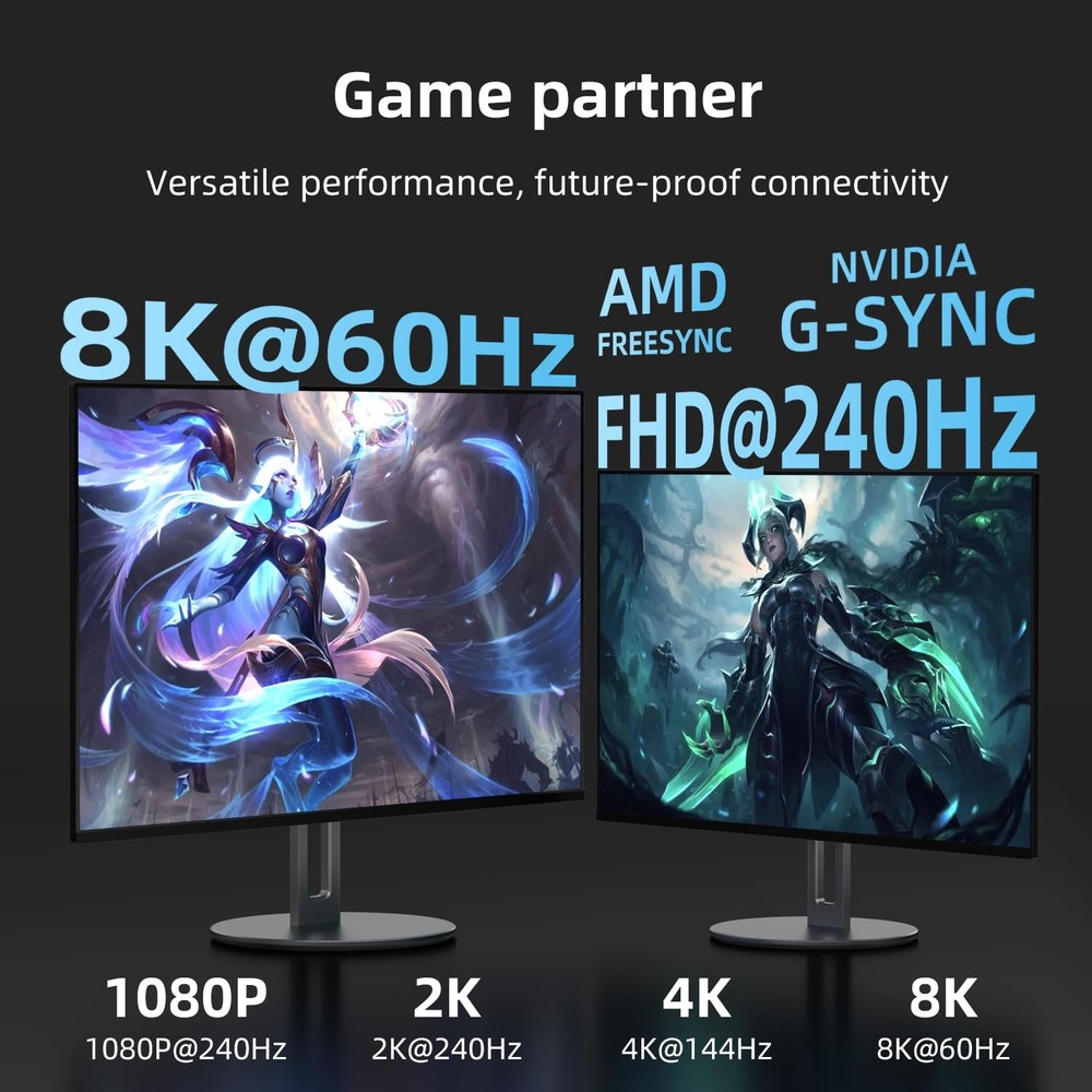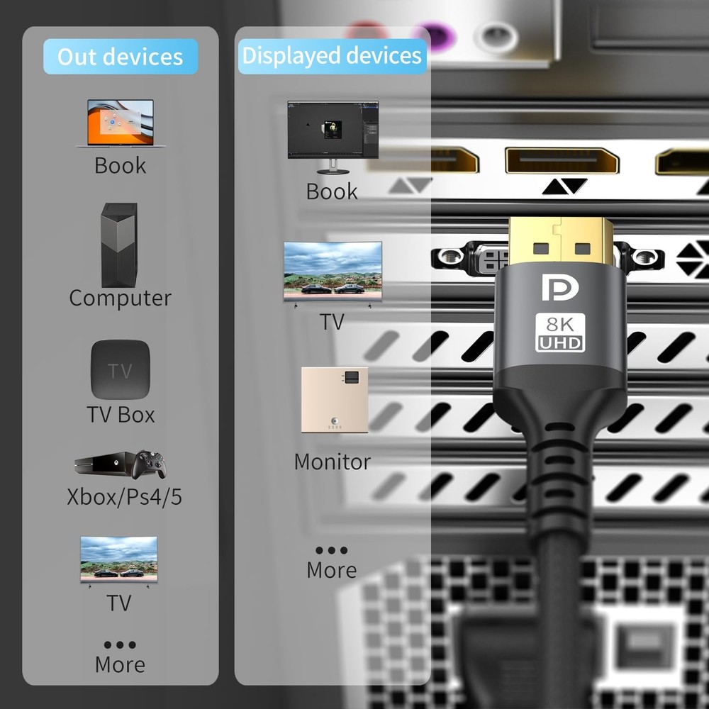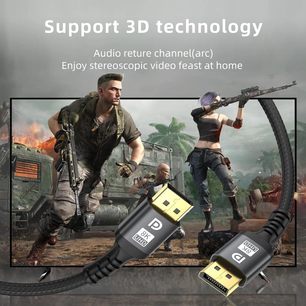 8K Displayport Cable 20ft 1.4 Cable - High speed DisplayPort [8K60Hz, 4K144Hz, 2K240Hz] Supports 32.4Gbps ,and is used for HDR, FreeSync G-Sync, Gaming Monitor PC TV Graphics [8K DisplayPort Cable 1.4]8K Displayport cable 1.4 supports high resolution 8K (7680x320) @60Hz, 4K @60Hz/120Hz/144Hz, 2K @240Hz,8K DP cable supports 3D stereo imaging technology as well as dynamic HDR and HDCP 2.2. It is downward compatible with DisplayPort 1.3/1.2/1.1. It supports transmission speeds of up to 32.4G. [Thoughtful Design & Interference Protection]This 20 foot DP cable features a non locking design, allowing you to avoid damage to your device when unplugging your monitor or graphics card. This Displayport cable has three layers of shielding to ensure stable transmission. No need to worry about ghosting and audio/video synchronization issues. The double nylon weaving material and 24K gold-plated joint enhance durability and heat dissipation performance, while also possessing waterproof and high temperature resistance, greatly extending its service life. [Gamer Experience] Our Display Port Cable 4K144Hz , 2K240Hz The high refresh rate makes enemy tracking incredibly clear. Dynamic HDR optimizes low light scenes, enhances visual details, and makes images richer and more realistic, especially in FPS 3A masterpieces and MOBA games. [Broad compatibility]This DisplayPort cable can be directly connected to the desktop/laptop equipped with DisplayPort to the monitor. And it is compatible with Dell HP, Acer, and Alienware monitors, iiYama, Odyssey G7 G8 G9 and other graphics cards can be perfectly matched.It is suitable for graphics cards and monitors with DisplayPort interface. [High quality and after-sales service]Each 8K DisplayPort cable undergoes strict performance and durability tests before shipment. It also comes with a team to provide support, ensuring any pre-purchase or post-purchase issues can be resolved within 24 hours, guaranteeing a worry-free experience