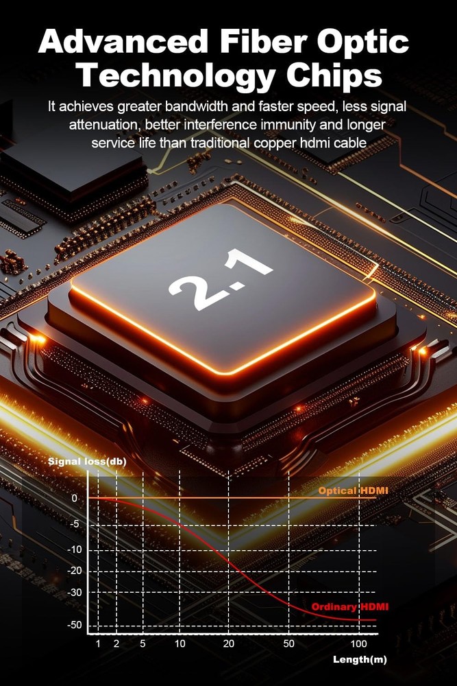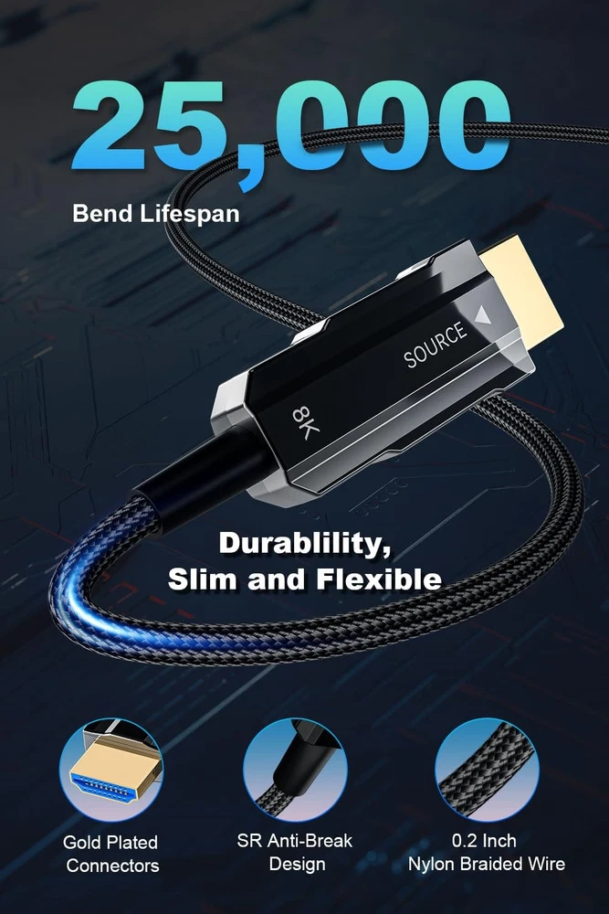 8K Long HDMI 2.1 Cable 66ft, Fiber Optic Braided Cord, High 66ft/20m Product Details Package Dimensions : 8.9 x 8.82 x 2.04 inches; 1.33 Pounds Manufacturer : AST Brand: RUBMUD Connector Type: HDMI Cable Type: HDMI Compatible Devices: DVD Player, Gaming Console, Laptop, Monitor, Projector Special Feature: Braided, Data Transfer, High Speed 8K Fiber HDMI 2.1 Cable -- HDMI cable 66ft supports High-speed 48Gbps, 8K@60Hz, 4K@120Hz, 2K@240Hz, Dynamic HDR, Dolby Vision, Dolby Atmos, HDCP 2.2&2.3, 3D, 32 Audio Channels, 4:4:4 RGB, ALLM, QFT, QMS, VRR, DSC etc. Backward compatible with version 2.0 / 1.4 / 1.2 / 1.1. Slim & Flexible Fiber HDMI Cable -- Compared with traditional copper core cables, they have a greater bandwidth, faster speed, less signal attenuation, greater resistance to electromagnetic interference, are slimmer and more flexible, have a stronger bending strength, and a longer service life, which is the development direction of future cables. Long Distance Lossless Transmission -- Fiber optic hdmi cable can achieve lossless transmission, the longest transmission distance of up to 300m. Copper hdmi cord can't reach 18Gbps for more than 50 feet, while fiber hdmi cables can reach and without signal loss. Unidirectional Transmission -- Fiber optic hdmi cable is one-directional transmission. The plugs at each end are marked "SOURCE" and "DISPLAY". The "SOURCE" plug connects signal source devices such as TV Box, PS5, PS4, PS3, Blu-ray Players, Xbox Series, Laptop etc. The "DISPLAY" plug connects display end devices such as TV, Displays, Projector, Moniter etc. Please make sure you plug in each end correctly, you will not get signal from the device. High Quality HDMI Braided Cord-- The long hdmi cable feature gold-plated connectors to prevent oxidation and are protected by a zinc alloy housing. Nylon braided sheath and curved tail design, can withstand up to 25,000 bends, greatly extended use life. Superior Gaming Experience -- Compared to 4K hdmi cable, 8K hdmi cable deliver HD audio and the highest audio quality. It also support variable refresh rate (VRR), which solves the problem of freezing and tearing of the picture for smoother gaming. Compatible with HDMI Devices -- For set-top boxes, video games (ps3/ps4/ps5), blu-ray dvd players, xbox series, uhd tv, 4k hdtv, digital audio, various inch monitors, computer, projector, av receiver and other hdmi-enabled device. Easy to Use -- Plug and play, no extra power supply. High speed hdmi cable can be used in a variety of applications such as home theater systems, gaming consoles, audio equipment, as well as conference rooms and commercial venues.