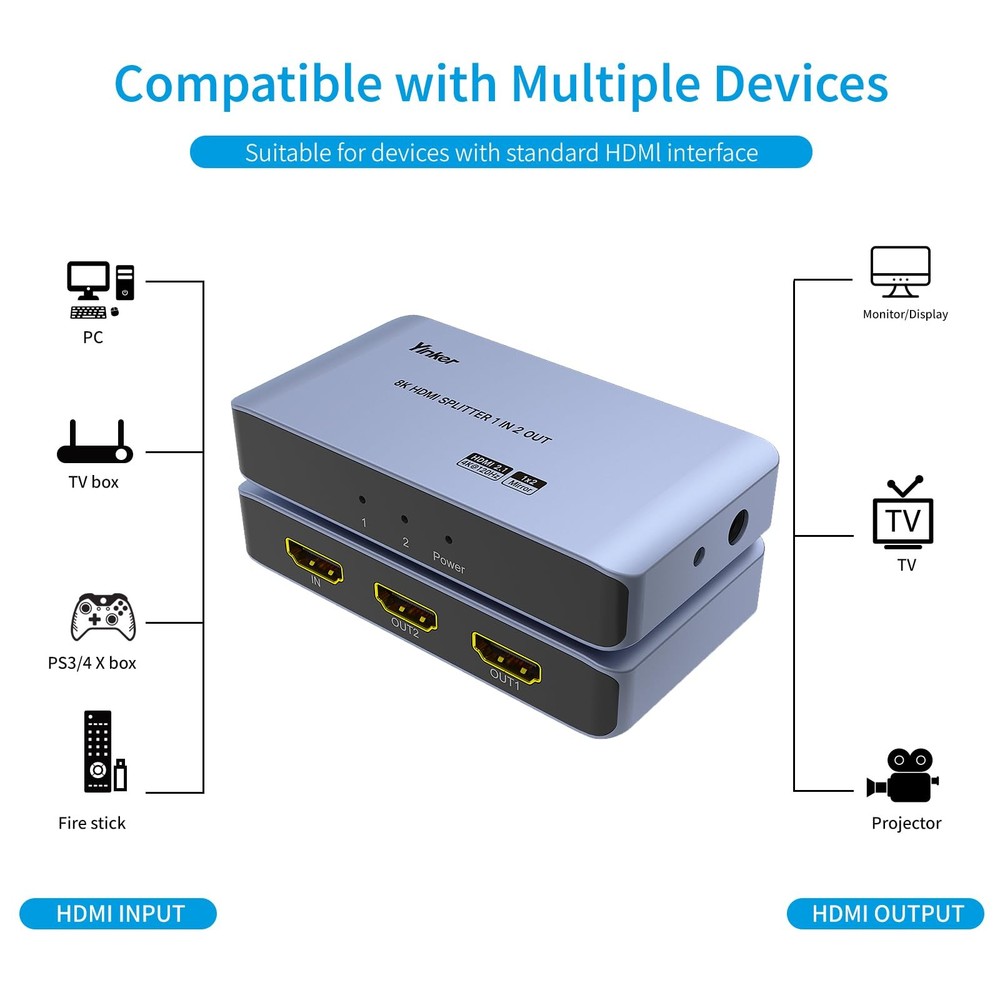 8K HDMI Splitter 1 in 2 Out, 8K@60Hz 4K@120Hz HDMI Splitter 1x2 for Duplicate/Mirror Only, Support EDID, HDCP2.3 8K@60Hz HDMI Splitter 1 in 2 out, this device allows to duplicate/mirror one HDMI source on 2 HD monitors, TVs, projectors simultaneously at 8K@60Hz/ 4K@120Hz. This 8K HDMI Splitter is available to cascade connection to more than 2 target monitors. Please noted that it only supports mirror, can not extend into different displays. This 1x2 HDMI Splitter supports max to 8K@60Hz(4:4:4), downscale to 4K@120Hz which is perfect for game console. EDID, DTS-HD, Dolby-trueHD, DTS, Dolby-AC3, VRR., DSD etc.are supported. The HDMI 2.1 Splitter is widely compatible with most of the operating system like Windows, Mac OS, Linux.Works with PS4, Roku, Fire TV, Blu-ray players, PS4 Pro, PS3, Beamer, etc. Package content: 8K HDMI Splitter x1, Power Adapter x1, User Manual x1.