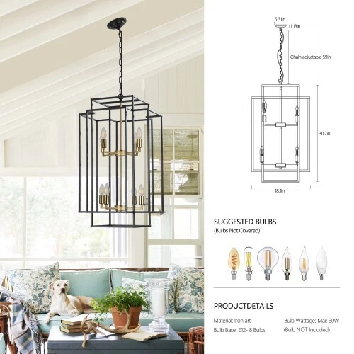 Description Perfect Design Style: This foyer chandelier has a black geometric frame and a black central lamp base. It is the perfect complement to the lamps in your home. This kitchen island chandelier is the perfect choice for you! More and more customers are picking this fixture for better comfort and to meet the new popular styles. It is suitable for all decoration styles. this foyer chandeliers for high ceilings No assembly required.Adjustable Boom & Multi-Scene Applications: The foyer lighting fixtures length of the boom is 60 inches/150 cm. Consists of removable metal rods that allow you to easily adjust the height. foyer chandelier for: living room, room, Hallway, dining room, kitchen island, farmhouse, foyer. Features Adjustable Boom & Multi-Scene Applications: The foyer lighting fixtures length of the boom is 60 inches/150 cm. Consists of removable metal rods that allow you to easily adjust the height. Durable Metal Frame: This kitchen island pendant light adds protection to the bulb with a high quality black matte metal frame and heat resistant black pendant base. E12 Bulbs & Compatible Information: foyer pendant light comes with 8 x E12 lamp holder, Applicable to any E12 bulb, such as LED/CFL, incandescent or fluorescent (Bulb not included). Consists of removable metal rods that allow you to easily adjust the height. foyer chandelier for: living room, room, Hallway, dining room, kitchen island, farmhouse, foyer.
