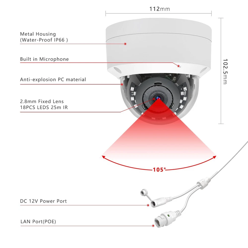【4K 8MP ULTRA HD+POE+2.8MM LENS】This PoE ip dome camera has equipped with 8Megapixel (3840x2160) Ultra high definition and 2.8mm lens, which can provides you a more clear image than 5mp/6mp/full HD 1080p cameras. With PoE (Power over Ethernet) function, you can use a single Ethernet cable to transmit both data and power, and no need power adapter( PoE switch/PoE Injector required, not included). 【H.265/H.264 AND COMPATIBLE WITH NVRs】This 4k 8mp ip network PoE camera supports H.265/H.264 dual compression(Default H.265) and compatible with multiple 4K H.265/H.264 PoE NVRs and compatible with QNAP, NAS, FTP, Blue Iris and Ispy; Plug&play with Hikvision,LTS, EZVIZ, Dahua, Uniview, TVT and Raysharp NVRs after DHCP enable.(Default DHCP enable). SDK for our IP cameras could be provided for profesional customers. 【IP66+VANDAL PROOF+80FT NIGHT VISION】This 4k 8mp PoE ip security camera has designed with microphone, the case of camera is made of metal, special design with IP66 waterproof level and is very convenient for installation. Besides, this camera adopts IR LEDs providing excellent night-vision up to 80 ft. 【HUMAN AND MOTION DETECTION】The 4k 8mp vandal dome ip camera support human motion detection, when the camera detects person, they will be marked in square, and this camera can provides 105°wide viewing angle for more information. 【AFTER SALES SERVICE】We provide 1 year warranty for this 4k 8mp ip PoE camera, and if you have any problem about our vandal dome security ip camera, please contact us or leave your question for us.