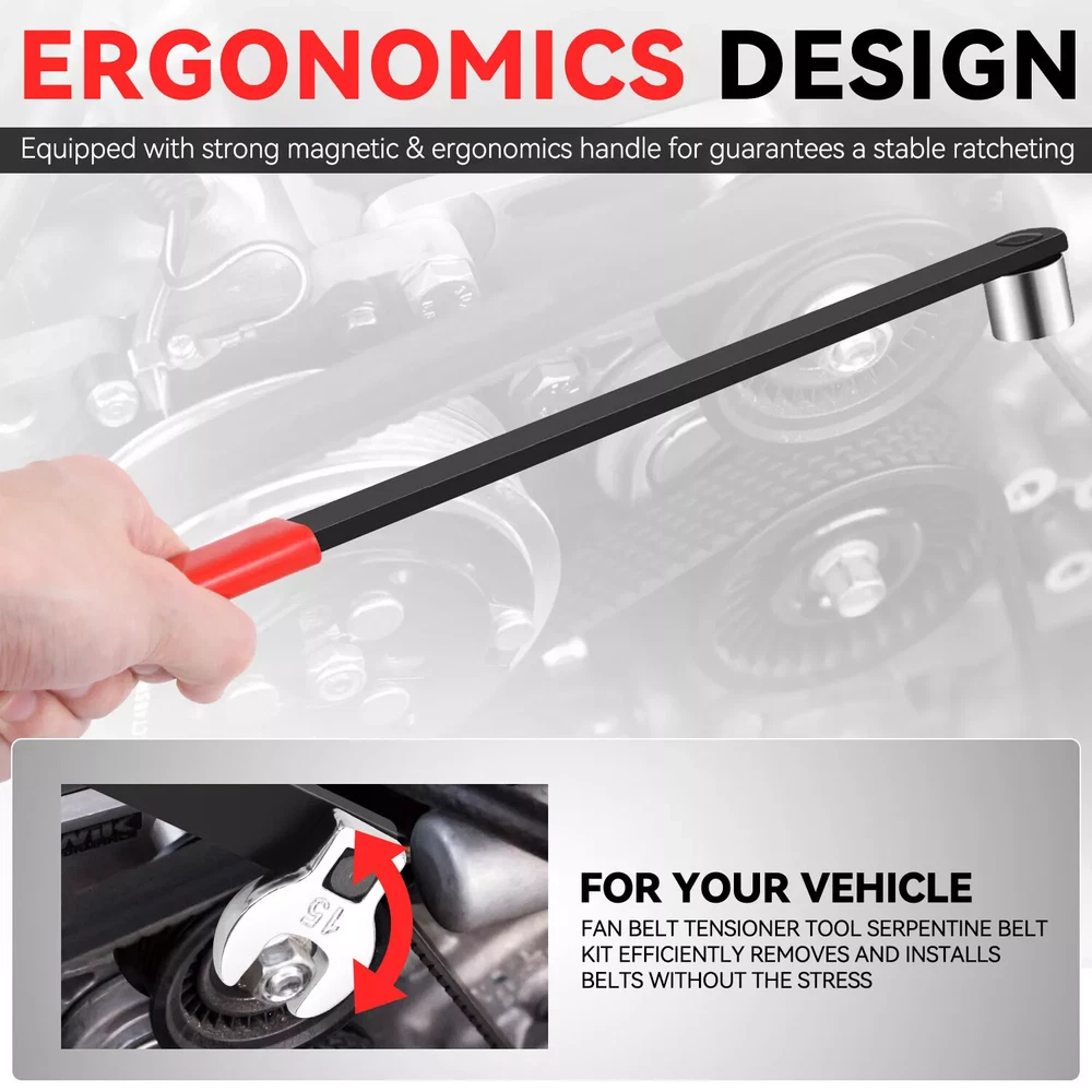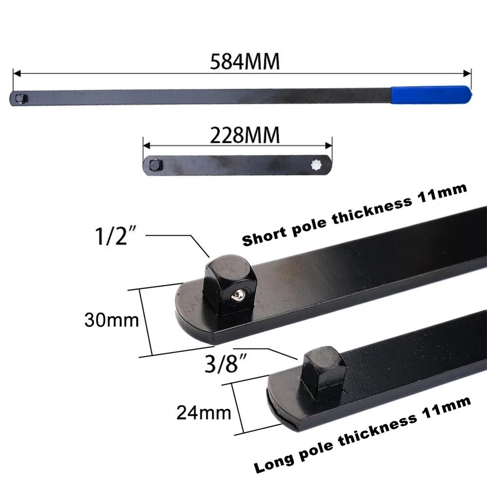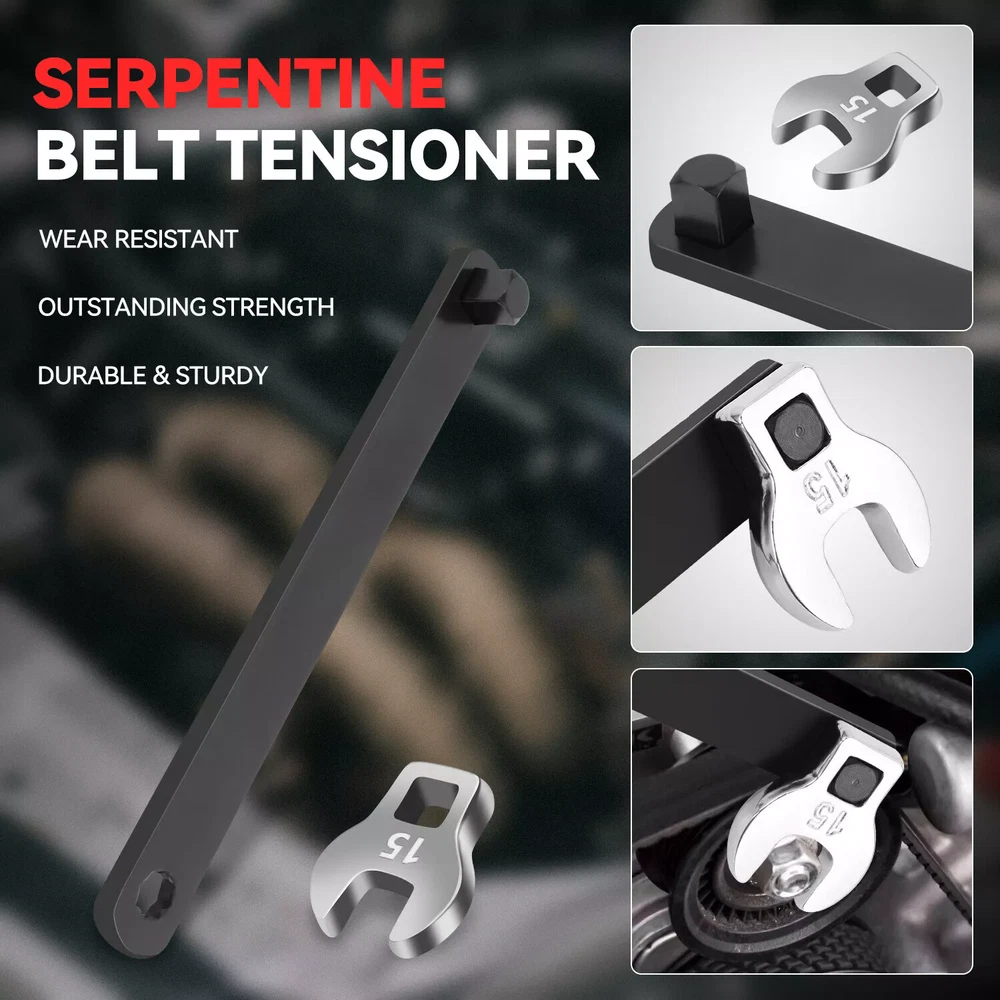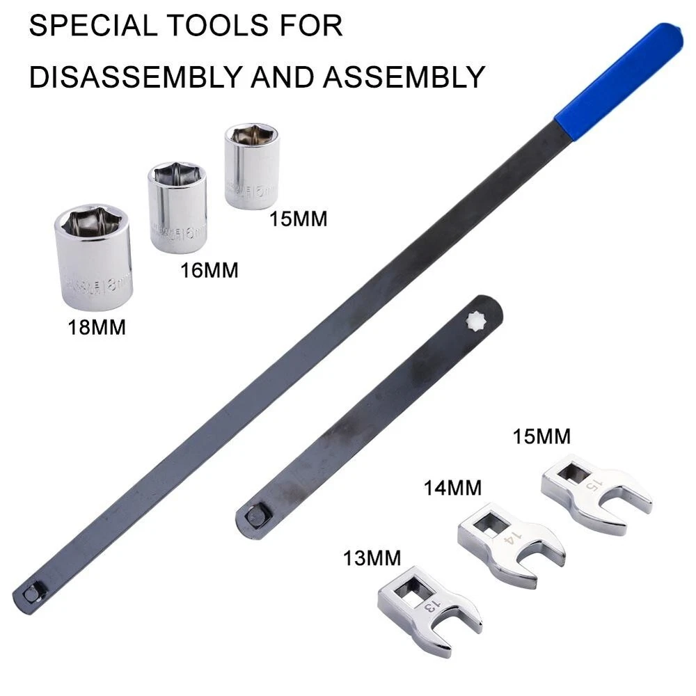 8pcs Serpentine Belt Tension Setting Wrench Tool 1/2" 3/8" Square 13/14/15mm Crowfoot 15/16/18mm Socket 【Description】 8pcs Serpentine Belt Tension Setting Wrench Tool is designed to aid in the removal and installation of serpentine belts on engines that have spring-loaded idler pulleys. Its thin design and flexible extension allow it to get into areas ratchets and breaker bars cannot,and provides the required leverage and clearance to release the spring pressure and remove the tensioner pulley. Serpentine Belt Tool is formed of carbon steel and features a black oxide finish for additional durability and to resist rust. The tools include three separate sockets (15mm, 16mm, and 18mm),three separate crowfoot wrenches (13mm, 14mm, and 15mm),a 3/8 inch square drives handle of 59cm length and a 1/2 inch square drives adapter of 23cm length, it will work on most cars. 【Applicable】 Suitable for most cars. 【Specification】 Material: Carbon Steel 3/8 Inch drive handle length: Approx. 59cm 1/2 inch drive adapter length: Approx. 23cm 【Includes】 1pc x 3/8 Inch drive handle 1pc x 1/2 inch drive adapter 3pc x Sockets: 15mm, 16mm, 18mm 3pc x Crowfoot wrenches: 13mm, 14mm, 15mm PLEASE NOTE: 30 DAYS WARRANTY ON OUR PRODUCTS. 1. This LIMITED WARRANTY ONLY applies to products which shows that the warranty covers in the product information. 2. Warranty period: (Since the order was placed) 3. The warranty only covers the defects under normal use. 4. The warranty DOES NOT cover the defect was subjected to misuse,negligence or accident. 5. The warranty DOES NOT cover consumable parts. Quality and Performance: Our tools are top quality products and will not be beaten on performance. Payments & Shipments: We ship our tools all over the world.If your country is not approved on system please contact us for shipping cost. Generally, items will be dispatched within 3 business days after cleared payment being received. Please double check your address,we are not responsible for any delivery due to incorrect or undeliverable address. Returns: If customers are not fully satisfied with our product, simply return the item to us in an unused condition and we will process a refund once the item is received. Items must be returned within 30 days, by prior notification, please email us directly before making any returns. Contact US: If you have any questions, then kindly please contact us via the ?Ask a question? Tab which is located on the bottom of the listing page. Feel free to contact us for any reason, we will respond to eBay messages and emails within 24 hours. Weekend messages and emails will be dealt with on the Monday following the weekend. Customers Note: There are many ways to contact Top Rated Tools but the quickest and easiest way to get in touch with us is via the eBay messaging system. We answer our eBay messages at regular intervals and will get back to you with an answer within 24 hours. We encourage customers to contact us directly if you have a problem with an item return or delivery of an item. We are usually able to deal with any problem and remedy it without using the eBay appeals case, we encourage customer's to use this only as a last resort and we will do everything we can to help you and make sure you get the best customer service possible. WE DO NOT COMPLETE SALES OUTSIDE OF EBAY SO PLEASE DO NOT CONTACT US TO TRY AND DO SO. If you are interested in more products then kindly please have a look at our eBay shop. Thank You for shopping with us and we hope to see you soon!