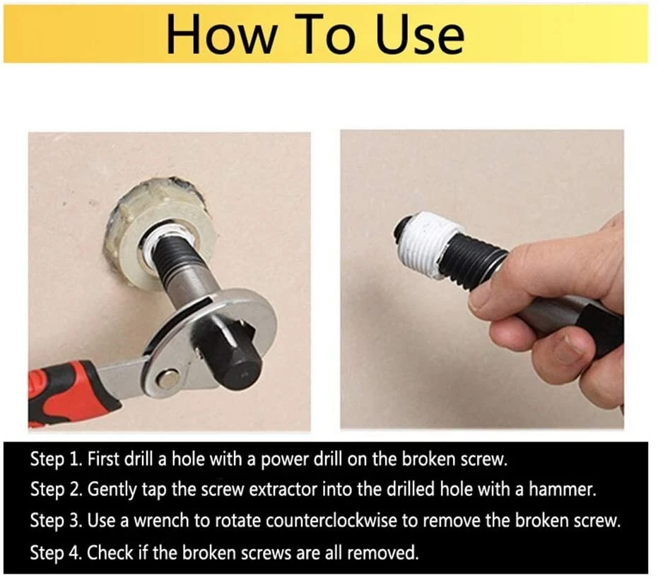 Features: 【RELIABLE QUALITY】The 8 Pcs Damaged Screw Extractor made from carbon steel and are tempered twice for extra hardness and durability.Works on wood and machine screws, as well as flat, hex, or painted over screws. 【EASY TO OPERATE】In just easy steps, only need a drill, choose a smaller extractor than the damaged screw, can easily remove the screw, please ensure to run the drill in reverse during this process. 【ATTACHED WITH A DURABLE CASE】8 pcs extractors are sequentially stored in a Buckle Lock storage box, for Easy Storage And Transport and preventing falling out and rusting. It has a protective effect. 【8 SIZES TO MEET YOUR DIFFERENT NEEDS】Screw extractor set includes #1 for 1/8"-5/32", #2 for 5/32"-3/16", #3 for 3/16"-1/4", #4 for 1/4"-5/16", #5 for 5/16"-7/16", #6 for 7/16"-9/16", 7# for9/16"-3/4", 8# for 3/4"-1". 【2 OF 8 EXTRACTORS ARE DESIGNED FOR WATER PIPE BREAKS】These extractors will remove most kinds of damaged, stripped, rusted, broken, or stuck screws from any wood or metal surface with relative ease. The new two water pipe extractors, designed for the broken water pipes. Specification: How To Use: 1. First drill a hole with a power drill on the broken screw. 2. Gently tap the screw extractor into the drilled hole with a hammer. 3. Use a wrench to rotate counterclockwise to remove the broken screw. 4. Check if the broken screws are all removed. Package Including: 8 * Damaged Screw Extractor Set 1 * Storage Box Tips: 1. Use the electric drill with the speed changeable in the opposite direction. 2. First make sure that the workpiece is safe and will not be moved when using the extractor. 3. Select a screw extractor that is thinner than the damaged screw head. Drill a deep enough hole in the middle of the screw head with one end of the drill head. 4. Reverse the screw extractor and turn it counterclockwise into the damaged screw until the damaged screw is released. Notice: In case the item is defective, please inform us within 15 days of receipt, we will arrange reship or refund. Buyers have to pay for the return cost and we will pay the cost for resend. If you are unsatisfied with our item or service, please contact us before leaving any feedback. We are committed to resolve all issues in a friendly and satisfactory manner. We always reply to messages within 2 business days (off-duty at weekend).If you do not get a response from us, then please check your junk or spam mailbox.