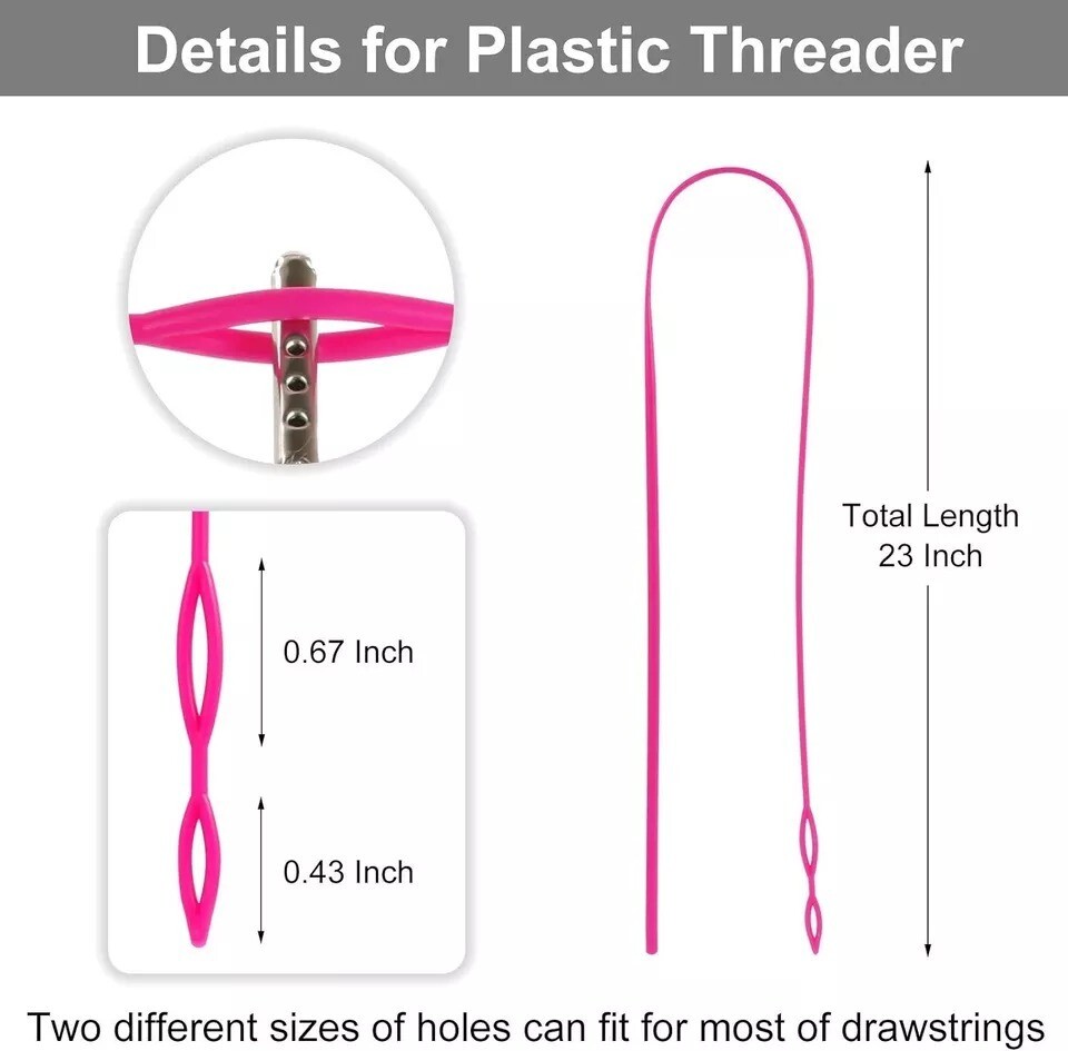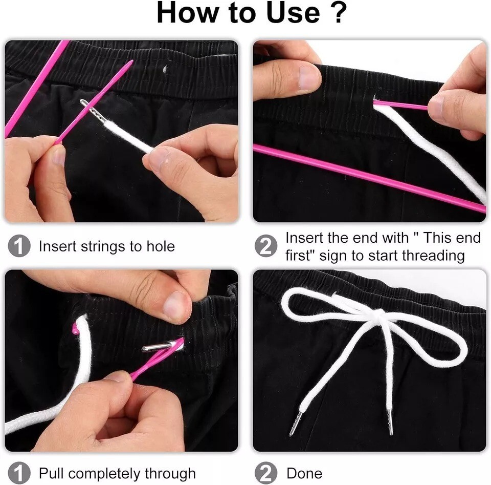 Quality Material: Made of 16 strands of terylene with metal head, drawstrings 53 Inches Long, diameter, 6mm Packing Include: 8pcs of replacement drawstrings including black and white, 4 pieces per color, 3 pieces different drawstring threader Comes with: 3 different size drawstring threader, include 1 piece 23" flexible nylon needle, 1 piece 3.2" metal threader and 1 piece 2.5" metal tweezer, suitable for different use Easy to Use: This drawstring threader can help you save a lot of time and trouble when drawstrings replacement, re-thread your drawstring. You just need thread drawstring through either eye or weave through both eyes to hold tightly, and then insert blunt end of threader into casing, pull threader through casing until drawstring is completely threaded in casing Wide Applications: Use this trim for adding an additional fashion or replacement drawstring cord for your pants, sweatpants, shorts, hoodies, scrubs jacket,s swim trunks, shoe laces, tote bag