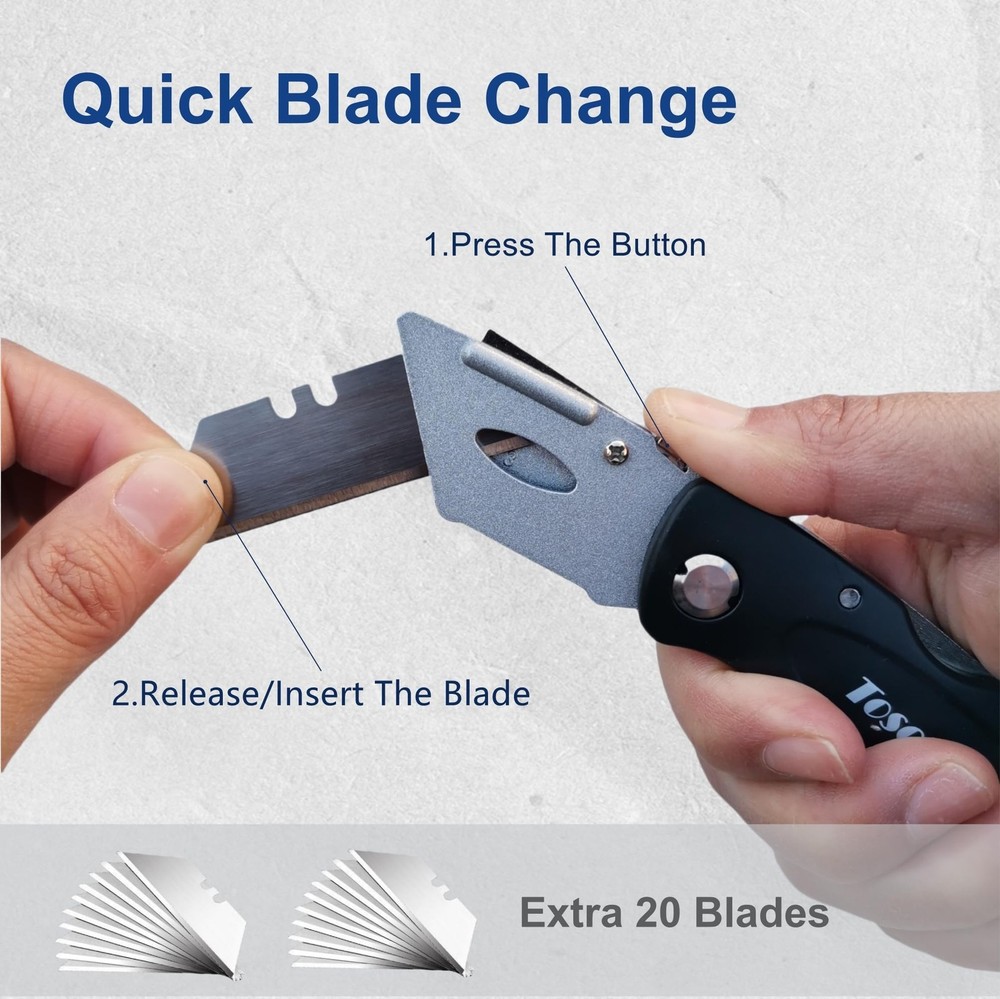 The mini box cutter is compact and foldable, measuring only 4.0 inches * 1.6 inches when folded, making it easy to carry around.When you need to go out, the small box cutter is definitely a good choice, you can put it in your pocket.This is also a good razor knife utility. It comes with 8 pack of box cutters retractable heavy duty (red/yellow/black/blue) and extra 30 replaceable blades, which are enough for a long time. Blades are made of steel for high hardness and sharpness.The blades are very sharp and ensure smooth cutting of different materials. Press the silver button on the Aluminum alloy shell to replace blades for the retractable box cutter knife. When replacing the blades, you need to handle it carefully to avoid cuts. The blade has a plastic protective cover. The ergonomic plastic handle provides a firm, comfortable grip and reduces hand fatigue during prolonged use. Pull the knife sheath away from the handle to open the folding utility knife folding. The folding knife locks automatically when unfolded. The self-locking mechanism ensures that you never have to worry about the box cutter folding or slipping while cutting.Press the folding button on the back of the handle to close the box opener cutter.This is a good razor knife utility and box knife. Our box cutters knives for heavy duty is widely used in homes, offices, warehouse and yards for cutting plastic sheets, boxes, cartons, rope, carpet, cloth, bags, leather, wallpaper and more. With our razor utility knife, cutting will be easy and efficient. Economical & Practical Folding Utility Knife - Comes with 8 folding box cutters (red, yellow, black, blue) and extra 30 blades.The back-lock mechanism ensures that you never have to worry about the utility knife folding or slipping while cutting with the box cutter knife Extra 30 Blades & Tough Tools - Our razor blade utility knife comes with extra 30 replaceable blades for longer use. Easy blade change design allows you to safely and quickly change the razor knife blades for our folding razor knife, no screwdriver required.The handle made of tough plastic makes it a sturdy and lightweight blade cutter. Besides, the blade has a plastic protective cover for safety 4 Color Box Cutter Pack - 4 bright colors (red, yellow, black, blue) for different purposes and easy to find. You can even leave one folding razor knife in every room or place you need it for easy access. Great gifts for the one you loved with frequent cutting needs Foldable & Portable Design – The compact size (4 inches when folded) makes it a great choice when carrying a utility knife on the go, and more convenient than normal retractable box cutter. The lightweight plastic handle provides a firm, comfortable grip and reduces hand fatigue during prolonged use Ready for Multi Purpose -Our utility knife for heavy duty is widely used in homes, offices, warehouse and yards for cutting plastic sheets, boxes, cartons, rope, carpet, cloth, bags, leather, wallpaper and more. With our razor utility knife, cutting will be easy and efficient