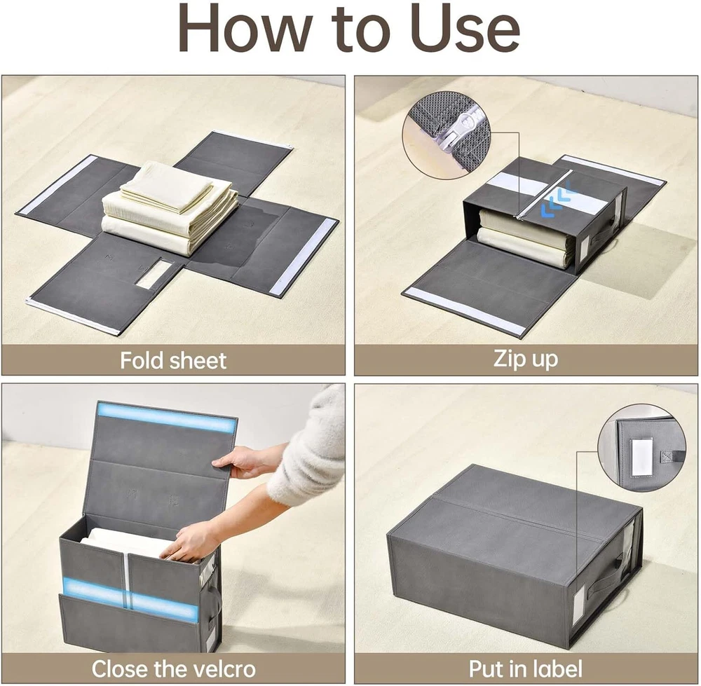 【Visible Window and Label Design】 linen closet organizers and storages is designed as a transparent window composed of PVC material, with removable tabs on the sheet storage for closet, you can clearly and quickly see the color and pattern of the fabric inside, without having to open the each sheet organizer, which will save you a lot of time. 【Strong & Sturdy Fabric】 The bed sheet organizers and storage are made of high-quality non-woven fabric, which is strong and sturdy. and sheets storage with breathable fabric to keep your items clean, neat, and orderly. reinforced cardboard keeps the bedding storage keep good shape, and won't be bent and deformed even after a long time of use. 【 Multifunctional Sheet Storage Organizer】 Our bed sheet organizer can not only help you organize your bedding but also serve as an under-bed storage container to organize, storage for sheets and blankets can store sheets, pillowcases, duvet covers, sofa covers, and bed curtains. Cube shape, suitable for storage in storage cabinets, drawers, wardrobes, and storage shelves, meets all your storage needs. 【Easy to Fold and Use】 With a foldable design, The sheet organizers and storage can be folded to a 1-inch thickness when not in use, making storage for sheets easy to carry and store. Keep your linen closet neat. In addition, the 2 handles on each sheets organizer for linen closet are convenient for taking out and storing in daily life, and it is very convenient to use. 【Save Time and Space】 Each sheet storage size 16*12*6inch, fits most closets and shelves. These 8-pack bed sheet organizers keep your linen closet organized. our foldable linen closet storage is easy to use, efficient sheet organizer that saves time and effort by avoiding repeated folding and prolonged rummage. Sturdy bedding organizer storage can be stacked to save space. Material Fabric Color Grey Product Dimensions 16"L x 13"W x 6"H Special Feature Stackable, Foldable Recommended Uses For Product For storage, Bed sheets Closure Type Zipper Shape Square Number of Items 8 Size 8 Pack Number of Sets 8 Item Weight 11.64 pounds On Feb 11, 2025 at 18:59:57 PST, seller added the following information: