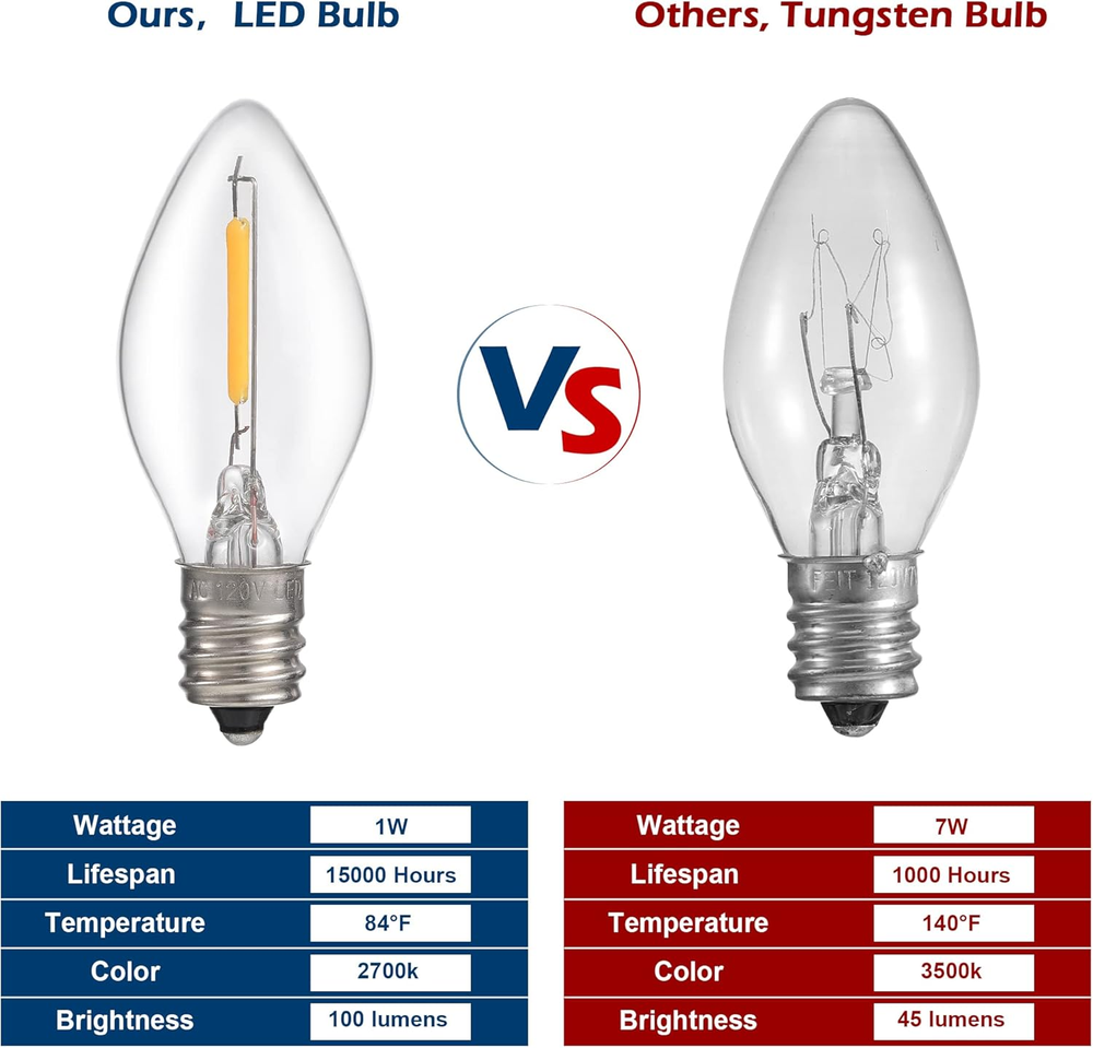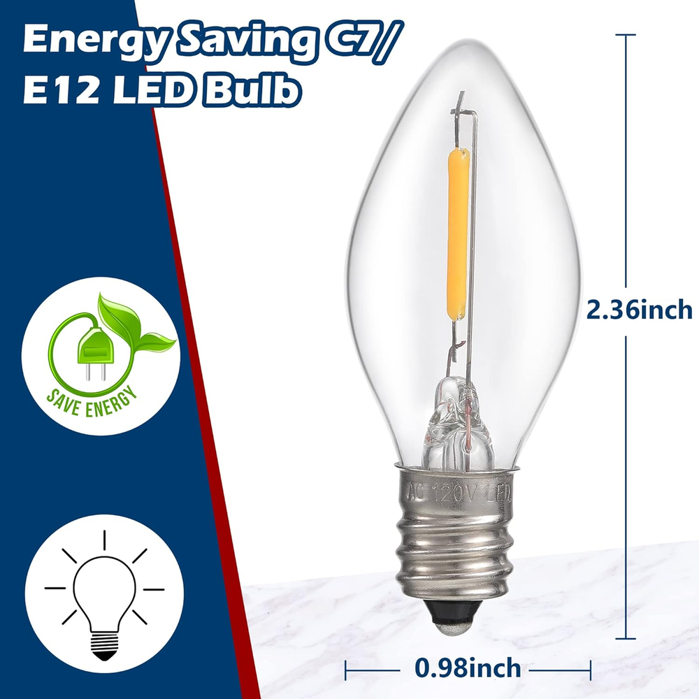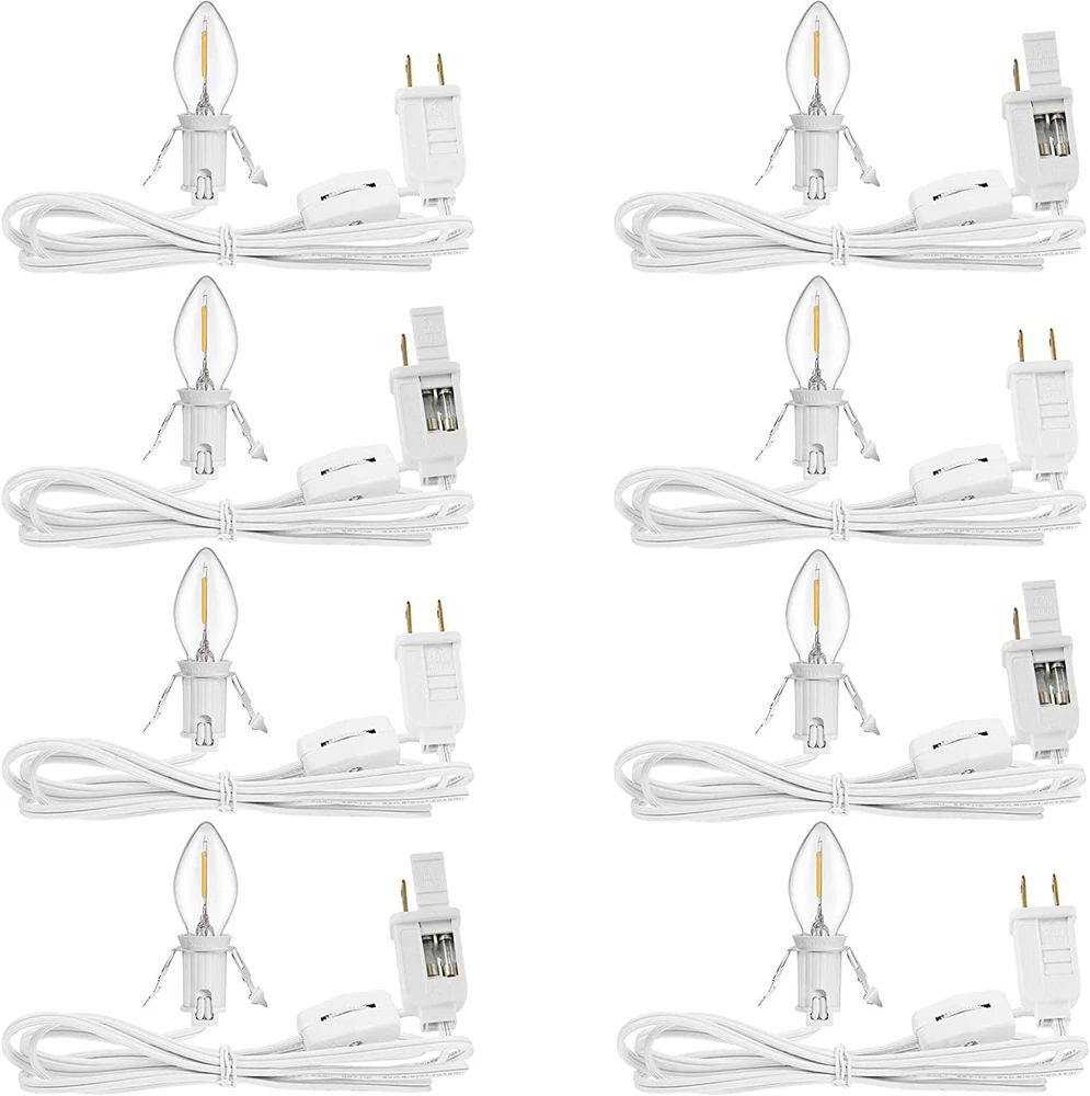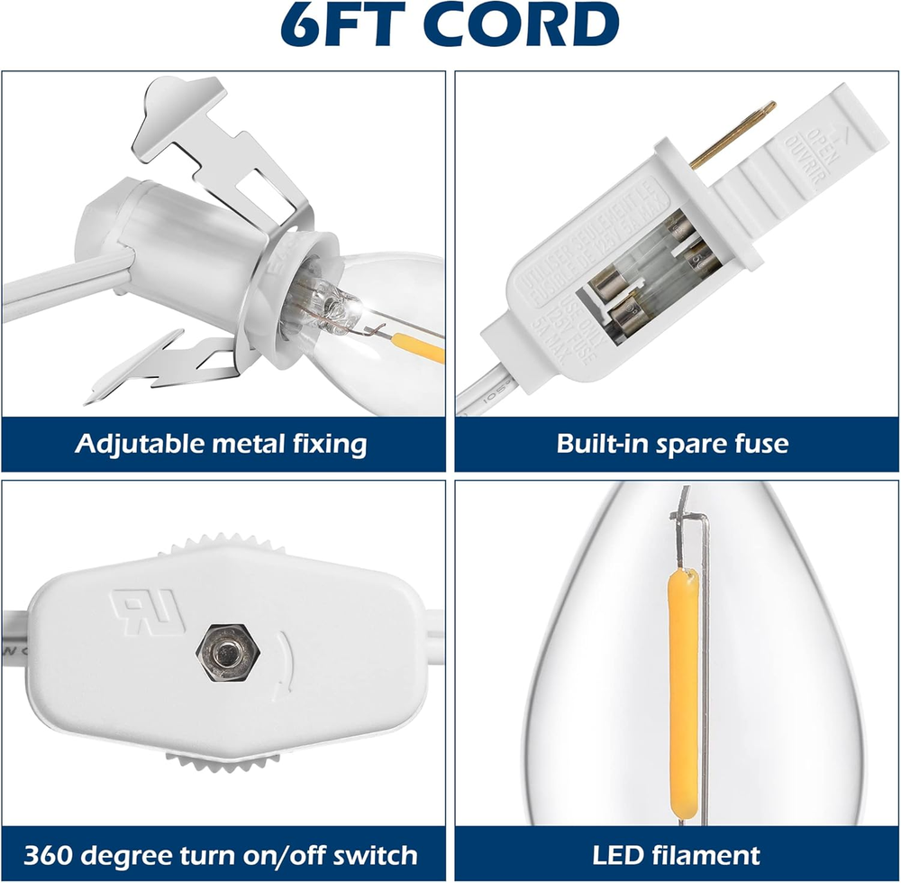 [Bright Blow Mold Light Kit] The candle C7 Light with accessory cord has stable bright and good enough length for your Halloween and Christmas village houses decorations, the switch ON/OFF allows you control the light easily [Energy Saving LED Light Bulb] LED filament bulb has more bright and cooler touch than traditional tungsten lamp to avoid burning your crafts, 1W energy saving and cord with light is safe for usage [2PCS Built-in Fuses Available] There are 2 pieces fuse wires built-in the plug, you can easily push open the fuse protection strip and remove the spared one, no more extra fuses need to buy