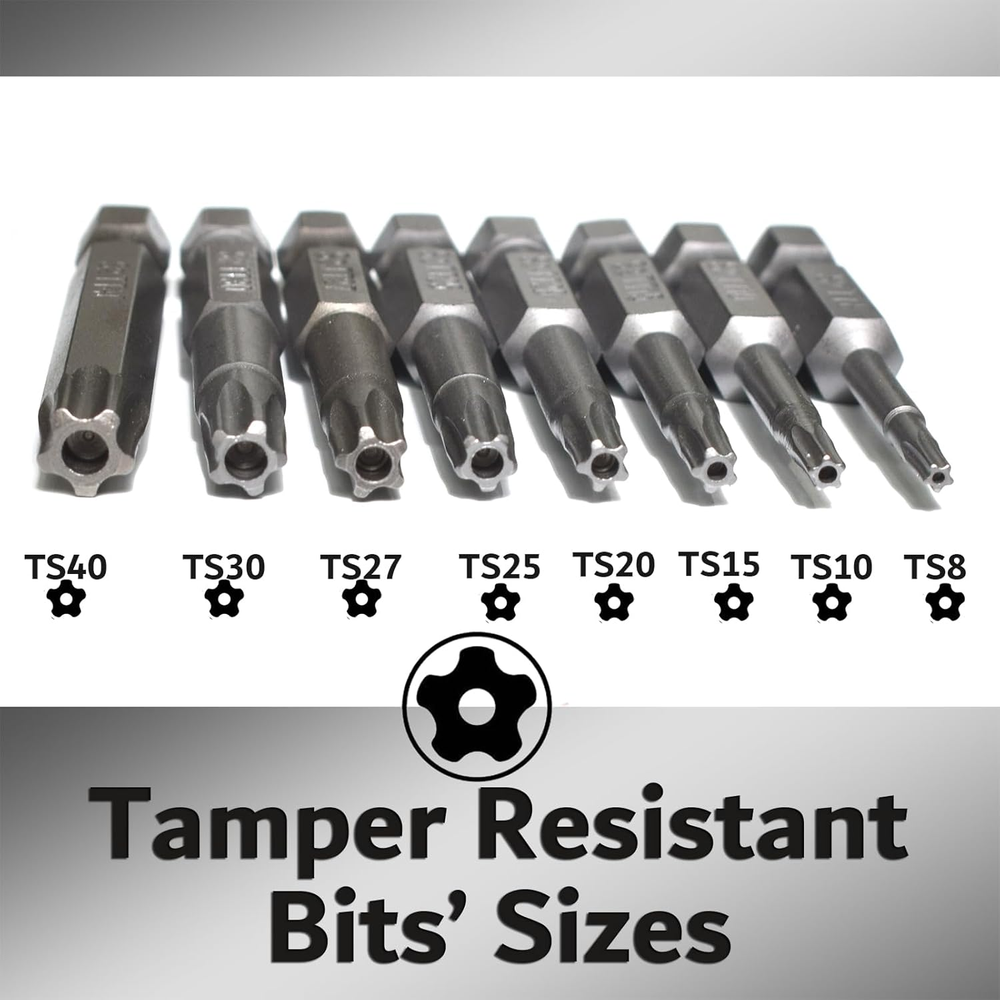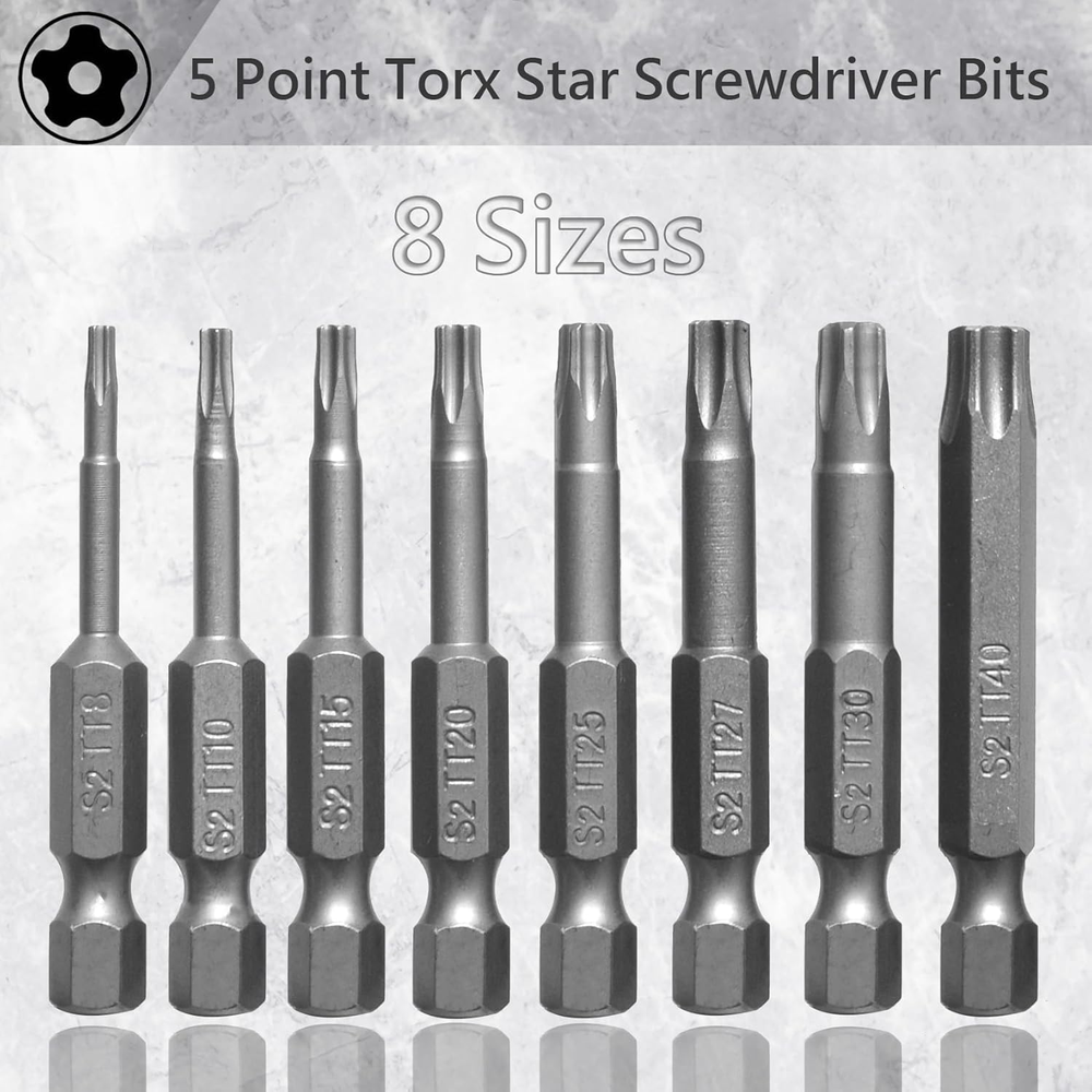 What’s in package: 5 Point Torx TT8 TT10 TT15 TT20 TT25 TT27 TT30 TT40 Screwdriver Bits. Screwdriver Bits Length: 2 inch. 5 Point Star Security Screwdriver Bits are made from shock-resisting S2 steel for maximum durability. These Screwdriver Bits are designed to drive 5 Point Star head screws. Strong Magnetic tip can attract screws easily, and make it easy to take the screw out after unraveling. Can be widely used in electric drills, electric screwdrivers, hand screwdrivers, and air drills., etc. 5 Point Torx Star Security Screwdriver Bits