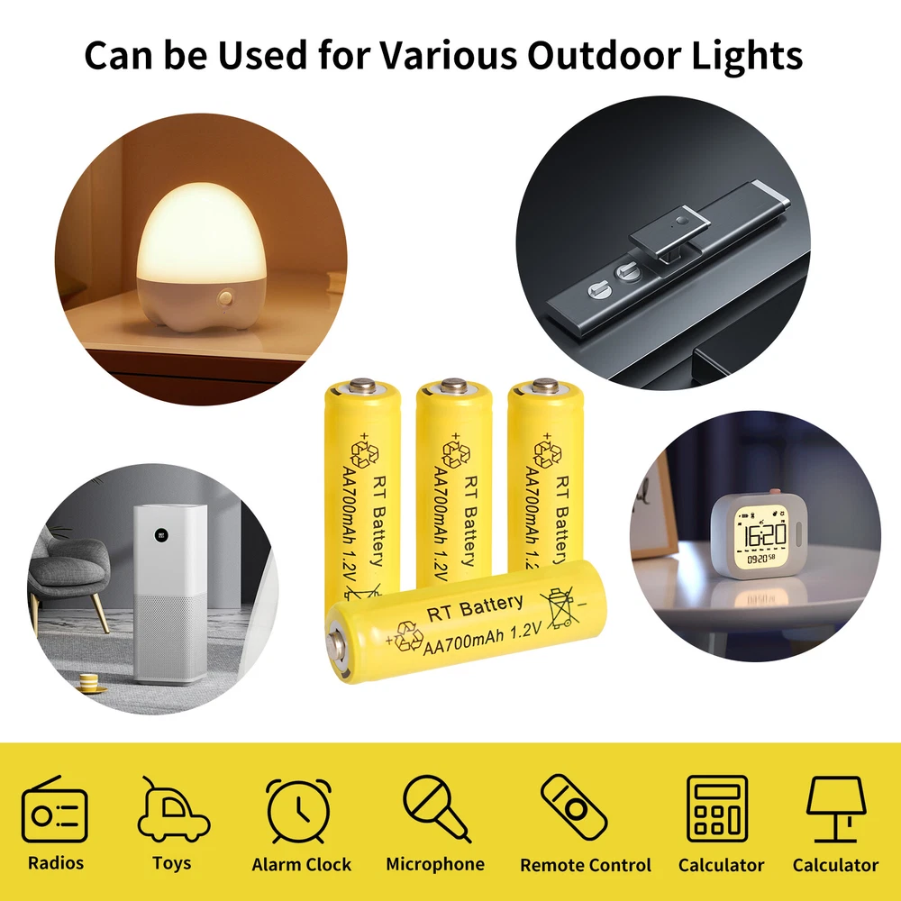 8Pcs AA & 8Pcs AAA Ni-MH Rechargeable Batteries 1.2v with Plastic Storage Case Warm Tips: Before use, please remove the plastic packaging film of the battery. AA / AAA NiMH Battery 1.2v Features: 1.【Widely used】 The AA batteries rechargeable 1.2v is perfect for solar garden lights, landscape lights, lawn lights, etc.It can replace all disposable alkaline batteries for low power electronic products. 2.【Easy to Charge】 The AA rechargeable batteries Ni-MH can be charged by solar lights or standard charging devices. Better high-temperature performance than other types of batteries, can be used from -4℉ to 140℉, and can be charged from the sun even in the snow. 3.【Safe and Reliable】 The Ni-MH AA 1.2v rechargeable battery is very safe and reliable. For transportation safety, these Ni-MH AA batteries are only pre-charged to 30%, so please charge them before use for longer working time. 4.【Durable】 Our Ni-MH AA batteries rechargeable have a capacity of 700mAh and can be recharged at least 500 times continuously. Save you the cost of buying disposable alkaline batteries and reduce the harm to the environment. 5.【Suggestion】 Please charge the battery after each power exhaustion, otherwise it will affect the capacity and life. In addition, charge every 3 months to extend the life of the battery. NiMH AA Battery 1.2v Specification: Capacity: 700mAh Voltage: 1.2V Size: diameter 14mm*50 mm Terminal Type: Button Top Chemistry: Ni-MH (Nickel Metal Hydride) Rechargeable Times: Up to 1000 times No Memory Effect Note: Do not disassemble or modify the rechargeable battery NiMH AAA Battery 1.2v Specification: Capacity: 700mAh Voltage: 1.2V Size: diameter 10mm*44 mm Terminal Type: Button Top Chemistry: Ni-MH (Nickel Metal Hydride) Rechargeable Times: Up to 1000 times No Memory Effect Note: Do not disassemble or modify the rechargeable battery Package Included: 8X Ni-MH AA 1.2v Rechargeable Battery 700mAh 8X Ni-MH AAA 1.2v Rechargeable Battery 700mAh 4X Plastic Battery Storage Cases Warm Tips: 1. Before use, please remove the plastic packaging film of the battery. 2. Please check the "+" and "—" directions of the battery before you charge the battery. 3. Do not put the product into fire, short circuit, dissassemble and extrude. 4. Do not mix charging with different type of batteries, which may explode or leak, causing personal injury. 5. Please use up the power each time, then recharge it otherwise it will affect its capacity and lifetime. 6. Please take out the battery if you won't use for a long time to avoid battery leakage. 7. Note:Please find us in first time when you find the parcel Broken/Scratch/Function Error/Miss Parts/Unwork/has not arrived etc, we always have more details and solutions, even duty for your order. On Dec 27, 2024 at 23:01:12 PST, seller added the following information:
