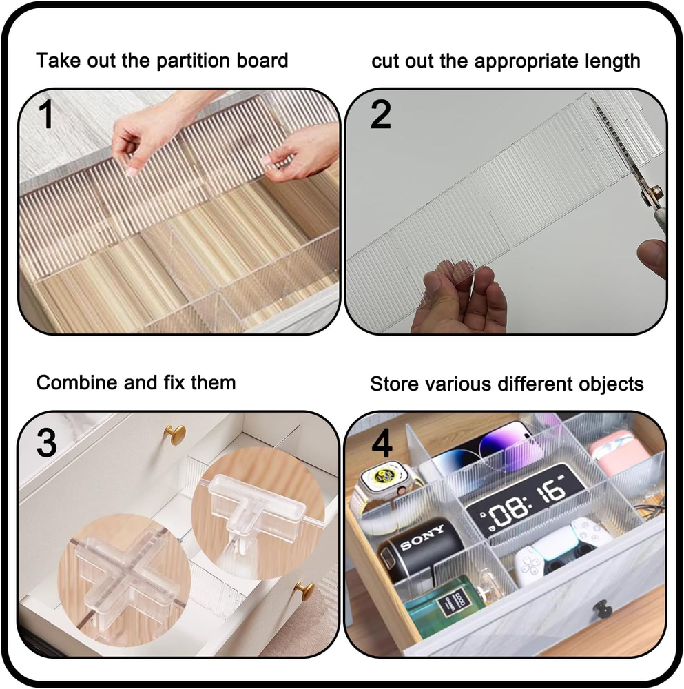 1. Customizable Drawer Organization】 Maximize drawer space effortlessly! These adjustable drawer dividers let you create custom compartments for clothes, kitchen utensils, socks, tools, office supplies, and more. The expandable design fits drawers from 12.6” to 22.8” wide, ensuring a perfect fit for any storage need. Say goodbye to messy drawers! 2. Versatile & Multi-Use Storage Solution】 Perfect for any room! Use these drawer organizers in your closet, kitchen, bathroom, garage, or office. Keep T-shirts, underwear, cutlery, makeup, or DIY tools neatly separated. The 8-piece set provides endless configurations, making it ideal for home, dorm, or RV storage. 3,Strong & Durable Design】 Built to last! Made from high-quality, sturdy plastic, these drawer dividers stay firmly in place without sliding. The 2.36” high walls prevent items from toppling over, while the smooth edges protect your hands and fabrics. No more collapsing dividers! 4. Easy Assembly & No Tools Needed】 Set up in seconds! Simply adjust the dividers to your desired length and press them into place—no screws, adhesives, or tools required. The interlocking design stays secure, yet you can rearrange them anytime for new storage needs. Hassle-free organization! 5. Space-Saving & Clutter-Free】 Transform cluttered drawers instantly! These expandable drawer dividers help maximize vertical and horizontal space, so you can store more while keeping everything visible and accessible. Ideal for small apartments, RVs, or packed closets—stay organized without wasting an inch! Product Description