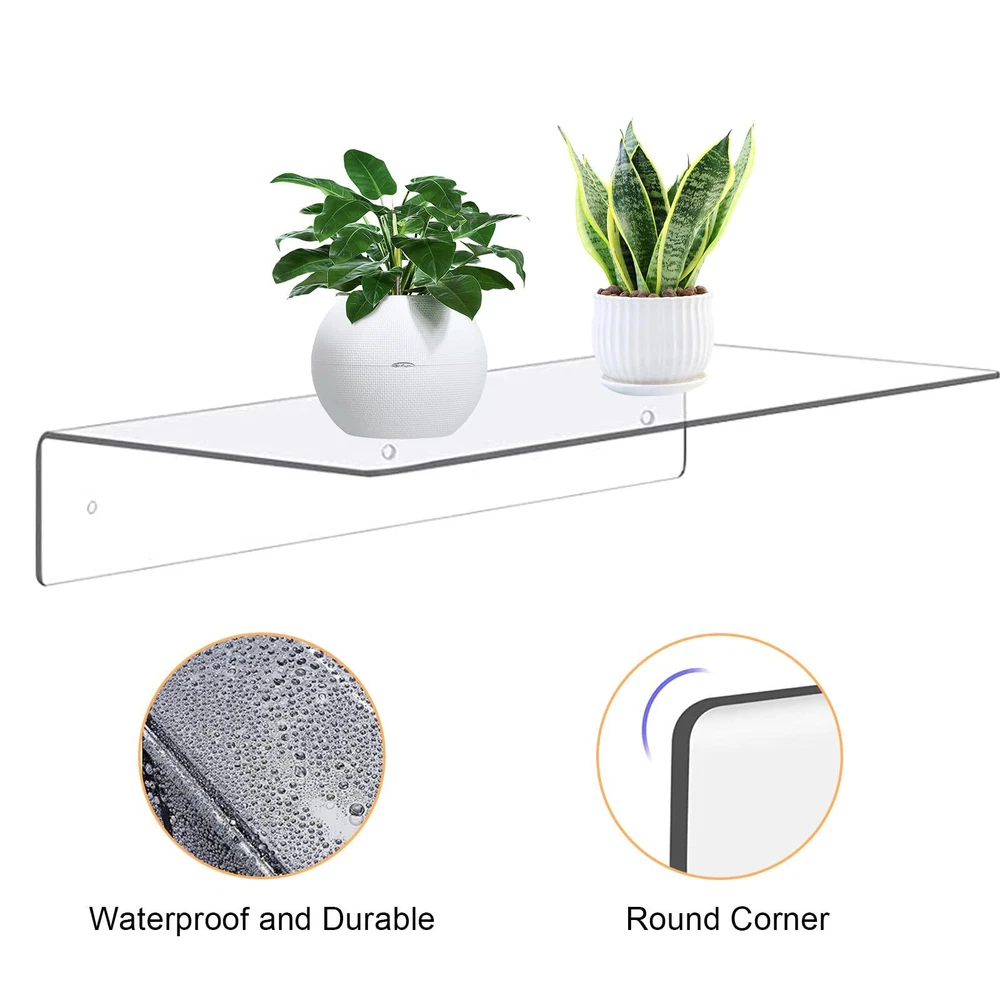 Large Capacity: 14x5.9x2.5 inch clear acrylic floating shelves set of 8 in the same size is equipped with strong bearing capacity; 3mm thickness which would be very stable to ensure your safety when fixed into the wall. Screws and cover nuts included. Durable and Sturdy: The floating bookshelf displays made of thick acrylic, the structure is strong, not easy to break, and easy to clean. Fine workmanship and nice texture take up little space, can be used for a long time. Stylish & Light Luxury: These clear wall ledge shelf wall with transparent color and L- shape design make them beautiful And stylish in simple style. The bright and beautiful floating shelves with round corner and edge scraping for safety and smoothness will never hurt hands. Easy Installation Method: Clear floating shelves for wall have pre-drilled holes, detailed instructions and all necessary mounting hardware screws, make installation simple and easy in minutes. Multifunctional Use: Invisible floating bookshelf displays made of acrylic for kitchen, bedroom, bathroom, living room; Can be a wall mounted shelf for plants, speaker, radio, artwork, cosmetics, books, picture frame, clock, toys collectibles, toiletries.