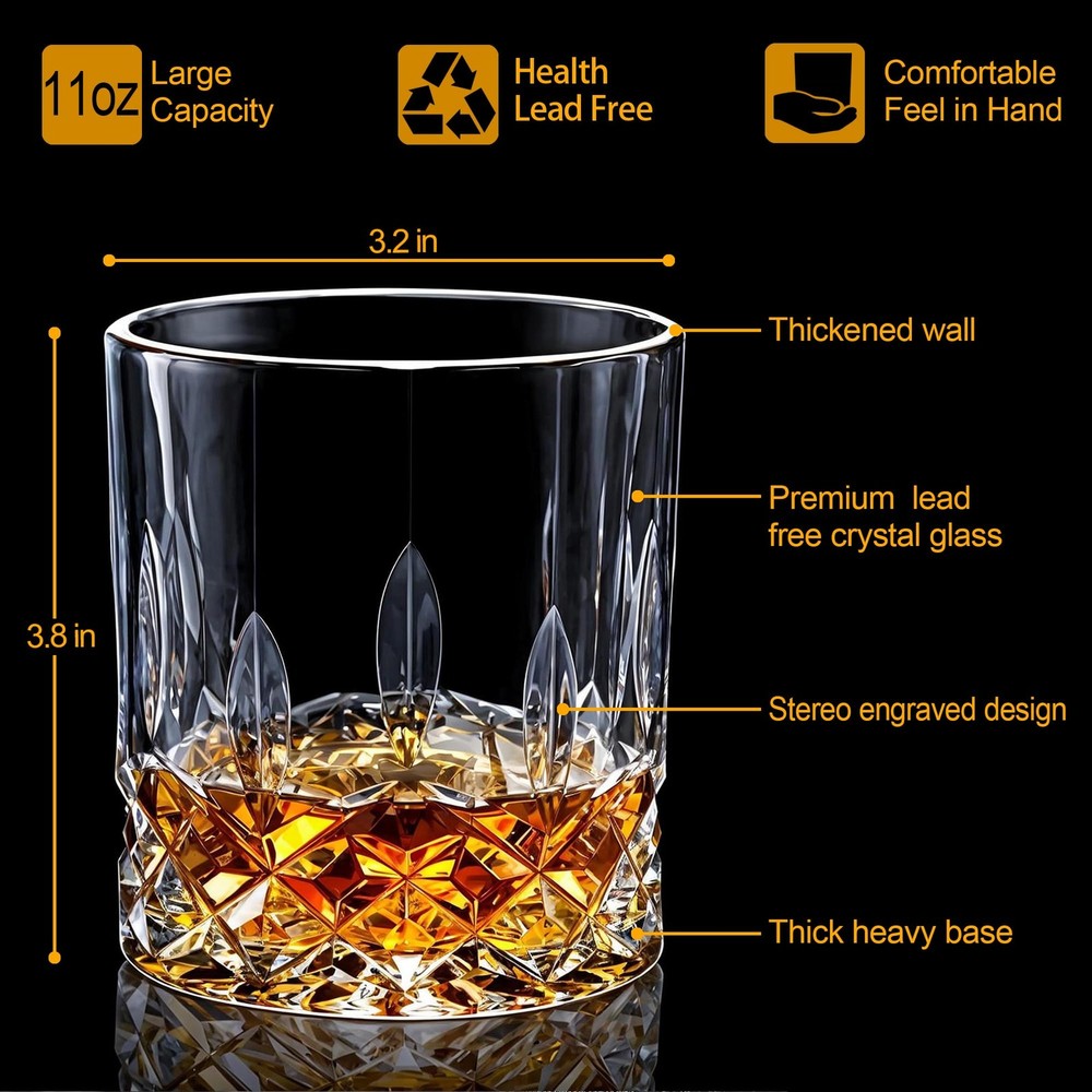A Tasteful Life Starts with Whiskey Glassware Enjoy every wonderful moment with our whiskey glasses, feeling the mellowness and charm of your liquor Premium Quality Whiskey glasses are made from high quality lead free crystal glass, classic design with durable thick walled and heavy weighted base, the solid design is virtually unbreakable, premium material makes it dishwasher safe and also meet hotel and service industry quality standards. Safe Package the whiskey glasses are well packaged in the inside with tight seating and heavy foam to ensure safe shipping. The beautiful package makes our whiskey glass set an ideal gift for Men or Women on any occasions. Unique Design The bourbon glasses with embossed diamond design make it easier and better to grip, you will feel much different and comfortable in your hand than other cheap made glasses. Wide shaped on the top to ensure a smooth drinking and sipping experience, a high quality scotch glass creates a truly enjoyable whiskey tasting experience PERFECT CAPACITY 10 oz capacity is suitable for virtually any type of drink, rocks glasses with enough room to average ice block or hold an ice sphere. These glasses are perfect for malt scotch, bourbon, beer, vodka, old fashioned cocktails, gin and tonic and much more. Great for home bar or both casual gatherings and formal dinner parties. Great Thanksgiving Day Christmas New Year whiskey gifts for men and women. Premium Quality Whiskey Glasses - Made of lead free crystal glass, clean and clear, no heavy metal included.Perfect for serving scotch, whiskey or mixed drinks. Use for drinking your Single Malt, Tennessee Rye, Brandy, Beer, Vodka, Old Fashioned Cocktails, Gin and Tonic or any liquor you like, or even as a classy way to serve water or juice at your dining table Durable Old Fashioned Glasses - Thickened wall and heavy weight bottom promise a long service time. The full capacity is 11 oz, standard 10 oz Volume, comfortable hand feeling, suitable for ice cube. Budget- friendly set of 8 lowball glasses that you can use for whisky, scotch, bourbon, vodka and almost any cocktails you can think of Engraved Design Rocks Glass - Serving your drinks in these elegant engraved glasses will surely impress your party guests. Ideal for proposing a toast on special occasions with family or clients, or playing poker and party with friends. Easy to clean and dishwasher supported Perfect Gift For Whiskey Lovers - This Glasses Drinking Set is an excellent gift for all kinds of liquor lover. Perfect gifts chocie for Men or Women on Birthdays, Mother's or Father's Day, Engagement, Wedding Anniversary, Christening or Christmas Safe Package - Full EPE foam cover protection for the whiskey glasses, which greatly reduces the risk of damage during shipping. If you have any question about these rocks glasses or your order, please do not hesitate to contact us immediately. We will provide you with satisfactory service