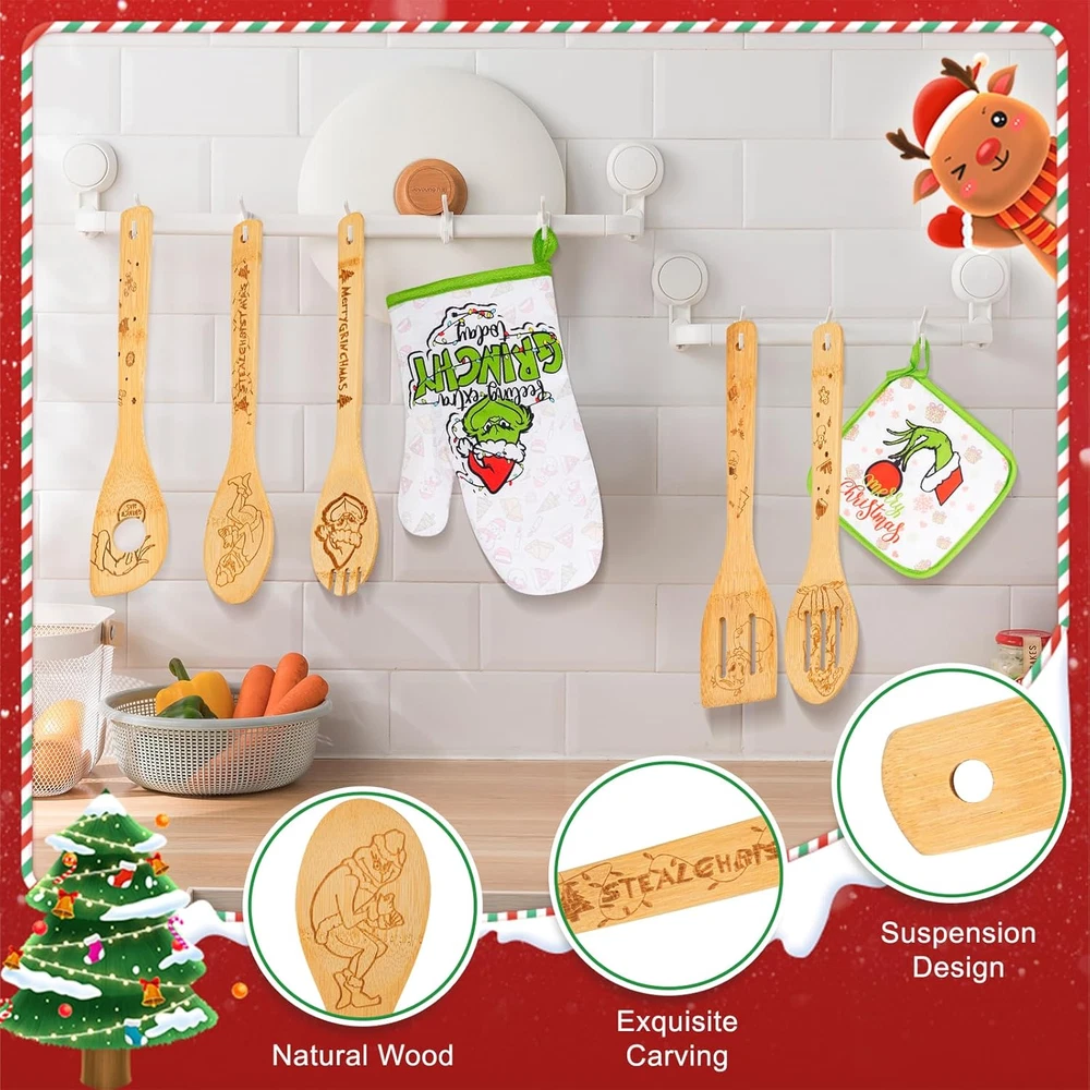 8-Piece Bamboo Christmas Kitchen Utensil Set - Green Monster Design Cooking Spoo