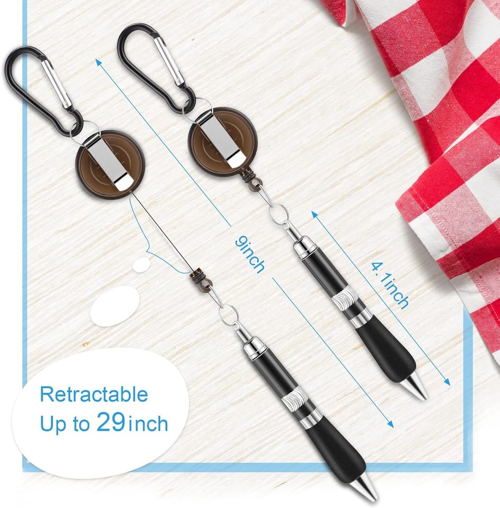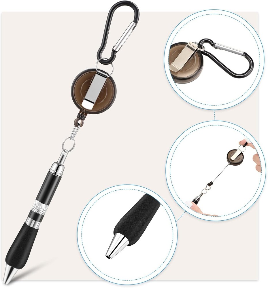 8-Piece Black Carabiner Pens with Belt Clip Keychain & Retractable Badge Reel