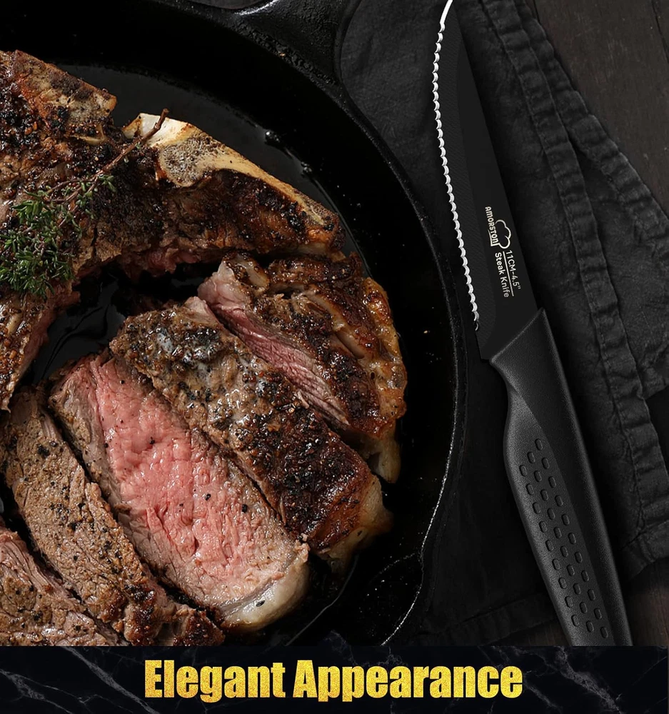 Steak Knives, Knives Set of 8, Stainless Steel 8 Piece, 8 Piece - Black Product Details Blade Material: High Carbon Stainless Steel Brand: Amorston Color: 8 Piece - Black Handle Material: Polypropylene Blade Edge: Serrated Blade Length: 4.5 Inches Construction Type: Forged Item Weight: 16 ounces Blade Color: Black Is Dishwasher Safe: Yes Item Length: 11 Inches Manufacturer: Amorston Size: 8 Piece Item Weight: 1 pounds Item model number: 1 【Sharp, Non-Stick & Rust-Resistant】The steak knives body uses a unique anti-rust, anti-stick and anti-oxidant coating, so that the blade is always in the best condition, extremely easy to clean, greatly extending the life of the knife. It's also a wonderful wedding gift for your friends or Mother's Day gift for your mother, or a gift for yourself! 【Comfortable and Non-slip Handle】The handle of the steak knife is made of the highest grade PP material. The ergonomic handle, made by the most professional designers, makes the steak knife extremely comfortable to use, and even after long hours of use, the hand will not feel any discomfort. In order to increase the safety of steak knife use, we have also added extra anti-slip air holes to ensure safety while enjoying the food. 【Dishwasher Safe】This steak knives set for kitchen is easy to maintain. Dishwasher safe. Perfect for storage after washing and drying. The whole body of the knives set for kitchen is made of premium stainless steel material. The surface layer has a high-grade anti-rust coating, which will not rust as easily as other kitchen knife sets, and will not cause damage despite the high intensity impact of the dishwasher. 【Multipurpose】: The 8-piece set of steak knives can be used for more than just slicing steaks, scenes can be used in barbecues, kitchens, dinners, parties, camping, restaurants, and hotels. They also work well for slicing and carving meat, cheese, butter, bread, baguette, turkey, pizza, ham, brisket, fish, vegetables, fruit, and especially beef and steak.