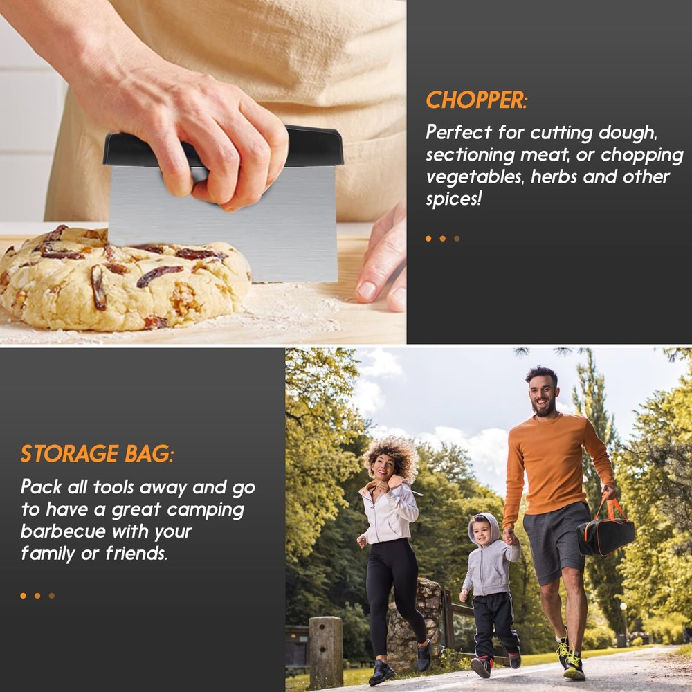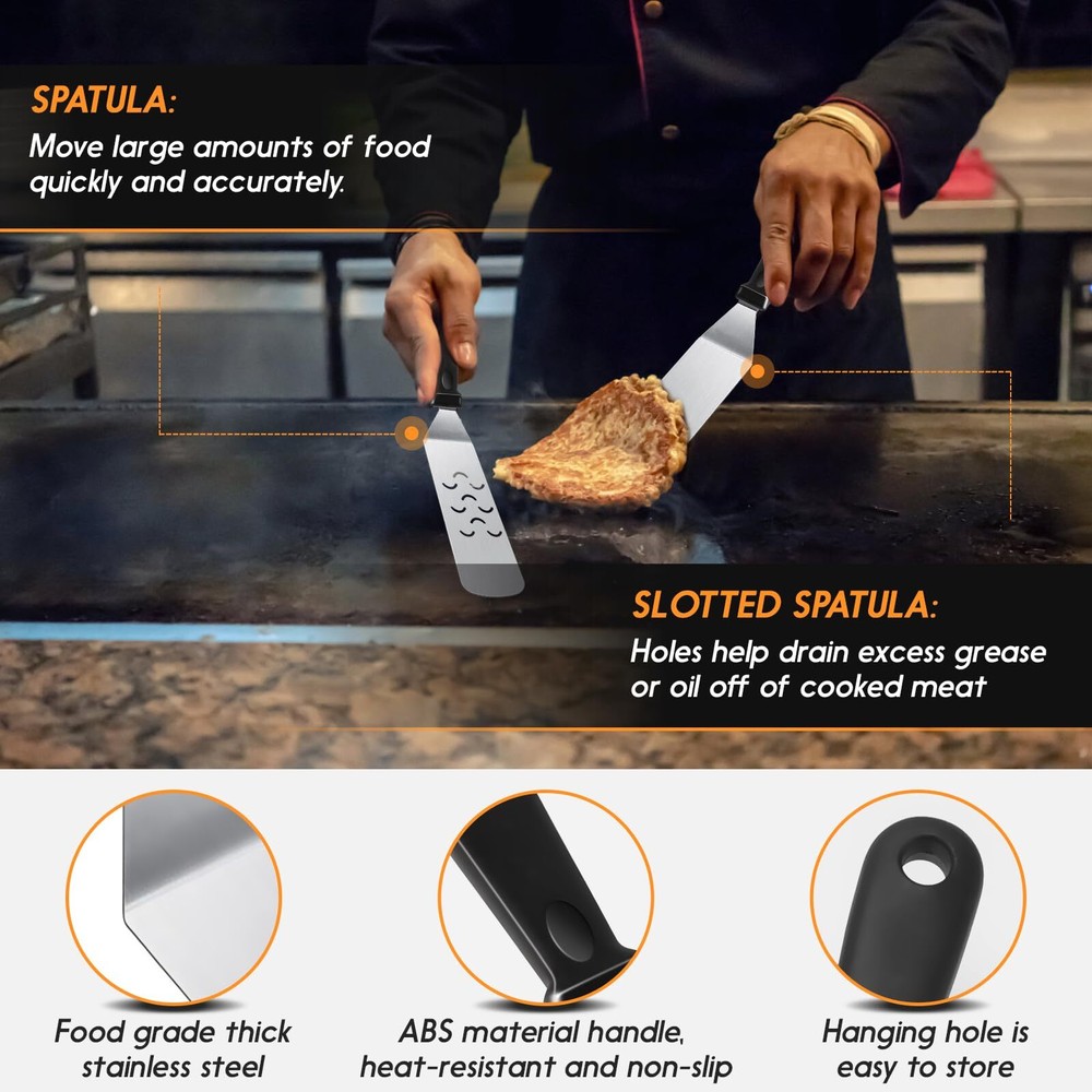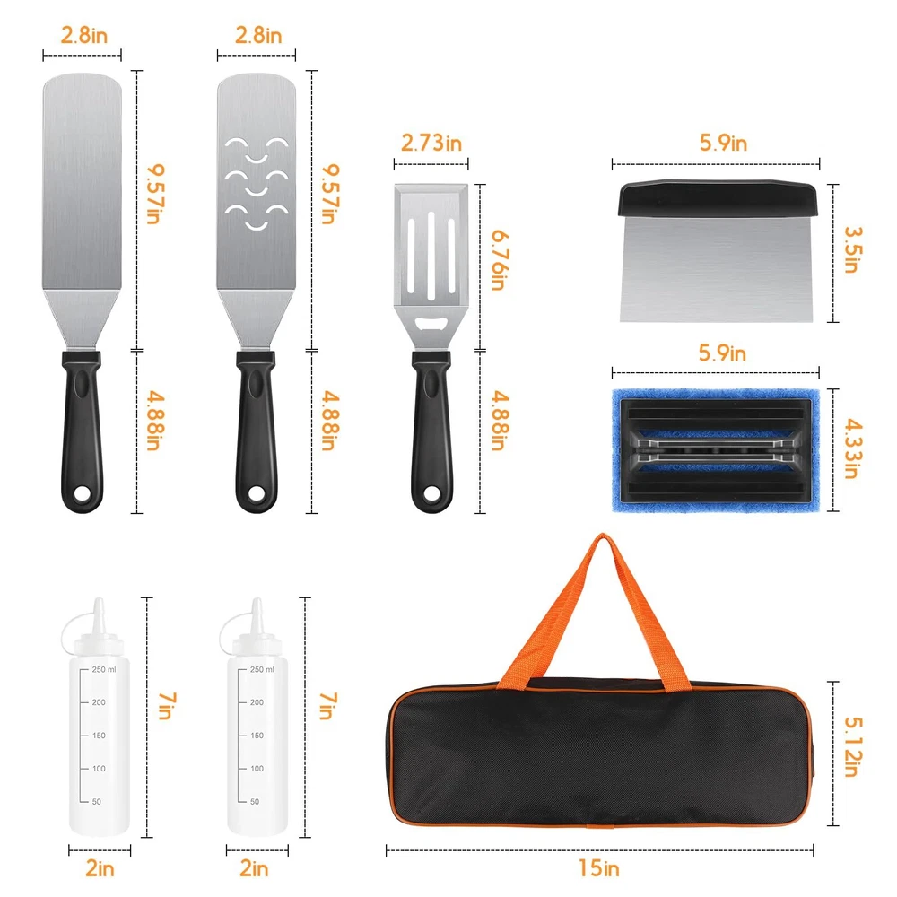 Griddle Accessories Kit, 8pcs Blackstone Accessories Kit for Blackstone and Camp Chef, Professional Griddle Accessories Kit with Spatula & Carry Bag for Great for Outdoor BBQ, Teppanyaki and Camping Premium Stainless Steel: Griddle accessories are made with stronger and thicker stainless steel. Heat-resistant and non-slip, the handle of the abs provides a comfortable grip, with hanging holes for easy storage. you can easily enjoy your grilling, camping, or cooking without worrying about your tools bending, breaking, or rusting again. Blackstone griddle accessories are dishwasher safe for quick and easy BBQ clean-up. Multipurpose Blackstone accessories kit: 2 Oversized griddle spatulas, great for flipping beef cubes, fried egg, rice, noodle, and vegetables. 1 Regular-size grill flippers/turners (can be used as a shorter spatula) with 3-sided bevel cutting edge, great for turning burgers, and pancakes and cutting bread, meat, and sausage. Must-Have Griddle Accessories: Blackstone accessories kit include 1 chopper/ scraper to dice food and scrape griddles clean. 2 squeeze bottles for liquids oil, 1 Cleaning Brush, and 1 storage bag. Blackstone accessories will please everyone at your BBQ, weekend party, or your everyday meals. Perfect Gift Choice: Beautifully designed gift box with quality packaging, which is an ideal gift choice for Father's Day, Thanksgiving, or Christmas. These practical Blackstone accessories are for most grills and are suitable for indoor and outdoor cooking. It can meet all the essentials of your daily backyard barbecue and camping activities. Whether you are in the kitchen, your backyard, or out camping. You can enjoy BBQ time with your family and friend easily. Satisfaction Customer Service: We stand by our Griddle Accessories Kit with our outstanding customer service, we aim to satisfy purchases for every customer. If you ever have a problem, please feel free to contact our customer service, we will reply within 24 hours and help you solve the problem. blackstone kit blackstone tools blackstone accessories kit blackstone griddle kit blackstone grilling accessories blackstone spatula set griddle tool kit griddle spatula set griddle utensils blackstone grills accessories flat top griddle accessories blackstone squeeze bottles outdoor griddle accessories blackstone griddle tools griddle tool set blackstone griddle spatula SHIPPING Domestic Buyers - We have confidence in our products, but if you are not fully satisfied please contact us within 30 days of purchase and you will get full refund. - We ship within 3 business days of payment, usually sooner - We offer FREE shipping on all orders! - We only ship to the lower 48 states, no APO/FPO addresses or PO Boxes allowed International buyers – please note: Import duties, taxes, and charges aren't included in the item price or postage cost. These charges are the buyer's responsibility. - Please check with your country's customs office to determine what these additional costs will be prior to bidding or buying. * Order Cancellation Policy ** You can return a product for up to 30 days from the date you purchased it. 1. The seller reserves the right to cancel the special case only due to eBay cancellation fee. 2. The decision of seller is the final. 3. The seller will respond to the cancellation request within 2 business days. Please wait for the result of cancellation. 4. In case the cancellation is not completed by some reasons, the buyer can follow the options below to get the refund. 4.1 The buyer can reject the item when it arrives. 4.2 The buyer can send the item back to the seller within 30 days If the buyer receives item (USA Shipment ONLY). The seller will provide the FREE return label to the buyer when the buyer opens " Return Item" case on eBay by using the reason as "Change my mind" ONLY. 5. When buyer has placed the order. The order will be processed and completed by automatic warehouse system within 5 minutes. In case that buyer sends the cancellation request after 5 minutes of placing the order, the request will be rejected. **Sending direct message to cancel the order is not allowed for every case.* Return Policy For the return case - If buyer would like to return the items for refund or replacement, please CONTACT SELLER to receive the free return label from seller. The refund or replacement will be processed with the tracking number of return label which is provided by seller only. The other ways of return which are not approved by seller will not be processed for the refund or replacement.