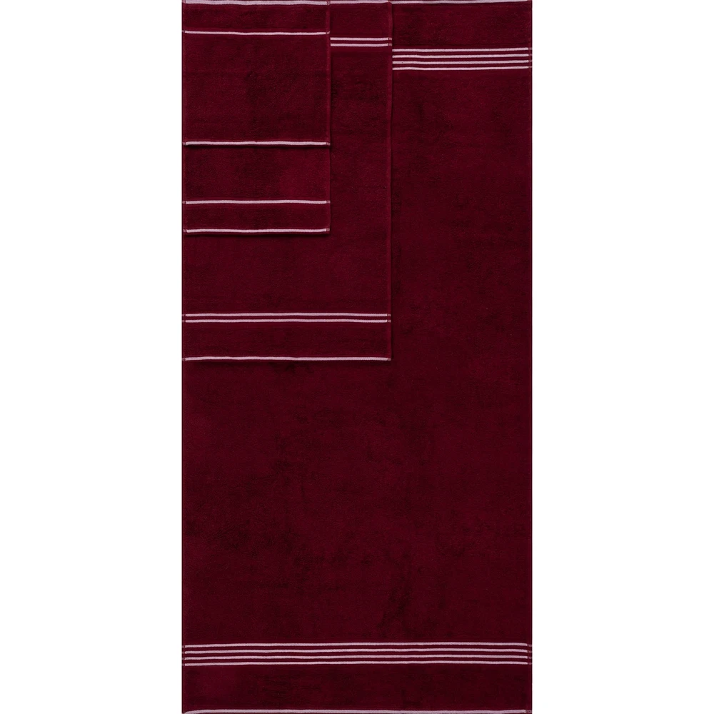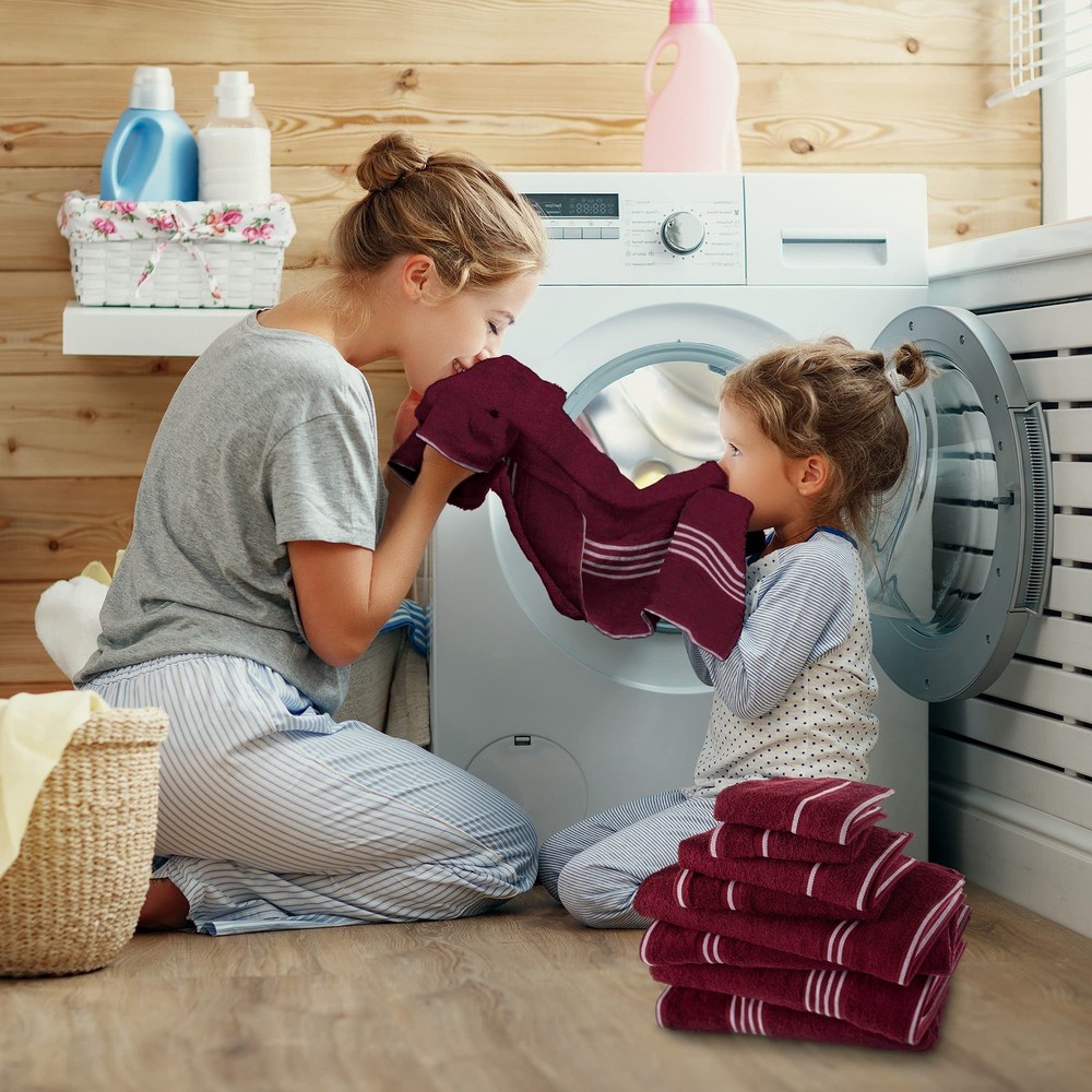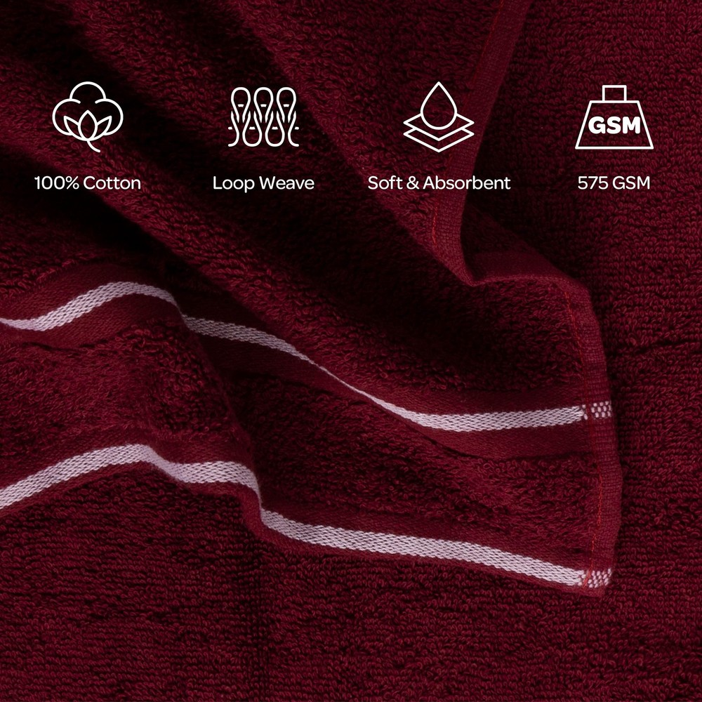 8-PIECE BATH TOWEL SET - This bathroom towel set comes with 2 towels, 2 bathroom hand towels, 2 fingertip towels, and 2 washcloths with aesthetically pleasing Egyptian cotton loops. Use the bathroom towels in your main, guest, en suite, or dorm bathroom. SOFT AND ABSORBENT - Each bath towel is made from 100% cotton, with a plush 575 GSM thickness that is soft to the touch and provides plenty of warmth, while the low twist loops allow for increased absorbency and enhanced durability for long-lasting use. QUICK DRYING - Count on the luxury bath towels for a lightweight design with quick-drying convenience that’ll look great in any bathroom. The new apartment essentials come in a variety of colors with an understated striped detail to complement any decor. MACHINE WASHABLE - Launder these shower towels at home for convenient cleaning, whether you use them at home, the gym, or the beach. Simply machine wash the towels set with like colors, do not use bleach, then tumble dry for fast, easy care. PRODUCT DETAILS - Materials: 575 GSM Cotton. Dimensions: 2 Bath Towels: (L) 53” x (W) 27.5”; 2 Hand Towels: (L) 27.5” x (W) 16.5”; 2 Fingertip Towels: (L) 18.5” x (W) 11.75”; 2 Washcloths: (L) 12.9” x (W) 12.25”. Color: Burgundy with White Stripes.