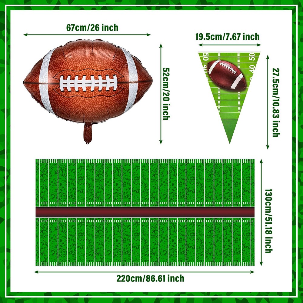 8 Pieces Football Theme Party Disposable Football Tablecloth Plastic Football Banner Football Foil Balloons Set, Football Party Balloons for Birthday Sport Football Themed Party Decoration Supplies Features: Football theme: The products are designed with cute football patterns and vivid appearance, which are good decorations for your football theme party. Wide application: The football theme party supplies set is suitable for kids, adults and football fans, and also suitable for your next sports event, tailgate party, dinner and football birthday party. Specifications: Material: as shown Color: as shown Size: Football balloon: approx. 22 inch (after inflation) Football tablecloth: approx. 137 x 274 cm/ 54 x 108 inch Quantity: 8 pieces Package includes: 4 x Football balloons 2 x Football disposable tablecloths 2 x Plastic football banners Notes: Manual measurement, please allow slight errors on size. The color may exist slight difference due to different screen display. Do not over-inflate the balloon, and keep it away from heat, fire and anything pointed. What you get: the package includes 2 pieces football tablecloths, 2 pieces football flags and 4 pieces football aluminum film balloons, enough to meet your daily use and replacement needs, suitable for football themed parties, birthday parties and team gatherings Quality material: these disposable football tablecloths are made of sturdy plastic, light and durable, not easy to fade or break; The football themed banners are made of quality paper, with bright and colorful printing; The reusable football balloons are made of aluminum foil material with good thickness, no odd smell, safe, durable and reusable Size detail: the decorative foil balloon is approx. 22 inch after being inflated, large enough for you to decorate; The football themed tablecloth is approx. 137 x 274 cm/ 54 x 108 inch, which provides large size and delicate layout to match well with various sizes of home tables, so as to prevent falling food and spilled drinks from contaminating tables Football theme party decoration: the cute football balloons are designed with football shape, which fully caters to football theme parties; The football tablecloths and banners are featured with cute patterns and vivid appearance, which will be favored by others and make your party more eye-catching Multi-purpose: the attractive football party supplies are suitable for your next sports event, tailgate party, dinner and football birthday party, and can prepare wonderful football parties for kids, adults and football fans Shipping from the USA All of our products are shipped from the USA, ensuring quick delivery to your destination. Payment We offer the following payment methods: PayPal, credit card, bank transfer, and eBay's secure payment system. Free Shipping & Free Returns Shipping within the USA is FREE. Additionally, any return is absolutely free for you. Risk-Free Purchase You have the option to return an item within 30 days without any justification. We cover the return shipping costs! Fast Shipping We ship immediately upon receipt of payment. Generally, the package is delivered within 2-3 days in the USA. If it takes longer, we will contact you. Quality and Costs Made in Europe, USA, China No customs fees or additional charges Total satisfaction guarantee Invoice with declared VAT available upon request in .pdf format Feedback Your feedback is very important to us. After you pay for your purchase, you will automatically receive positive feedback from us.