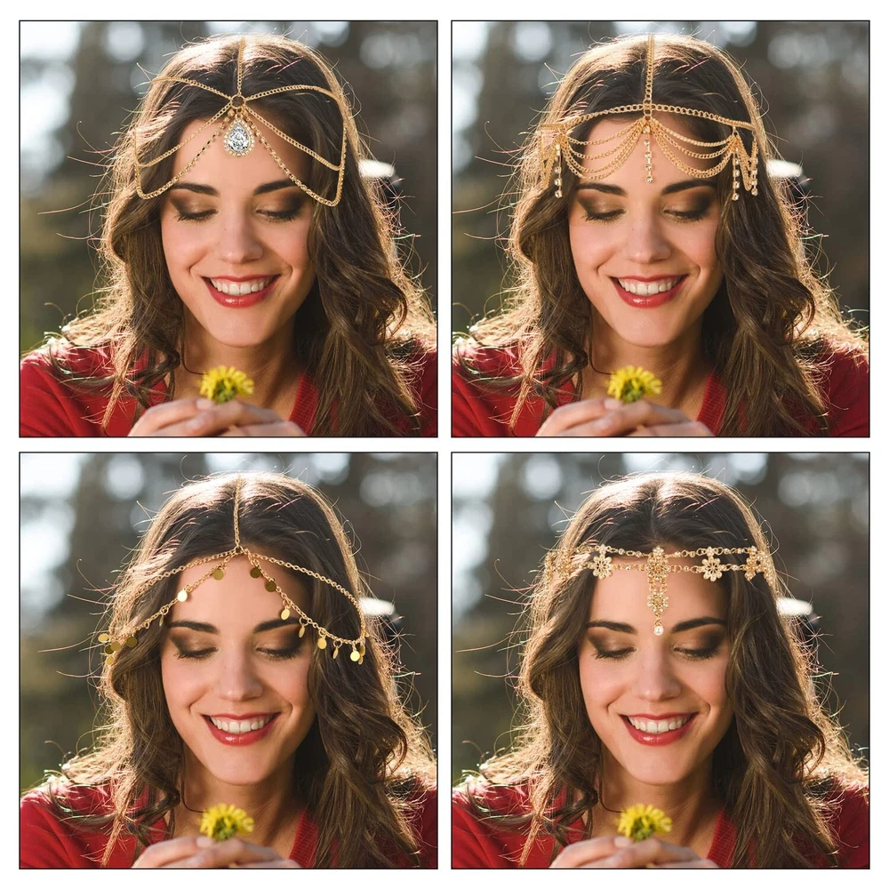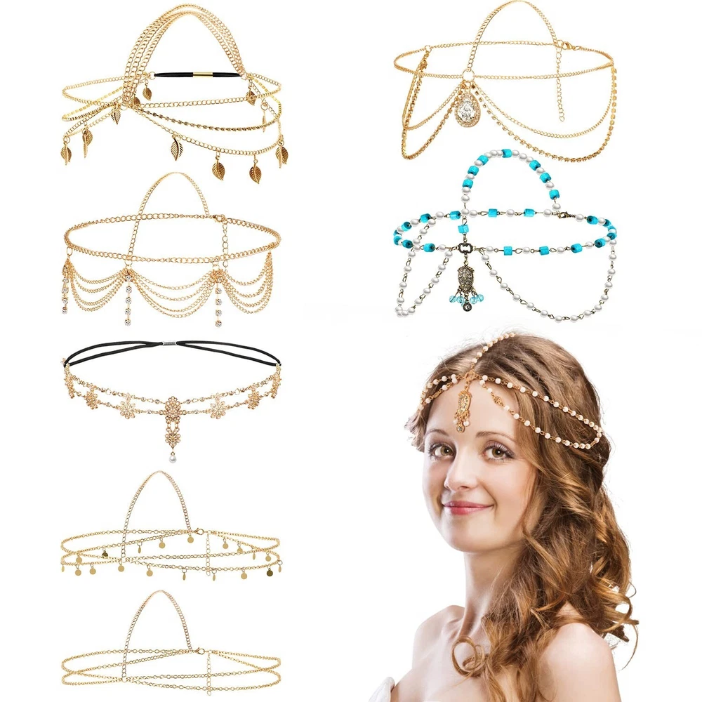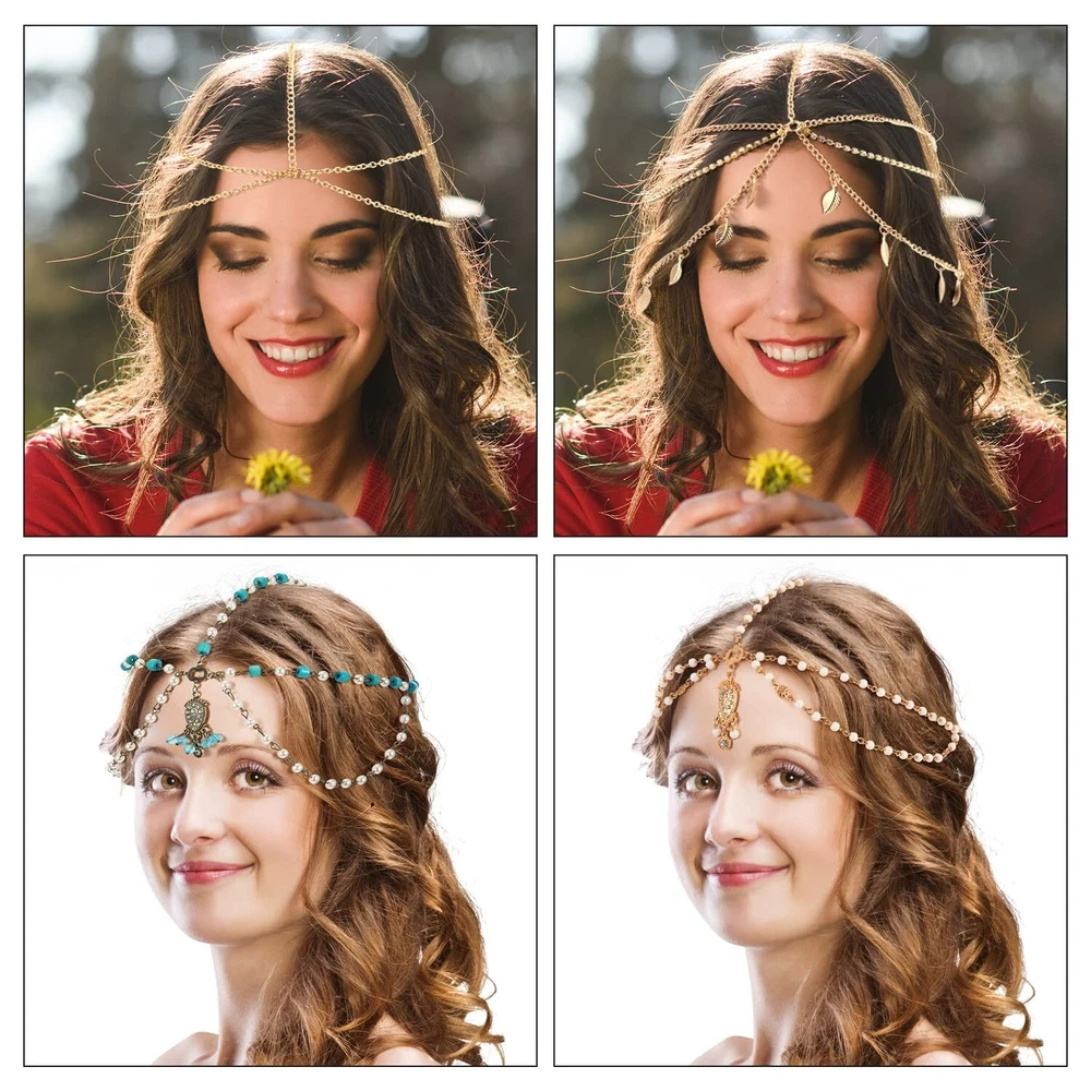 Material: these head chains are made of alloy and they have good gold plated keeping color retention; They will not fade and are safe for all skin types, so don't worried about they will rust or cause irritation Multiple style: there are 8 pieces head chains, including rhinestones, turquoise, plastic bead, pearl tassel and coins and other design elements, more choice to fit any needs with matching your outfits Adjustable hair chains: the head chain total length approx. 52 cm/ 20.5 inches, one size fits most people; You can adjust the length to suit your hairstyle; Fits anyone from 21 to 24 inches around head and easy to put on Fashion match: these multi-layered headpiece with classic and elegant design can add brilliance to your daily collocation; Nice prom accessories for attending wedding and evening party, Halloween party, fashion show, photo prom and travel costumes Adorable gift: these fashionable boho chain hair jewelry are not only beautiful prom accessories but also wonderful Thanksgiving Day gifts, Christmas gifts, New Year gifts, Birthday gifts, Mother's Day gifts to friends or family