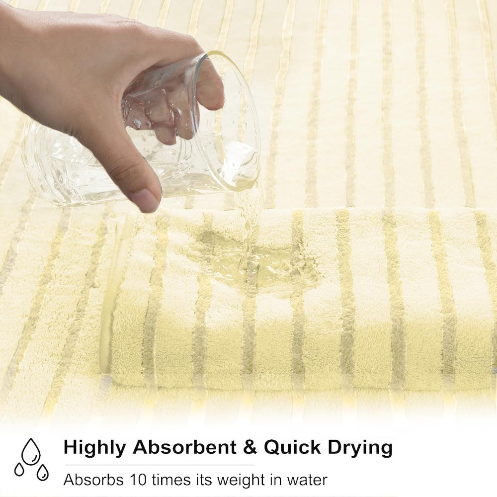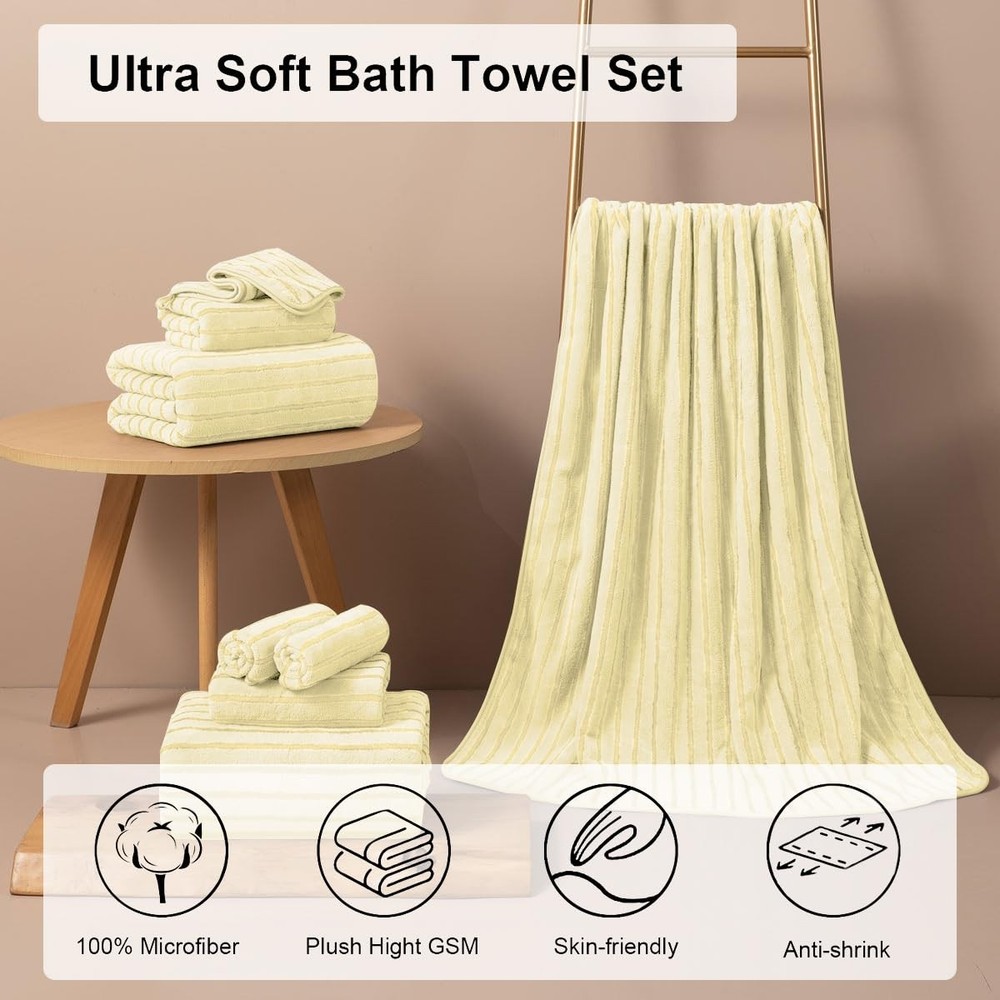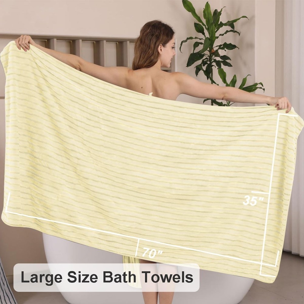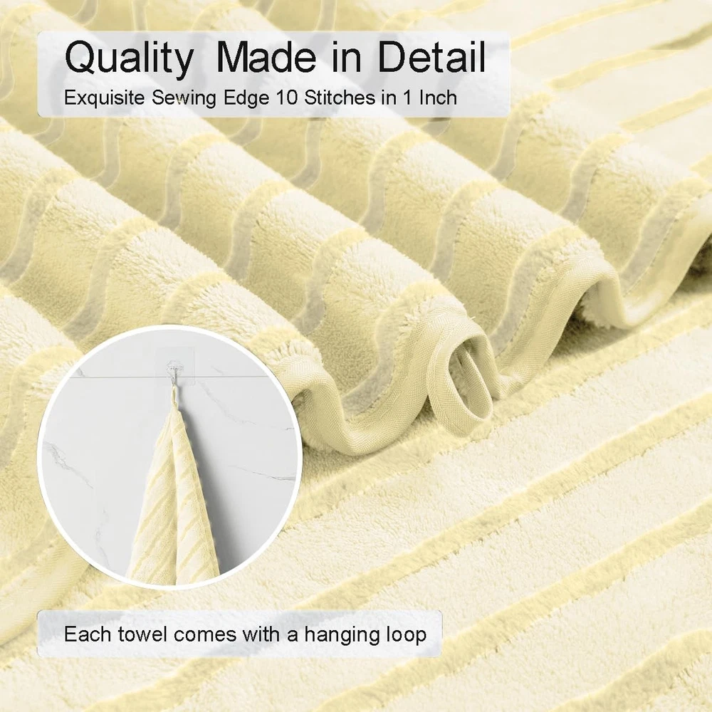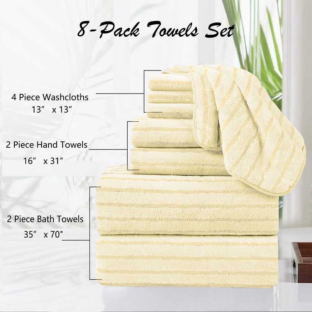 2 Piece Cabana Stripe Hand Towel Set Package Include: 2 pack 16"x31" hand towels 4 Piece Cabana StripeTowel Set Package Include: 4 pack large size 35"x70" bath towels 8 Piece Cabana StripeTowel Set Package Include: 2 pack large size 35"x70" bath towels 2 pack 16"x31" hand towels 4 pack 13"x13" washcloths Absorbent quick drying bath sheets suitable for bathroon,beach chair,sofa,spas,pools,gyms and hotel 8 Piece Cabana Stripe Towels Set:Home towels collection includes 2 pcs large bath sheets(35"x70"),2 pcs hand towels(16"x31") and 4 pcs washcloths(13"x13"). Large bath towels can good for wrapping all over,35in will chest to knee or waist to ankle,and 70in will wrap 1.5 turns. Dirt-resistant & Durable: Washcloths uses professional double-stitched edges to prevent towel deformation and tearing.The high-quality microfiber material keeps our towels soft,comfortable and durable.Also friendly to skin, people with sensitive skin can use it. Better Water Absorbent Towels:Light weight plush washcloths can dry quickly absorb moisture from your body. Soft fluffy comfort feel washcloths for your daily use,portable convenient to take it with you when exercise,swimming pool,SPA,hot springs,camping, or GYM.For personal care and beauty, such as drying hair,wash face,sports towel, camping towel or pet towel.Also be used as a rag or dish towel. Hanging Loop Towels Set:Our towels are come with a small hanging loop on the side for easy hanging to dry or to hang up for use. Especially suitable for hanging on the door or wall hooks in bathrooms, kitchens, hotels, so that it can be used anytime and anywhere. Care Instruction:Recommended that you change the towels every 3 months for your health.Wash before use,Machine wash in cold,Tumble dry low,Do not iron,keep ventilated and dry.This towel can be washed and reused hundred of times which remain soft after multiple wash and dry cycles.