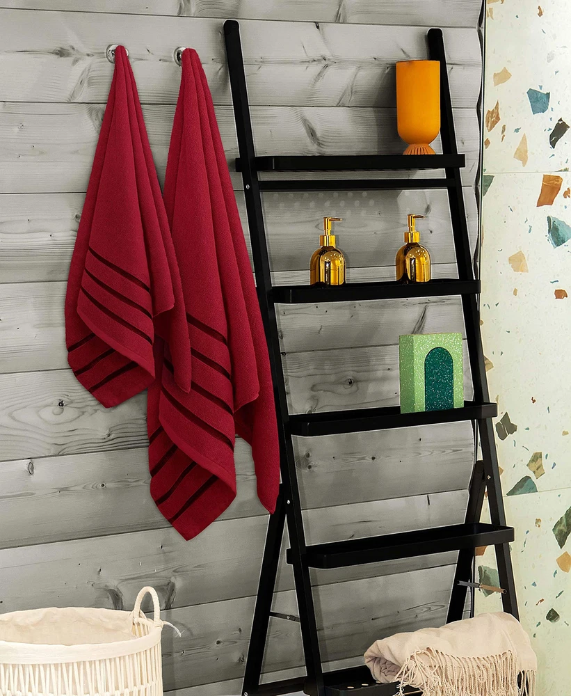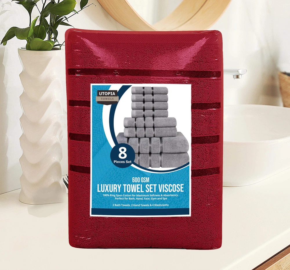 Set of 8 Towels - Includes 2 bath towels, each measuring 27 x 54 inch; 2 hand towels, each measuring 16 x 28 inch and 4 washcloths, each measuring 12 x 12 inch Highly Absorbent Towels - Our 600GSM high density towels are ultra-absorbent and fast drying. Gives your skin a soft and delicate touch while absorbing all traces of moisture efficiently 97% Cotton , 3% Viscose - These luxurious towels are made of 97% cotton & 3% Viscose giving you a super soft feel every time you use them. The surface is smooth and not easy to shed, adding to their durability Elegent Stripe Design - Elegantly designed viscose woven stripes have a brilliant shine and add to the luxurious look of the towels. They are sure to give your bathrooms, spas and kitchen a touch of sophistication Care Instruction - Machine wash the towels in cold water using delicate detergent and tumble dry on low setting; recommended to dry immediately. To prevent unforeseen color discoloration, it is advised, to avoid the removal of the application of any form of cosmetics, facial creams, or scrubs directly with the towel.