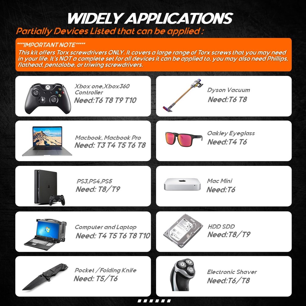[Small Torx Screwdrivers Tool Set]: The new TEKRREM small, complete Torx screwdriver set includes T3, T4, and T5 Torx screwdrivers, as well as T6, T7, T8, T9, and T10 security Torx screwdrivers. This compact and convenient tool kit comes neatly packed in a plastic zip-lock bag, ensuring easy storage. [Hardened S2 Steel Torx Screwdriver Bits]: All Torx bits are crafted from hardened S2 steel, providing exceptional durability and strength for daily use. These bits are precisely designed to fit and remove small Torx screws effortlessly. [A MUST-HAVE Torx Set]: The bit shafts are 2.16 inches (55mm) long, making them ideal for screws located in deep holes. This set is suitable for use with Xbox One, Xbox 360 and controllers, MacBook, Mac Mini, PS3, PS4, computers, laptops, electronics, smartphones, small devices, folding knives, and more. [Magnetic Torx Screwdrivers]: The precision Torx screwdrivers are magnetic, making it easy and convenient to pick up tiny screws. [Non-slip Handle]: These Torx screwdriver handles are made of plastic with TPR and PP materials. They feature an ergonomic grip for repeated use and a swivel cap for convenient handling.