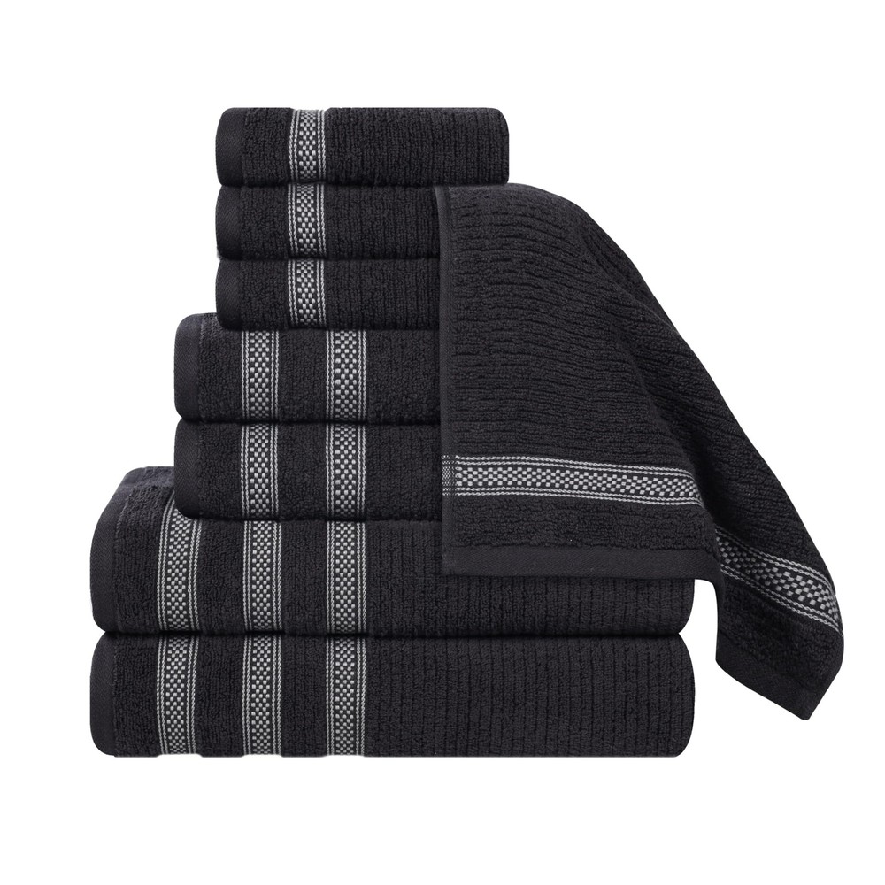 OPULENT COMFORT: Crafted from naturally strong and soft Cotton; smooth loops of Zero Twist towels make them softer, more absorbent, and more luxurious than regularly twisted towels; Set includes: 4 face towels/ washcloth, 2 hand towels, and 2 bath towels WHIMSICAL DESIGN: Each solid towel is finished with a ribbed with delicate geometric border for added style and elegance; excite any master bath, powder room, or guest bathroom with this beautiful bundle; hanging loop allows you to easily hang each towel GORGEOUS STYLE: Elegantly drape these towel in your choice of a delightful range of classy colors: Gold, Rust, Stone, Black, White, Ivory, Grey, Forest Green, Navy Blue; matches Modern, Casual, Traditional, or Transitional bathroom decor EFFORTLESS CARE: For the most luxurious results, we recommend to wash with like colors, tumble dry low, and remove promptly from the dryer. Please follow care label instructions for best results. EXCELLENT GIFT: Our designs match a variety of styles and make great gifts; perfect for friends and family; we're committed to make products safer for you and safer for the world; this product is OEKO-TEX certified for safety and sustainability