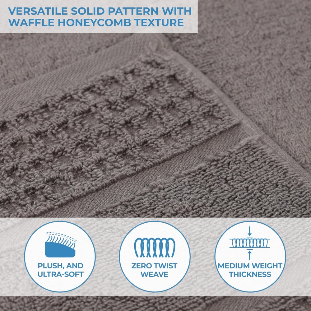 OPULENT COMFORT: Crafted from naturally strong and soft Cotton; smooth loops of Zero Twist towels make them softer, more absorbent, and more luxurious than regularly twisted towels; Set includes: 4 face towels/ washcloth, 2 hand towels, and 2 bath towels WHIMSICAL DESIGN: Each solid towel is finished with a waffle honeycomb textured pattern for added style and elegance; excite any master bath, powder room, or guest bathroom with this beautiful bundle; hanging loop allows you to easily hang each towel GORGEOUS STYLE: Elegantly drape these towels in your choice of a delightful range of classy colors: Denim Blue, Rust, Charcoal, Chocolate, White, Ivory, Stone Grey, Forest Green, Yellow Gold; matches Modern, Casual, Traditional, or Transitional decor EFFORTLESS CARE: For the most luxurious results, we recommend to wash with like colors, tumble dry low, and remove promptly from the dryer. Please follow care label instructions for best results. EXCELLENT GIFT: Our designs match a variety of styles and make great gifts; perfect for friends and family; we're committed to make products safer for you and safer for the world; this product is OEKO-TEX certified for safety and sustainability