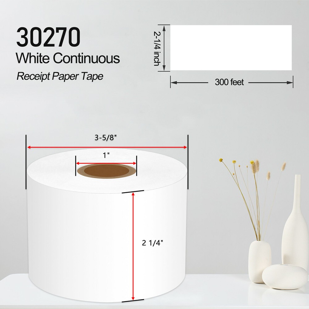 Item Description 30270 White Continuous Non-Adhesive Receipt Paper Label Compatible for Dymo 2-1/4" x 250'(57mm x 76m) High quality bright white direct thermal paper Direct thermal printing process, so there's no need for messy, expensive ink or toner cartridges. Packed in rolls, so you can print one label or hundreds with ease. Office Labels compatible products is your best option for high quality, affordable labels. For use with all DYMO LW printers: Dymo Label Writer Printers:300, 310, 315, 320, 330, 400, 400 Duo, 400 Twin Turbo, 450, 450 Duo, 450 Turbo, 450 Twin Turbo, 4XL, EL40, EL60, SE300, SE450, CoStar LabelWriters: XL, XL+, BC, BC+, TURBO, SE200, SE250, ACII 200 / ASCII 25