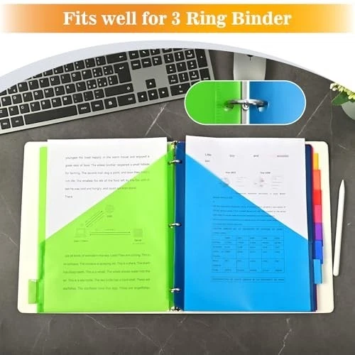 Organize Your Documents with Ease Transform your binder into a well-organized and efficient system with our versatile dividers. Designed to enhance your productivity, these dividers are perfect for home, school, or work. Fits Well for 3 Ring Binders These dividers come with 3 holes punched, making them compatible with standard 3-ring binders. They easily load into any binder size, whether it’s 0.5", 1", 2", 3", 4", or 5". Keep your binders neat and presentable while protecting your important documents. Multicolor Tabs for Quick Access Featuring 8 pre-labeled multicolored tabs, these dividers allow for effortless categorization of your documents. The large, clear labels make it simple to find what you need quickly, helping you stay organized even in a busy lifestyle. 8-Tab Dividers with Two Side Pockets Each divider includes pockets on both the front and back, providing a reliable solution for storing loose papers, notes, or other essentials. The easy categorization through tabs combined with additional storage makes organization a breeze. Durable Plastic Dividers Crafted from high-quality materials, these dividers are strong and sturdy enough to withstand frequent use. They ensure that your important documents remain safe and secure over time. Stay Organized The bright colors of these dividers not only enhance the aesthetic of your binder but also allow for quick identification of subjects at a glance. Each divider includes two pockets ideal for storing papers, printables, homework, tests, or reports—offering a professional and tidy appearance.
