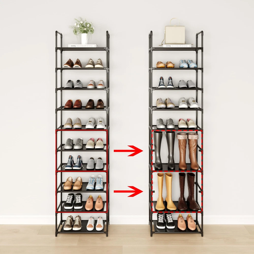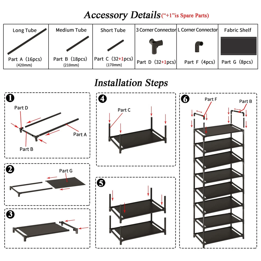 【Large Capacity&Multifunctional】The 8-Tier narrow shoe rack stores up 16-20 pairs of shoes and the partition cloth is waterproof dustproof and oil-proof.This shoe organizer is not only suitable for shoes, but also for bags, toys, towels, sundries, books, plants and small accessories. 【Space Saving Narrow Shoe Shelf】Dimension:18" W×10" D×58" H ,With a height of 7.2 inches between layers.The simple structure and light weight make the narrow shoe rack in the closet,hallway, living room, or bedroom,entryway, foyer,dormitory, patio, garage, etc. 【DIY&Expandable】With this 8-layer shoe tower, you can split into the number of layers you need, such as 3+5 layers or 4+4 layers.Remove one layer to fit boots, high heels or larger accessories. 【Thickened Material】The tall shoe rack is made of durable waterproof non-woven fabric layers, reinforced plastic connectors and thickened metal tubes,The Non-woven fabric is waterproof, dust proof, easy to clean, and has a good load-bearing capacity. 【Easy to Assemble】No tools required,large shoe shelf provides detailed installation instructions, so that you can assemble it more quickly. 【Worry-free service】Any quality problem with product,replace it with a new one for free or get a .