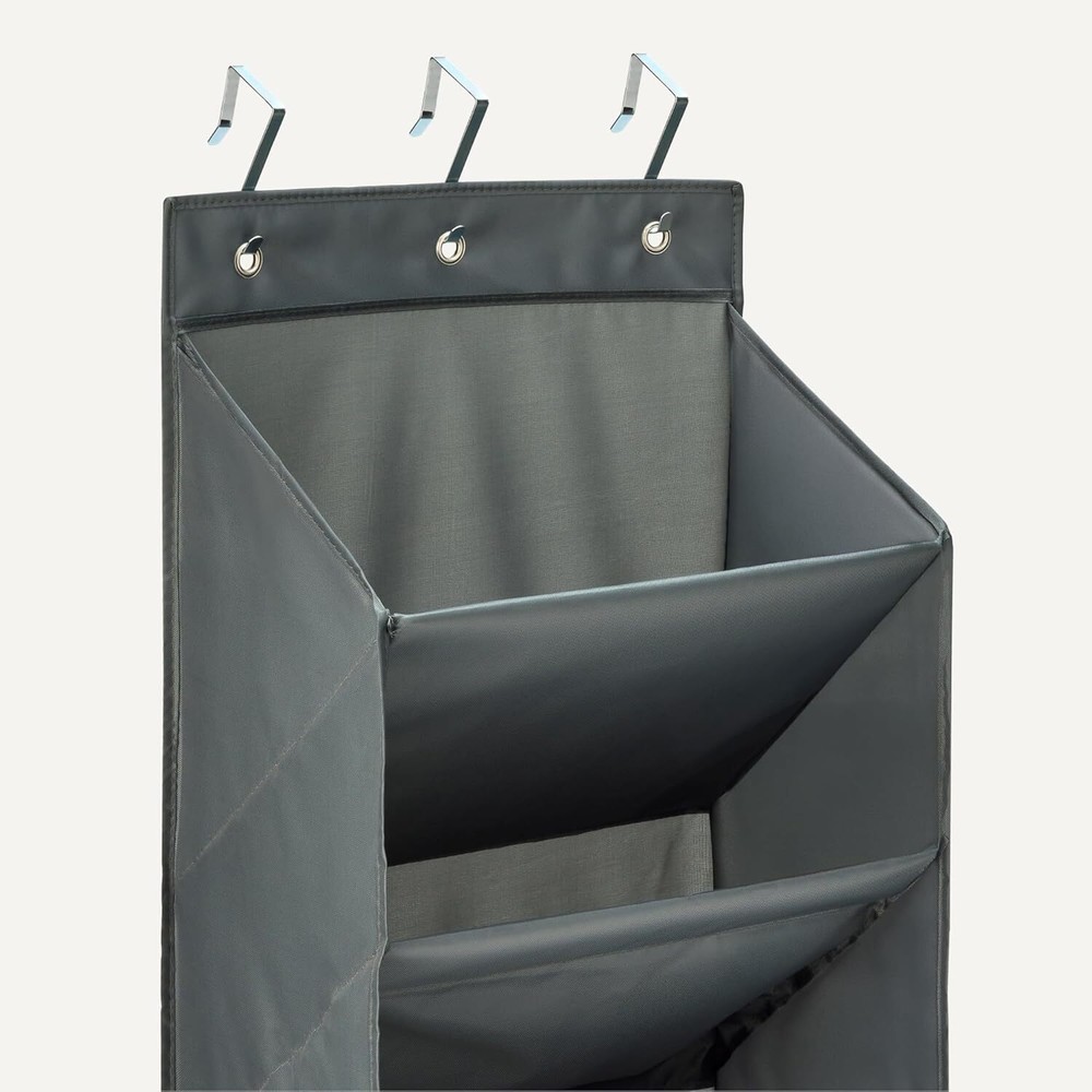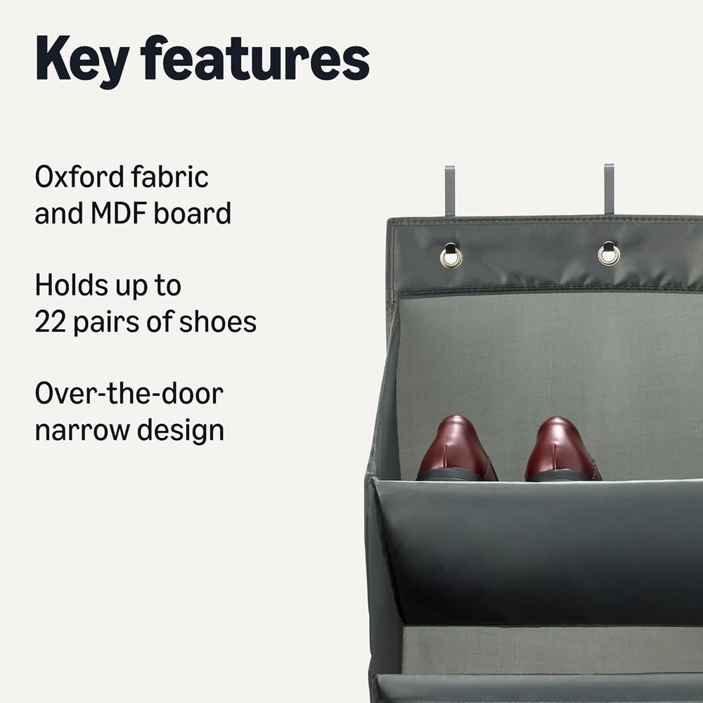 LARGE CAPACITY: Holds up to 20-22 pairs of shoes with 8 spacious tiers QUALITY MATERIALS: Constructed with durable oxford fabric and MDF board for lasting use PERFECT FIT: Each pocket measures 16.7"W x 9"D x 7"H to accommodate various shoe sizes SPACE SAVER: Slim profile design ideal for closets, dorms and small spaces EASY INSTALLATION: Includes over-the-door hooks for quick setup with no tools required This product is large and bulky. Please ensure your doorway has adequate inner space and check upper door clearance for hooks