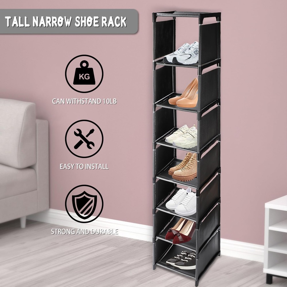 Tall Narrow Shoe Rack for Front Door Entrance Vertical Shoe Rack for Small Spaces Slim Shoe Organizer for Entryway Shoe Tower Skinny Shoe Shelf for Closet Vertical shoe rack: Open shoe rack for your shoes to provide convenient storage, single-layer vertical design, effectively save space. It is ideal for narrow Spaces such as room entrances, wardrobes, dormitories, living rooms and bedrooms Flexible assembly:Our shoe racks are assembled flexibly and can be stacked or placed in a single layer to meet your specific needs. One pair of shoes can be placed on each layer,which helps you to sort different types of shoes Easy installation:The shoe rack is easy to install and easy to disassemble,you can freely assemble and can also be reused. Can store everyday items,such as books,towels,small bags,etc Strong and durable:The shoe frame is composed of high-quality stainless steel pipes and waterproof non-woven fabric,which is stable and durable. The cloth on the side of the shoe rack can prevent shoes from falling,which can better protect your shoes After sale:If you are not satisfied with our products, please feel free to contact us, we will provide you with a solution within 24 hours