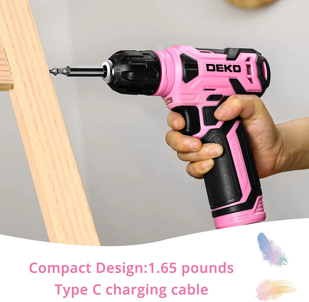 【Efficient Drilling&Screwing】This electric drill may be used for drilling in wood and plastic(Not suitable for hard objects such as masonry and concrete), and also for tightening/loosening screws. Equiped with built-in LED light, suitable for DIY and home maintenance 【Variable Speed Control Trigger】Press the switch to adjust the speed of the electric drill, and the maximum no-load speed of the mini drill is 800 r/min. The harder you press, the faster the rotation speed. The chuck will stop as soon as the trigger is fully released 【Forward/Reverse Switch】A forward/reverse switch determines the direction of the power drill and also serves as a lock-off button. Maintenance and Cleaning Before any work on the machine as well as during storage, set the rotational direction switch to the center position 【Lightweight But Powerful】The net weight of the hand drill is only 1.65 pounds, and it is easy to operate with one hand. The motor is powerful and runs smoothly, providing continuous power for the electric drill.Good choice for Women,ladies and girls 【Accessories】Our drill kit include 8 V Cordless Drill*1, Type-C Charge Cable*1 and 42 Pcs Accessories: Torpedo Level*1, Connector*1, Expansion screw cap*10, Expansion screw*10, Drilling bits*10 and Fastening bits*10. Product Description