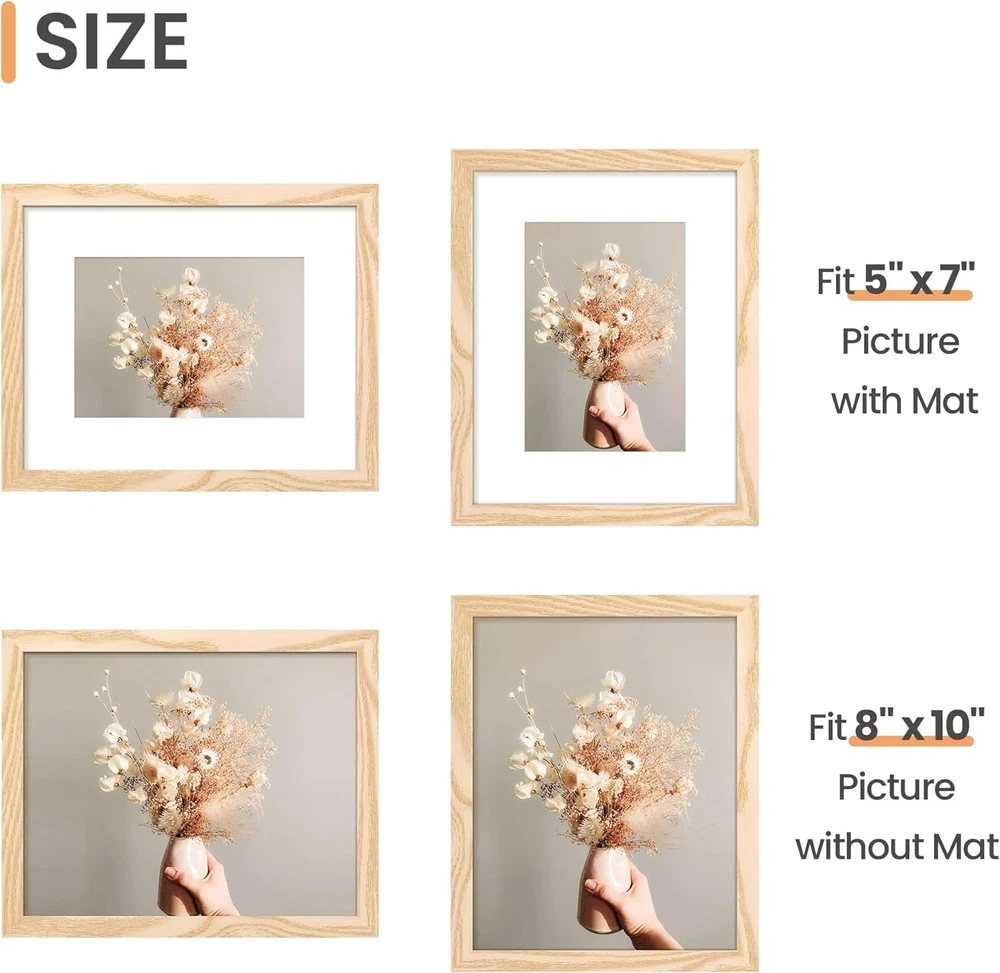 MULTIPLE FRAMES COLLAGE: Bulk of 5 pieces Picture Frames set in the same Sizes. Perfect for Pictures 5x7 with Mat or 8x10 Without Mat. The frame opening display size will be 0.5 in smaller than the photo to hold the photo in place SAFE MATERIAL: These frames are light but firm, have HD plastic cover. When they fall to the ground, you won't worry about hurting the kids EASY MOUNTING: Spring type action to remove the backing, can be hung horizontally or vertically GIFT& BE MERRY: Our 8x10 frame set not only the simple yet classic design for any home or office decor, but also a heartfelt gifts for everyone INTACT PARTS AND PACKING: The frames are wrapped very carefully to ensure safe shipping. You don't have to worry about receiving damaged products Product Description upsimples Picture Frames set of 5 made a simple and classic design for any home or office decor. 1 Small Size Description 2 Medium Size Description 3 Large Size Description Multiple Color Options and Combinations, Perfect and Ideal Gift. 1 White 2 Black 3 Gold 4 Brown 5 Natural Hanging Hook Hanging hook for displaying vertical or horizontal. HD Plastic Cover Lightweight and provide a clear display. Please peel the protective film on both sides before use. Sturdy Plastic Frame The picture frame is sturdy, durable and sleek. Spring Clip Spring clip for adding picture easily. Trace Family History Photo frames do more than just keep the beautiful moments. They are a gallery of a family's collective memory, each one telling its part of a larger story that is continually unfolding. Through them, families can keep a tangible record of their past and trace their history." More upsimples Picture Frames for Choice Add to Cart Add to Cart Add to Cart Add to Cart Add to Cart Add to Cart Add to Cart Customer Reviews 4.5 out of 5 stars 22,343 4.5 out of 5 stars 65,790 4.6 out of 5 stars 23,267 4.6 out of 5 stars 19,630 4.6 out of 5 stars 15,793 4.2 out of 5 stars 3,045 4.6 out of 5 stars 5,515 Price $5.39 $ 5 . 39 $17.99 $ 17 . 99 $23.99 $ 23 . 99 $22.99 $ 22 . 99 $29.99 $ 29 . 99 $27.99 $ 27 . 99 $23.99 $ 23 . 99 More Size Meet Choice 4x6 ~ 20x24 8x10 ~ 18x24 4x6 ~ 12x16 4x6 ~ 16x16 8x10 ~ 18x24 11x14 ~ 27x40 8.5x11 Cover Material Plastic Plastic HD Glass HD Glass Plastic Plastic HD Glass Frame Material Plastic Plastic Plastic Plastic Plastic Plastic Plastic Used For Photo, Poster, Print Photo, Poster, Print Photo, Picture, Print Photo, Picture, Print Poster, Print, Photo Poster, Print, Photo Certificate, Diploma, Photo Quantity 1 Pack 5 Pack 10 Pack 3 Pack 2 Pack 3 Pack 5 Pack