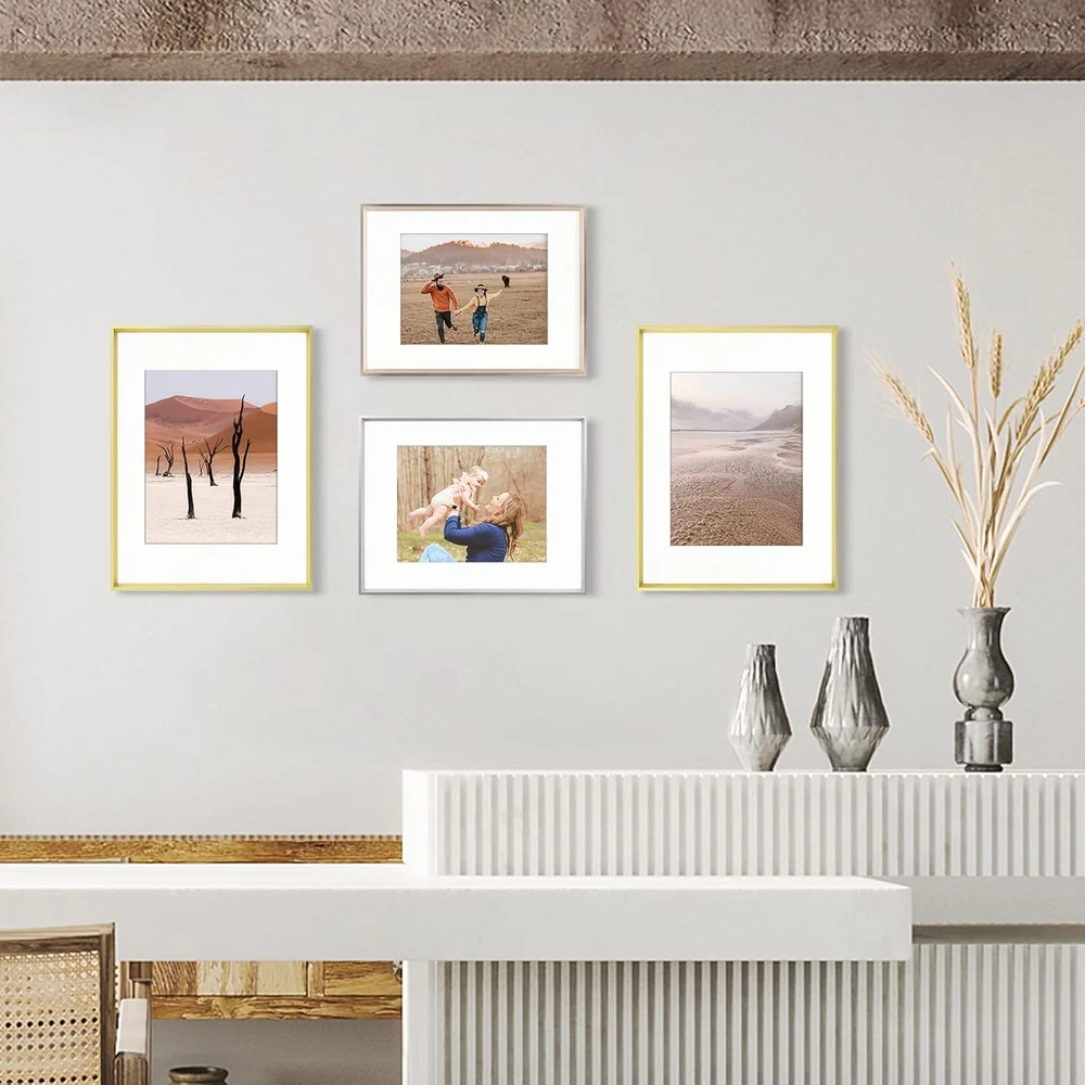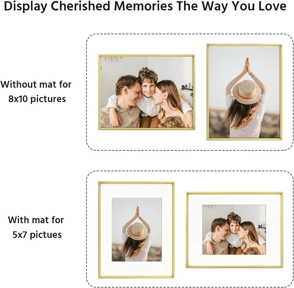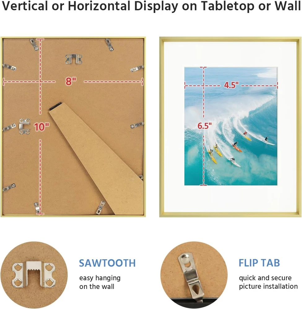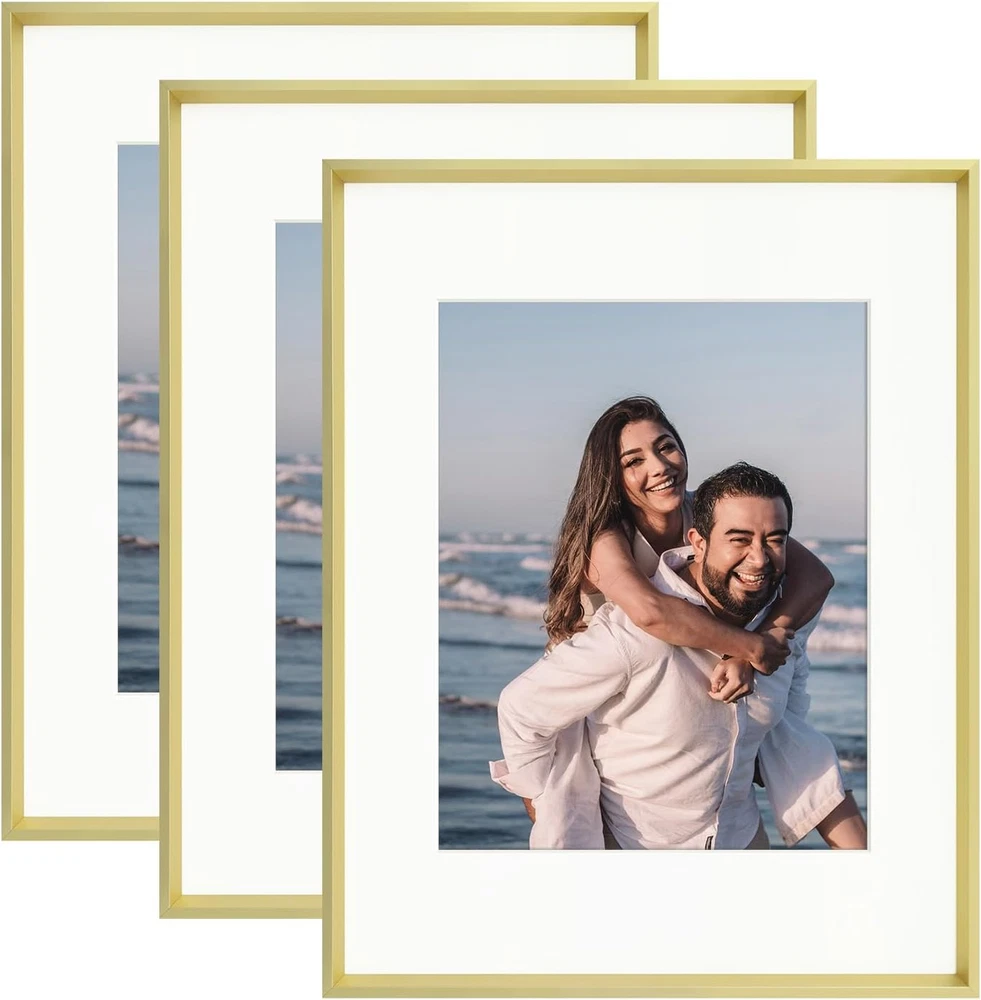 Cover Material: Acrylic Mounting Type: Wall or Tabletop Size: 8x10, 3-Pack gtin13: 705353667022 UPC: 705353667022 Orientation: Horizontal or vertical Finish Type: Brushed Product Dimensions: 10"L x 8"W Special Feature: Matted, Lightweight, Easel Back, Tarnish Resistant, Water Resista Theme: Wok with any kinds of themes Batteries required: No Product Care Instructions: Wipe With Dry Cloth Item Length: Does not apply Occasion: Grandparents Day Mother's Day Father's Day, Christmas Thanksgivin Shape: Rectangular Pattern: Solid Back Material Type: Cardboard Type: Does not apply Frame Type: Gallery Wall Frame Item Width: Does not apply Brand: Does not apply Item Height: Does not apply Item Weight: 2.31 pounds Frame Material: Metal Style: Modern Color: Gold Target Audience: Adult Unit Count: 3.0 Count Finish types: Brushed Number of Items: 3
