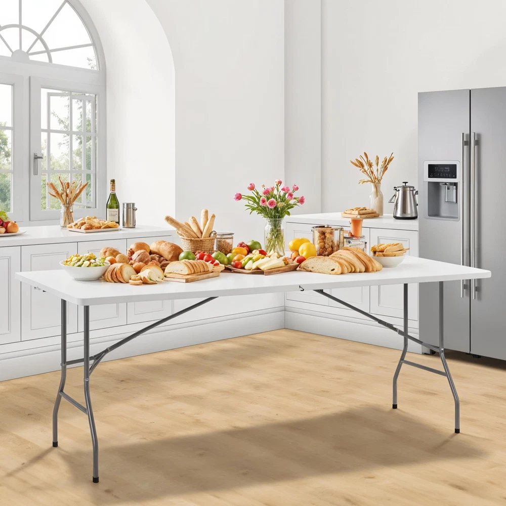 About this item Multi-Purpose Functionality: This versatile table transitions seamlessly between indoor dining or gaming and outdoor events like weddings, camping, or picnics Stable Construction: With a durable frame lock structure and anti-slip coated legs, this table offers exceptional stability and supports up to 300 lbs Convenient & Portable Design: Designed for fast setup and compact folding, this table includes a built-in carrying handle for easy transport and storage. Perfect for camping, picnics, and parties Easy-to-Clean: Made from water-resistant HDPE, the table’s surface is abrasion-resistant and easy to clean Space-Saving & Pre-Assembled: No tools required! Simply unfold the table and attach the legs. When not in use, fold it up for compact storage and space saving. Dimension: 94.49"D x 29.92"W x 29.13"H/ 47.24"D x 29.92"H (Folded)