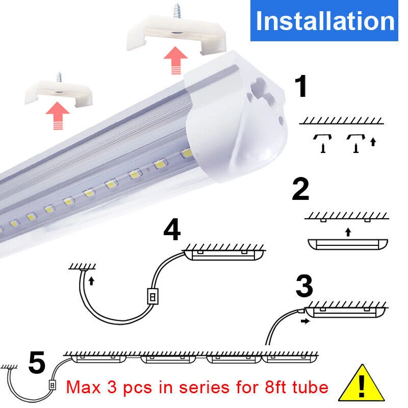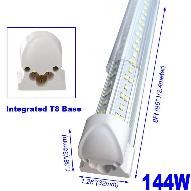 FAST DELIVERY - Ship from New Jersey or Los Angeles Warehouse via FedEx , 3-7 Days Delivered Your Door . SCIENTIFIC DESIGN - 8Ft LED Shop Lights Fixture is Made of 6500K Cold White SMD2835 LED Chip ,Plastic Clear Cover , Aluminum Bracket Housing ,and AC85-277V Constant Current Driver . It can work in -68F to 120F Temperature Conditions EASY INSTALLATION - The Integrated Tube Fixture Can be Install on Wall or Ceiling ,Easily Replace Traditional Fluorescent Tube Bulb . Plug and Play , Free Accessories (Power Cords, Connector , Extension Cords , Clip and Screw ) Come with Tube Lights Together WIDE APPLICATION - Linkable 8Ft Bulbs Widely Used in Garage Ceiling , Barbershop , Schools, Hospitals Basement , Factory Warehouses , Supermarkets Cooler Door , Offices, Shops,Hotels, etc 8ft LED SHOP LIGHT V-SHAPE 144W 6500K LED Tube Light Linkable Ceiling 12PC FAST DELIVERY - Ship from New Jersey or Los Angeles Warehouse via FedEx , 3-7 Days Delivered Your Door . SCIENTIFIC DESIGN - 8Ft LED Shop Lights Fixture is Made of 6500K Cold White SMD2835 LED Chip ,Plastic Clear Cover , Aluminum Bracket Housing ,and AC85-277V Constant Current Driver . It can work in -68F to 120F Temperature Conditions EASY INSTALLATION - The Integrated Tube Fixture Can be Install on Wall or Ceiling ,Easily Replace Traditional Fluorescent Tube Bulb . Plug and Play , Free Accessories (Power Cords, Connector , Extension Cords , Clip and Screw ) Come with Tube Lights Together WIDE APPLICATION - Linkable 8Ft Bulbs Widely Used in Garage Ceiling , Barbershop , Schools, Hospitals Basement , Factory Warehouses , Supermarkets Cooler Door , Offices, Shops,Hotels, etc